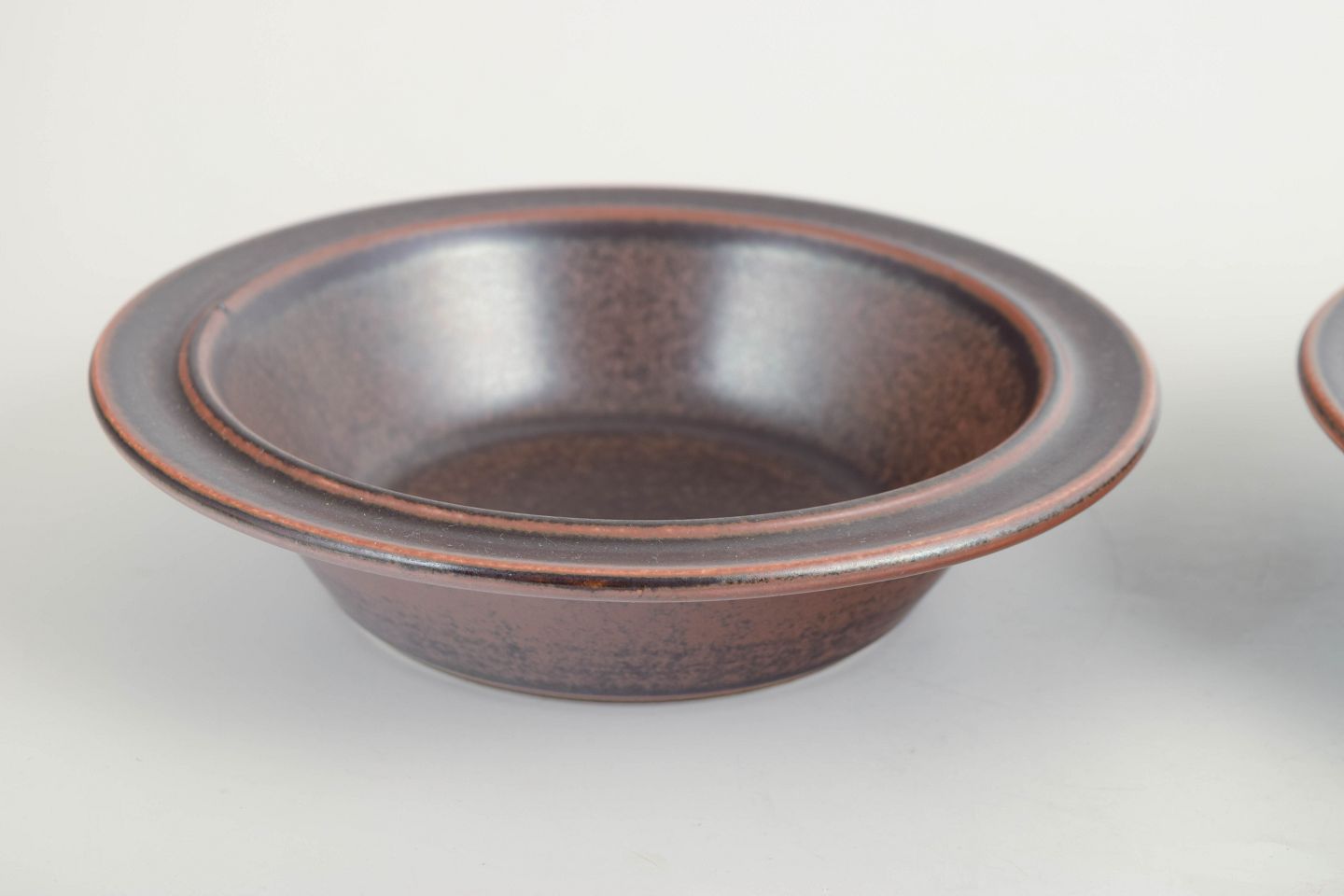 To dybe tallerkener i mørkebrunt stentøj fra Arabia’s ikoniske “Ruska”-serie, kendt for sin robuste chamotte-krop og den karakteristiske, varierende matbrune jernglasur.