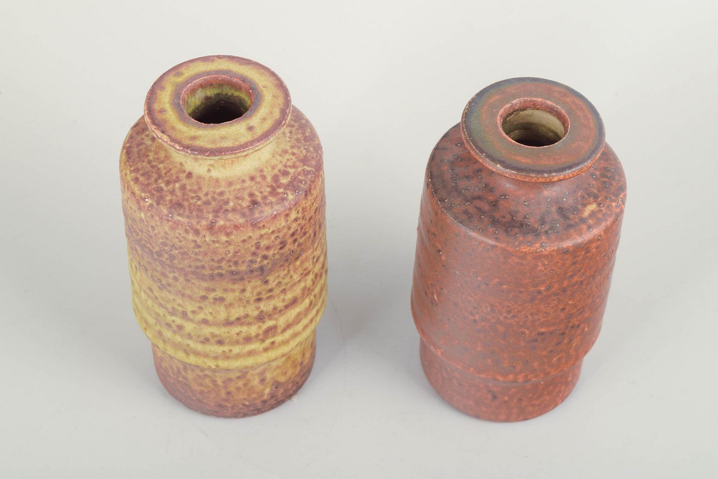Par af hånddrejede stentøjsvaser med karakteristisk Mobach-tekstur og mat, nuanceret glasur i henholdsvis gule og rødbrune toner. De cylindriske former og den taktile overflade er typiske for værkstedets modernistiske udtryk.