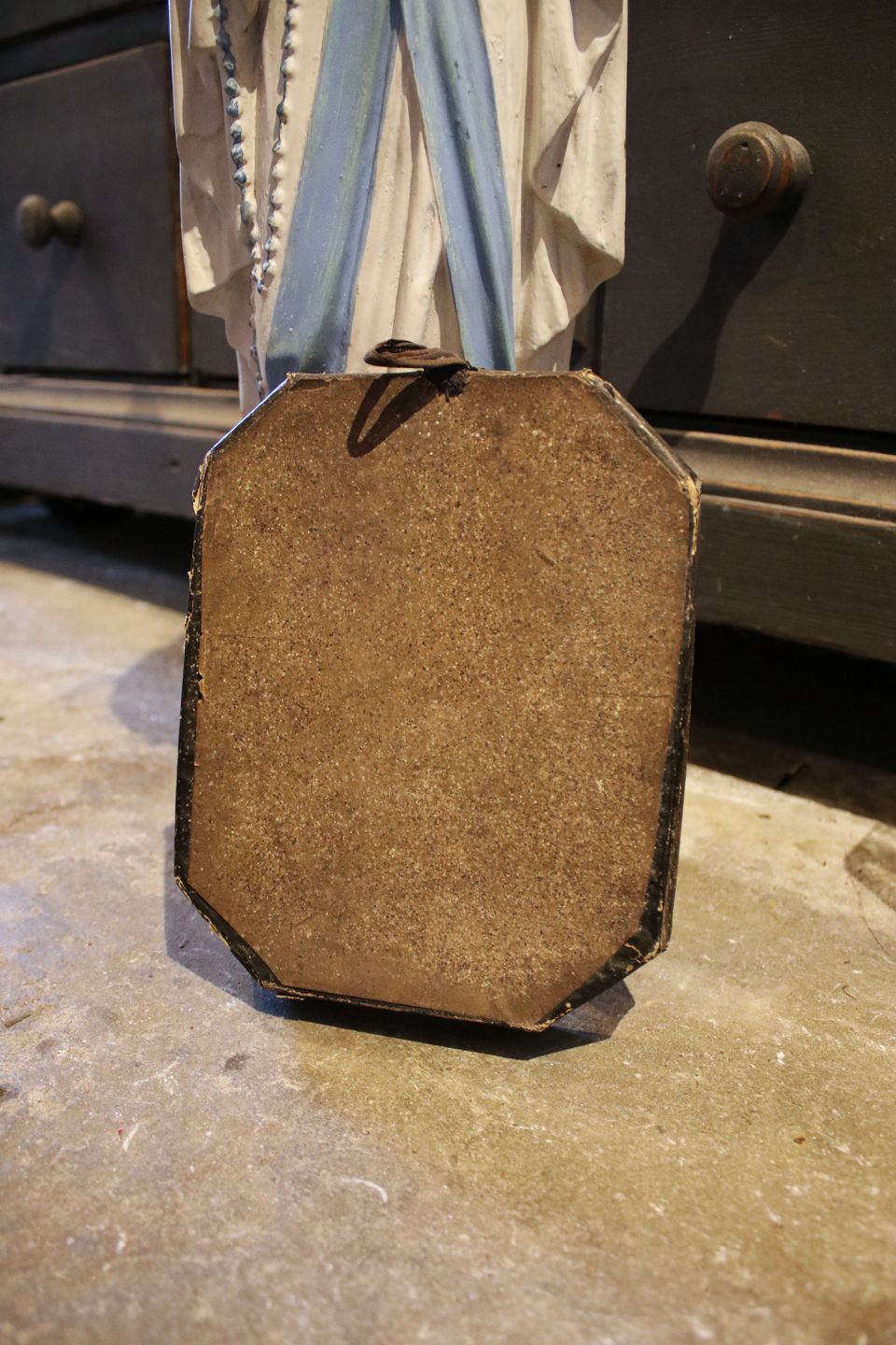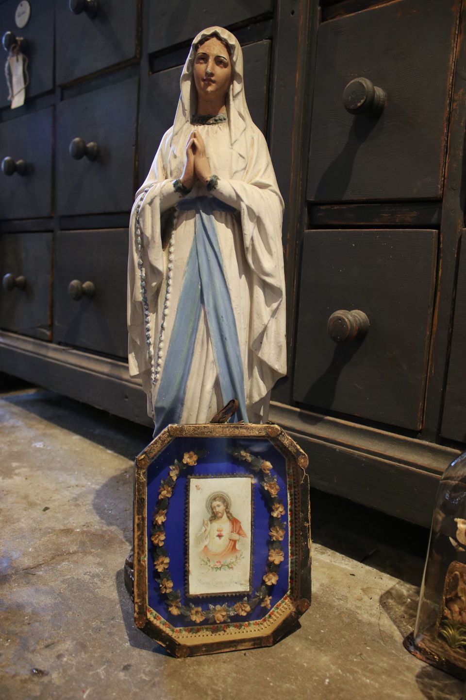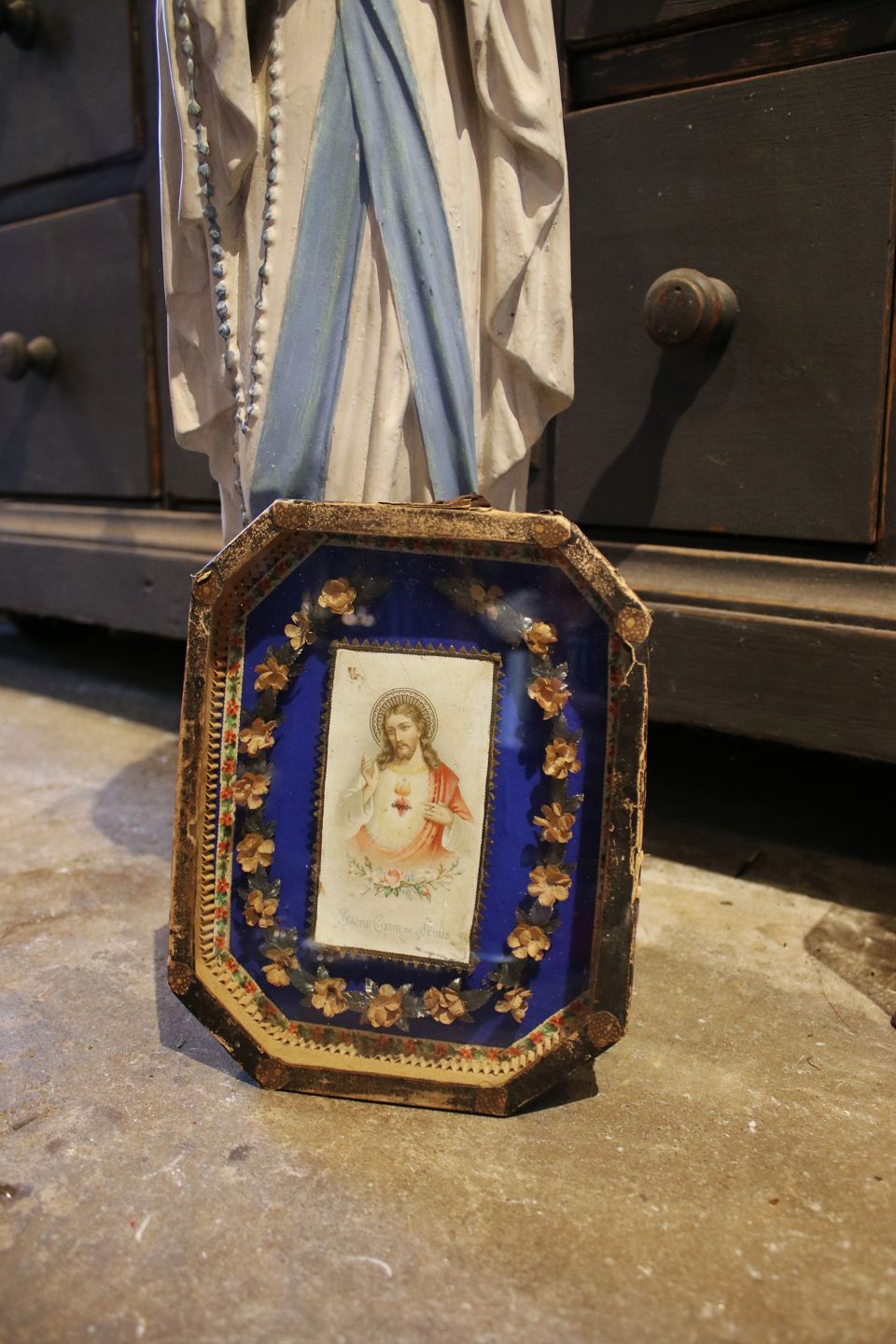 Dekorativt , gammelt religiøst billede ( med glas ) med Jesus billedeog fin blomster krans i stof. Måler: 20,5 x 16,5cm. Dybde: 3cm.