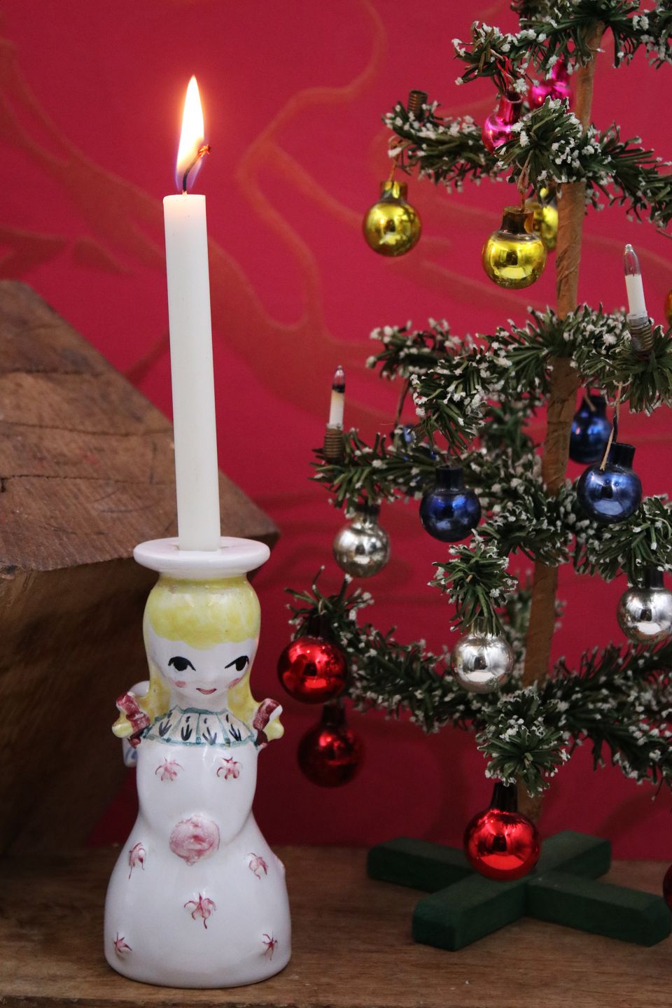 Nymølle jule engel med gult hår i fajance med pladstil lille grangren eller stearinlys i toppen. H: 12cm.