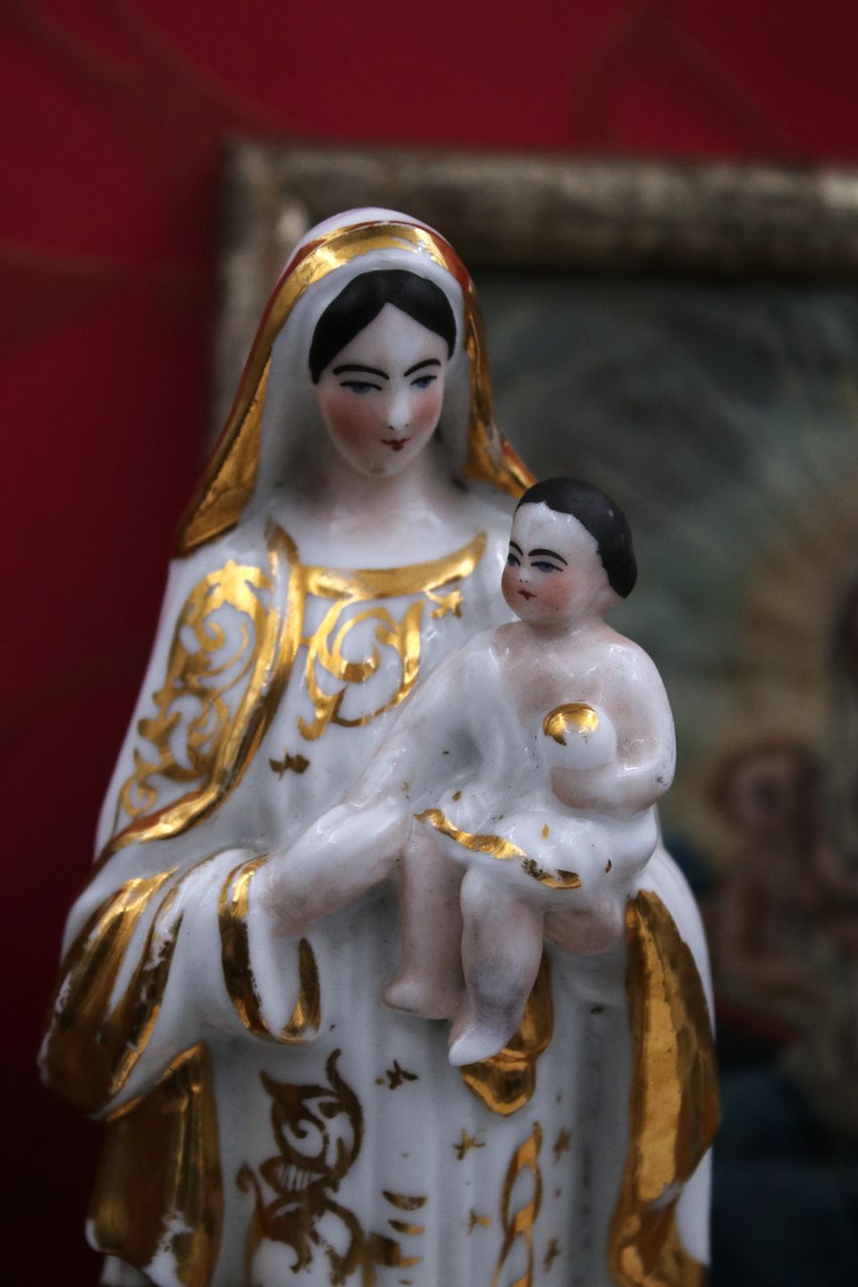 Dekorativ , gammel Madonna figur i porcelæn af Jomfru Maria med Jesusbarnet. Højde: 22cm.Emne nummer: Lille Madonna figur nr.1