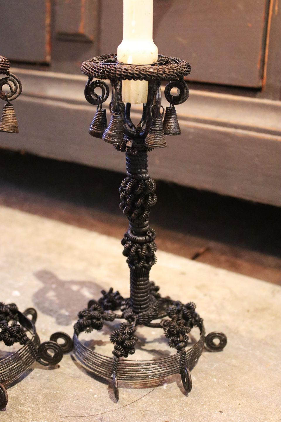 Et par antikke lysestager i Fil de Fer (metal arbejde) med en rigtig fin mørk patina. H: 21cm.Emne nummer: Antikke fil de fer stager.