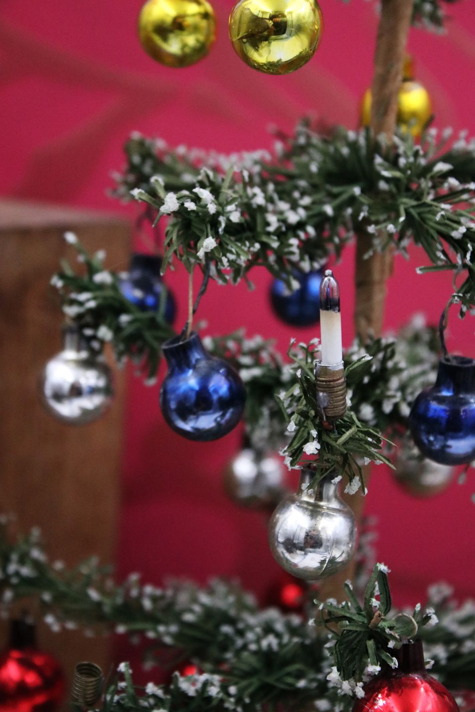 Antikt miniature juletræ , lavet i farvet papir og dekoreret med masser af små farvet jule glas kugler. Højde: 35cm.Emne nummer: Miniature juletræ