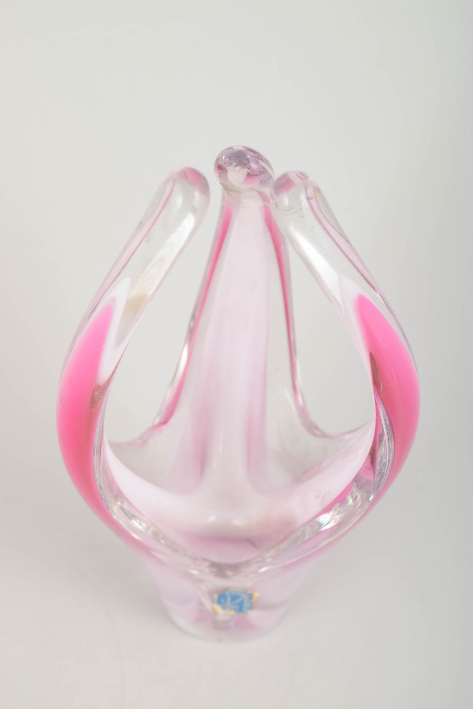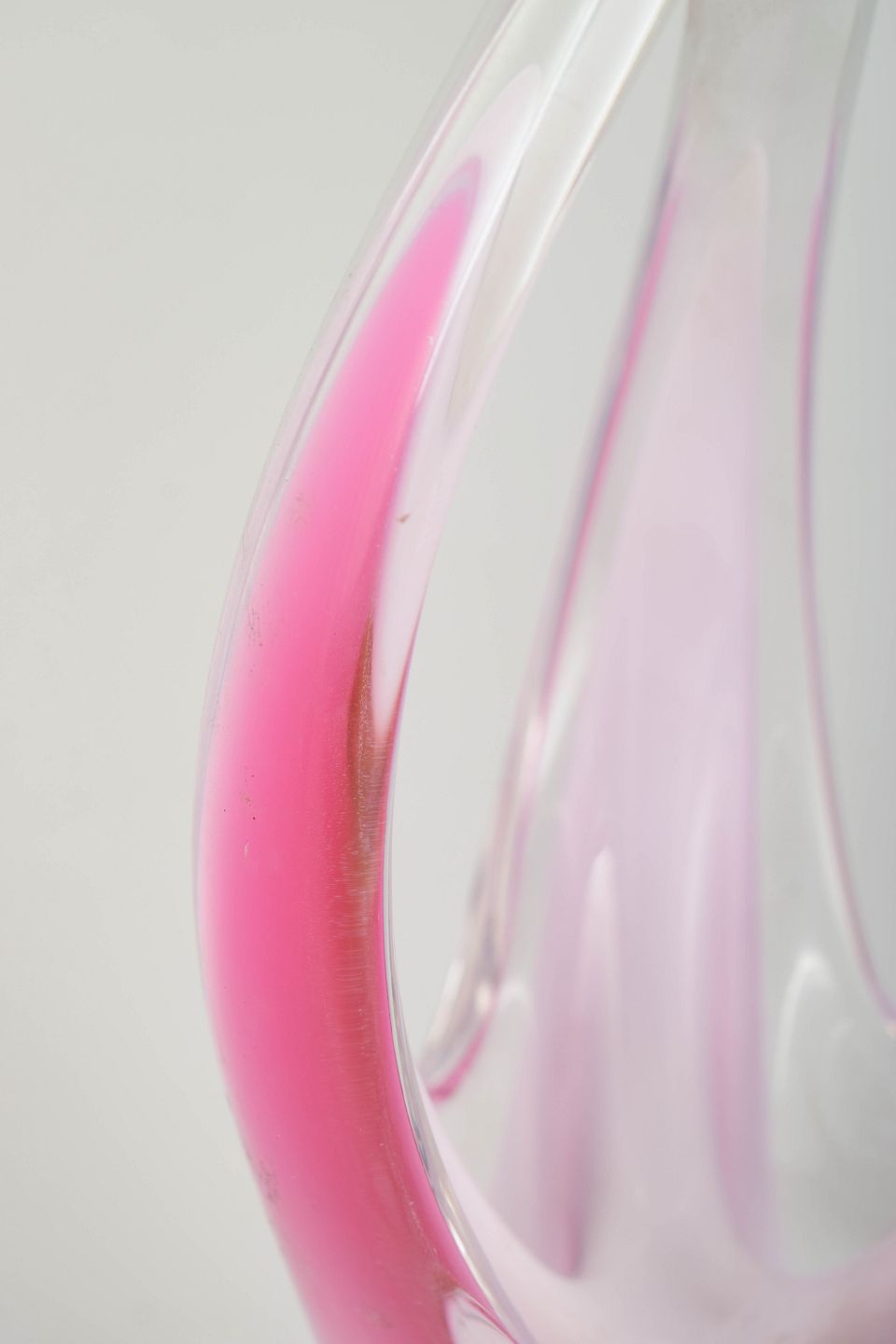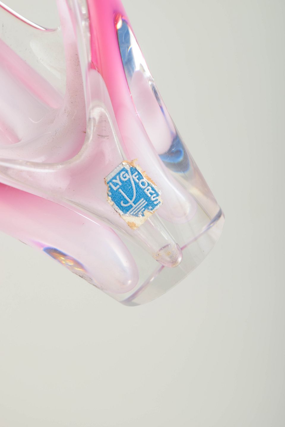 Organisk, skulpturel kunstglas vase i klart glas med lag i rosa og hvid. Mundblæst i den ikoniske opadstræbende Coquille-form. Originalt Flygfors-mærke.