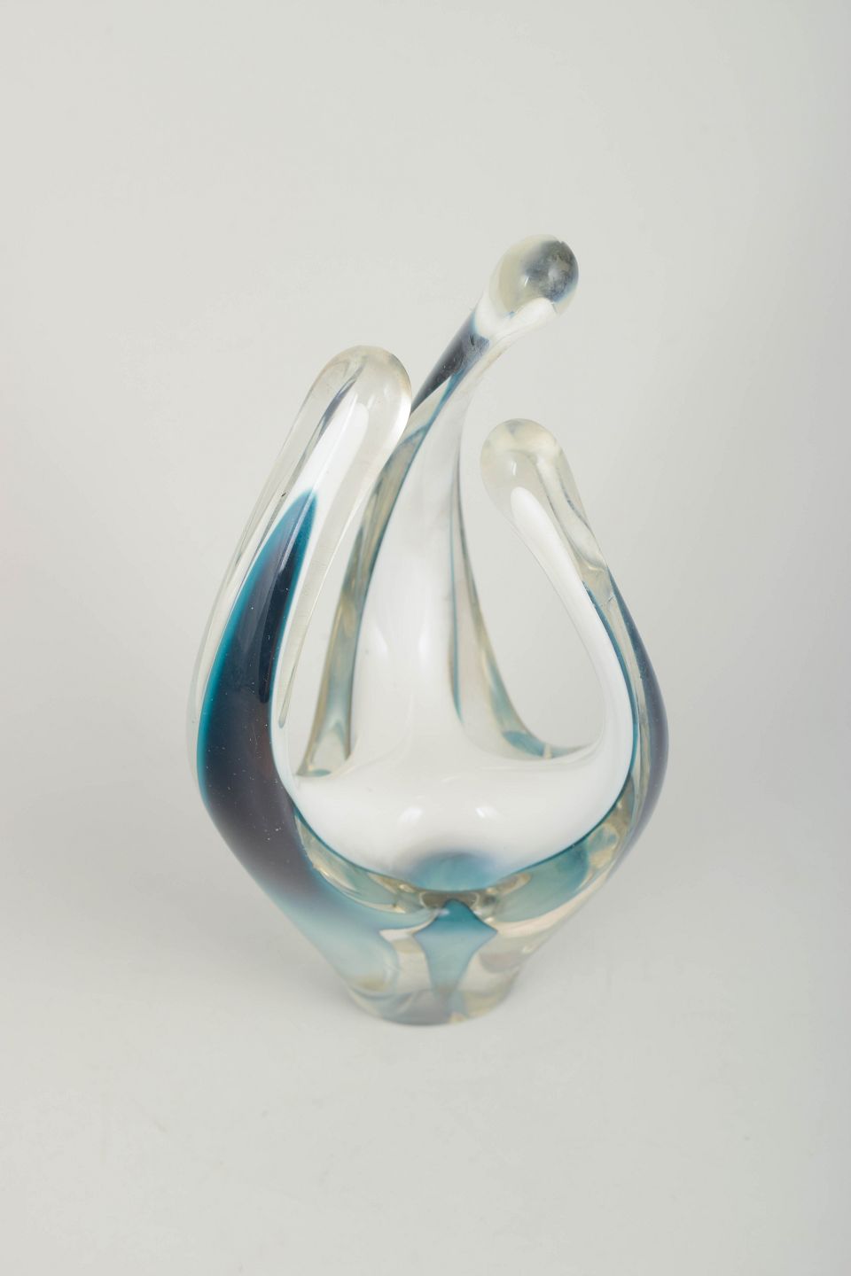 Skulpturel, organisk formet kunstglas vase i klart glas med lag i turkis, dyb blå og hvid. Mundblæst med de karakteristiske opadstræbende arm- eller flammeformer fra den tidlige Coquille-produktion. Elegant farvespil og stærk midcentury æstetik.