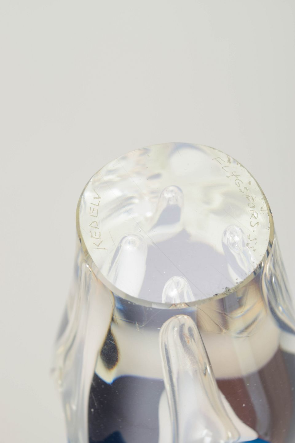Paul Kedelv (1917–1990) arbejdede hos Flygfors Glasbruk fra 1952 og skabte her Coquille-serien, som hurtigt blev et ikon for svensk 50’er-design. Serien er kendt for sine organiske, næsten flammestrømmende linjer og lagdelte farver, som giver hver skulptur et unikt, flydende udtryk.