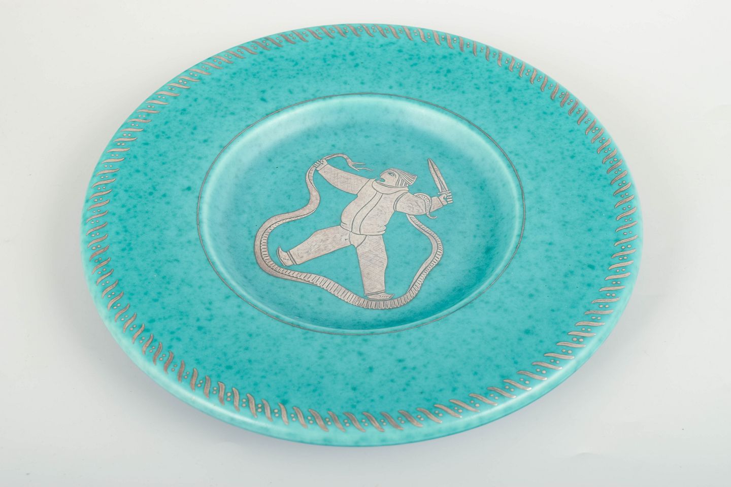Stort dekorativt fad i den ikoniske turkise Argenta-glasur med indlagt sølvmotiv. Centralt figurmotiv i mytologisk stil, udført med Kåges karakteristiske stregarbejde, omgivet af en kant med sølvdekorerede fletdetaljer. Et markant og sjældnere Argenta-stykke i stort format.