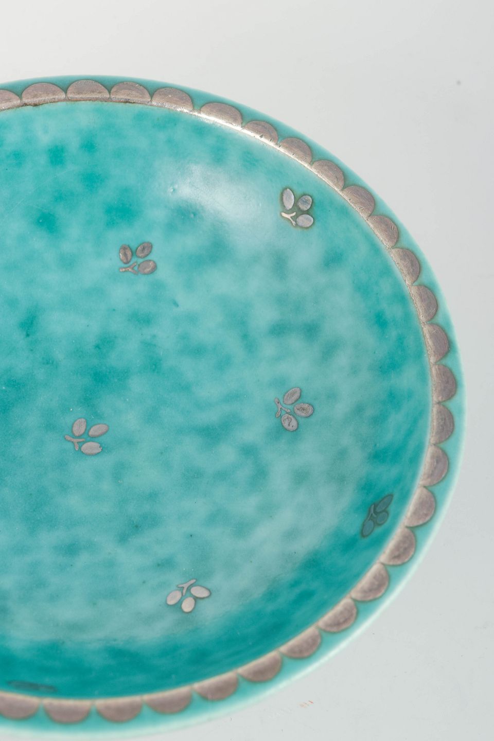 Skål i klassisk turkis glasur med indlagte sølvdekorationer, typisk for Kåges ikoniske Argenta-arbejder for Gustavsberg. Elegant lille form med sølvrand og dekorerede blomsterdetaljer.