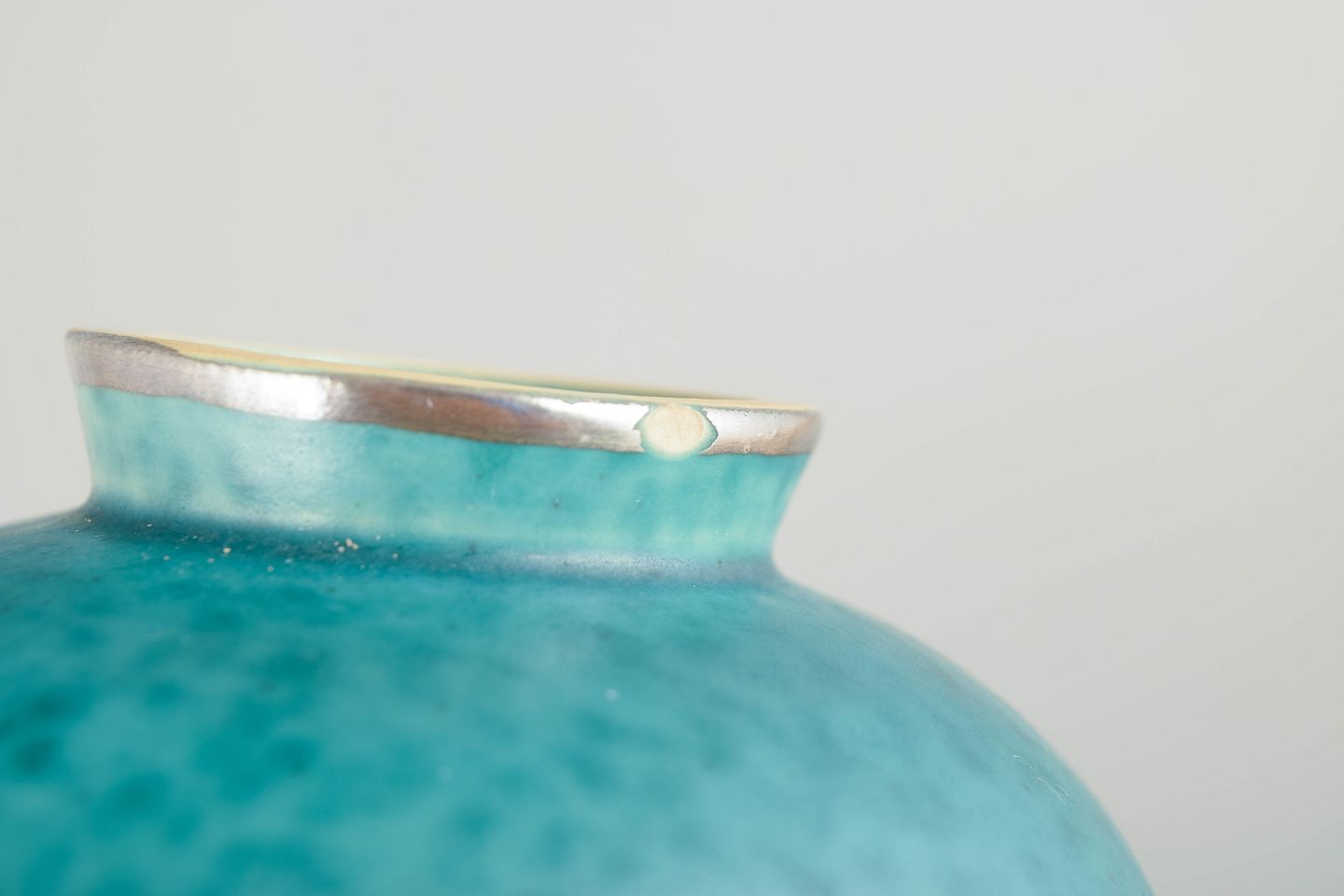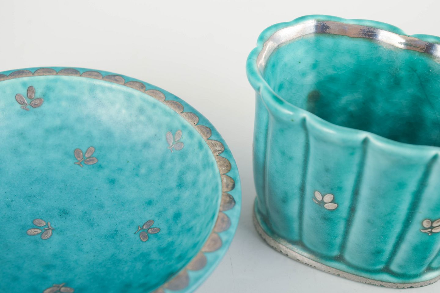 Skål og lille vase i klassisk turkis glasur med indlagte sølvdekorationer, karakteristisk for Kåges ikoniske Argenta-arbejder for Gustavsberg. Elegante, små formater med tydelig studiopræcision.