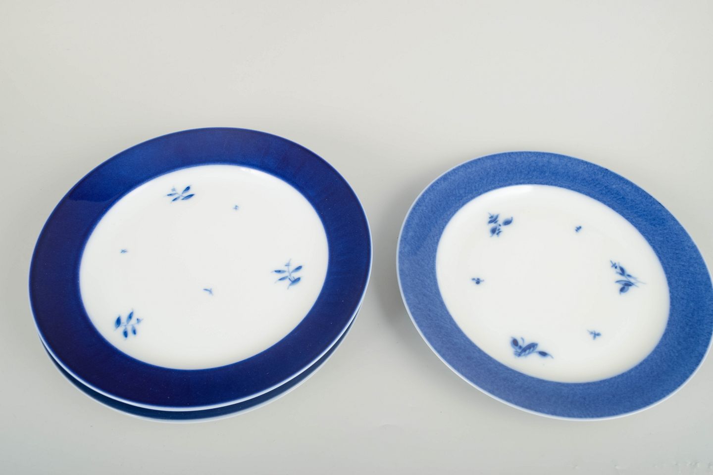 Sjældne, store tallerkener i porcelæn med bred dybblå kant og håndmalede blomsterdetaljer i klassisk Royal Copenhagen-stil. Et elegant og tidløst stel fra 50’erne, eftertragtet for sit rene formsprog og sin harmoniske farvebalance.