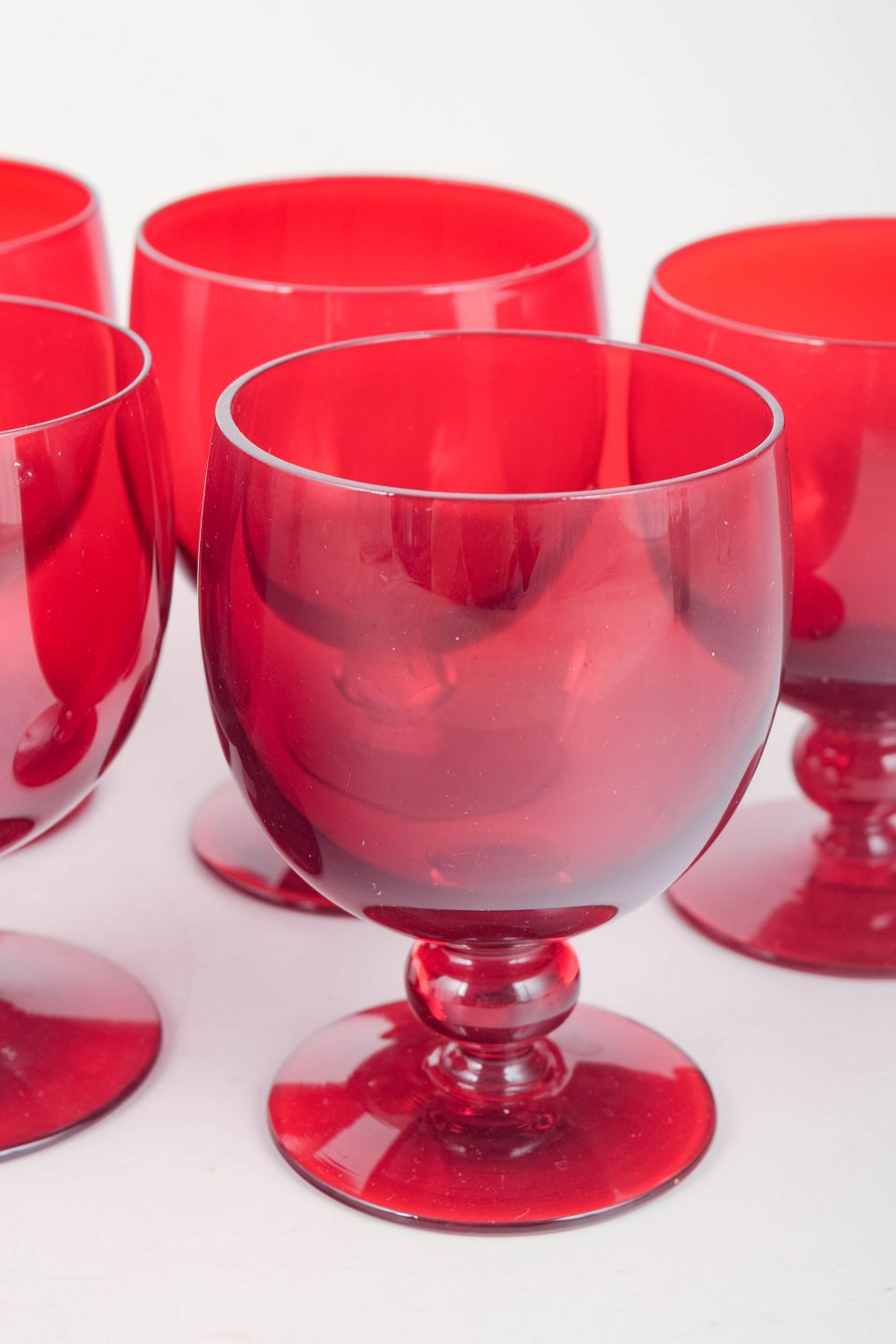 Sæt af fem rubinrøde rødvinsglas i klassisk form med rund kupa og profildrejet stilk. Den dybe røde tone er karakteristisk for Reijmyres midt-århundrede produktion.
