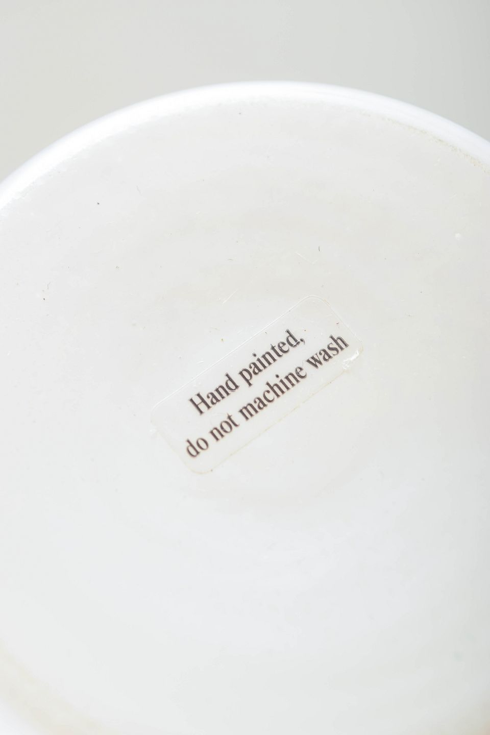 Håndmalet, organisk formet glasvase i opalhvidt art glass med karakteristisk botanisk dekoration i blå og grønne nuancer.