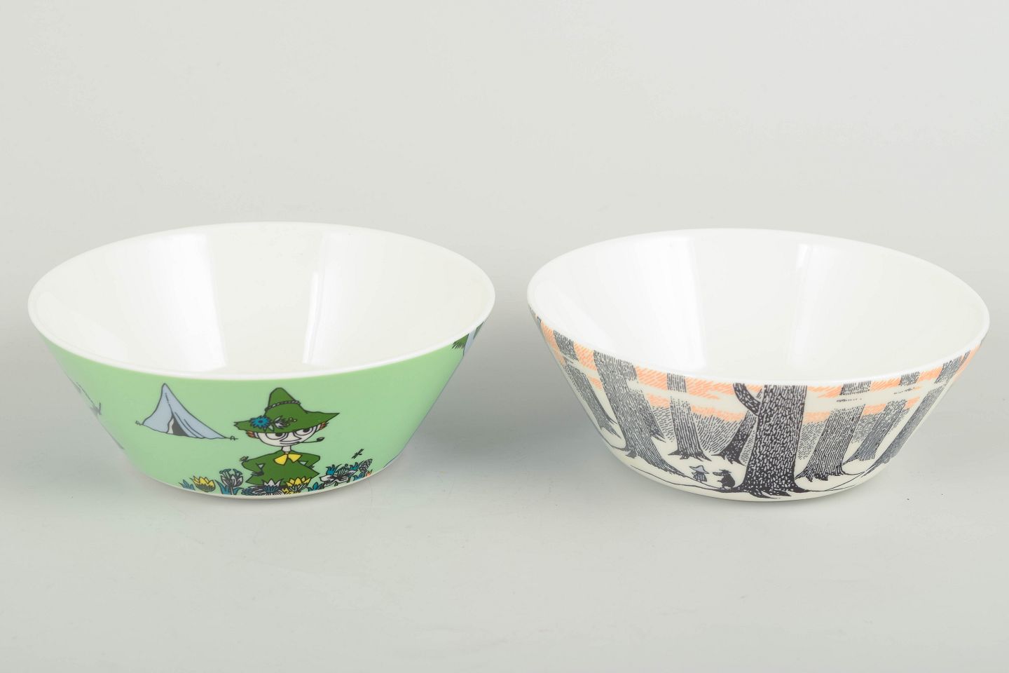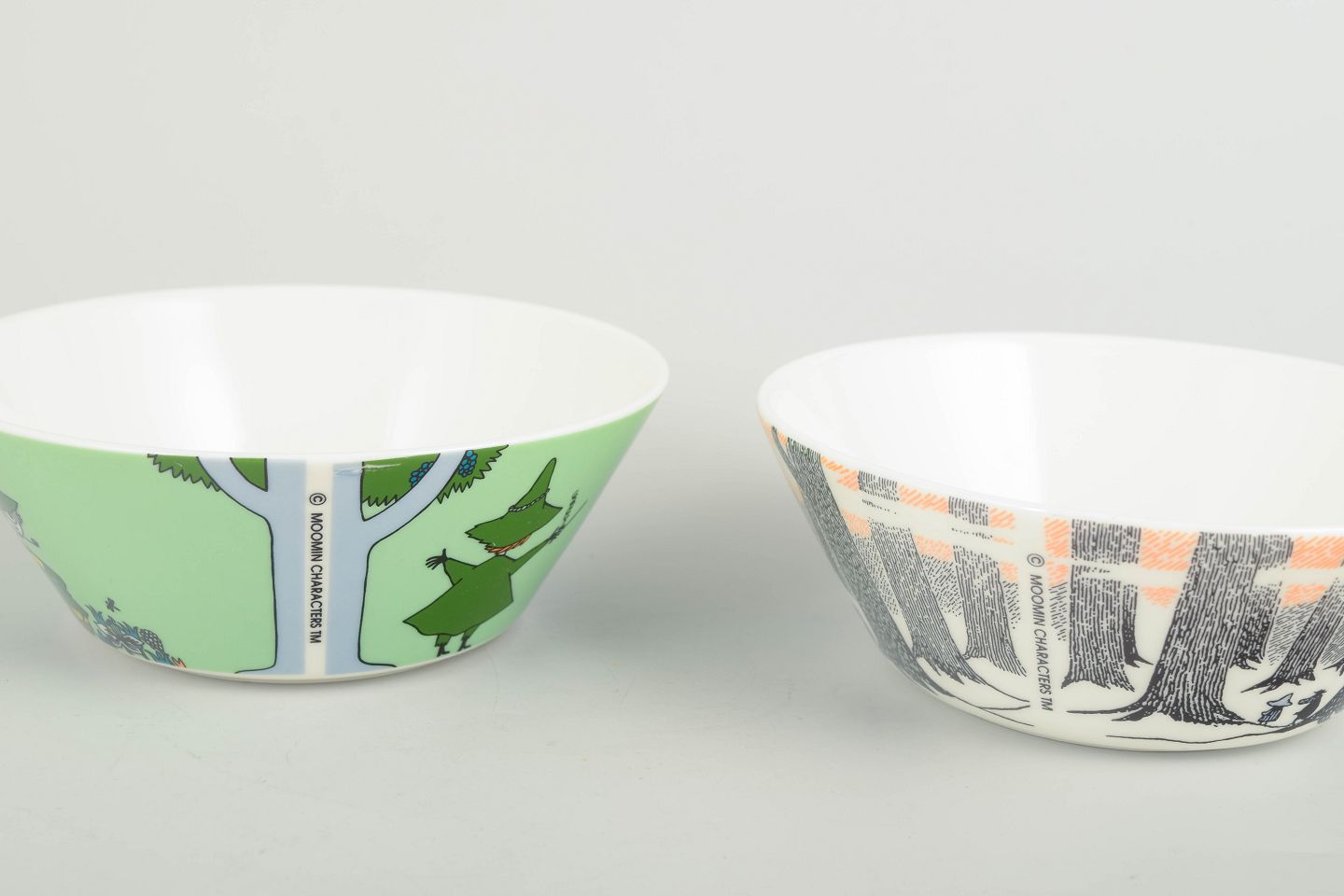 To dekorative Mumi-skåle i porcelæn fra Arabia Finland. Den ene skål i lysegrøn med Snusmumrikken og teltmotiv; den anden med et mere grafisk skovmotiv i sort, hvid og orange, baseret på Tove Janssons originale tegninger.