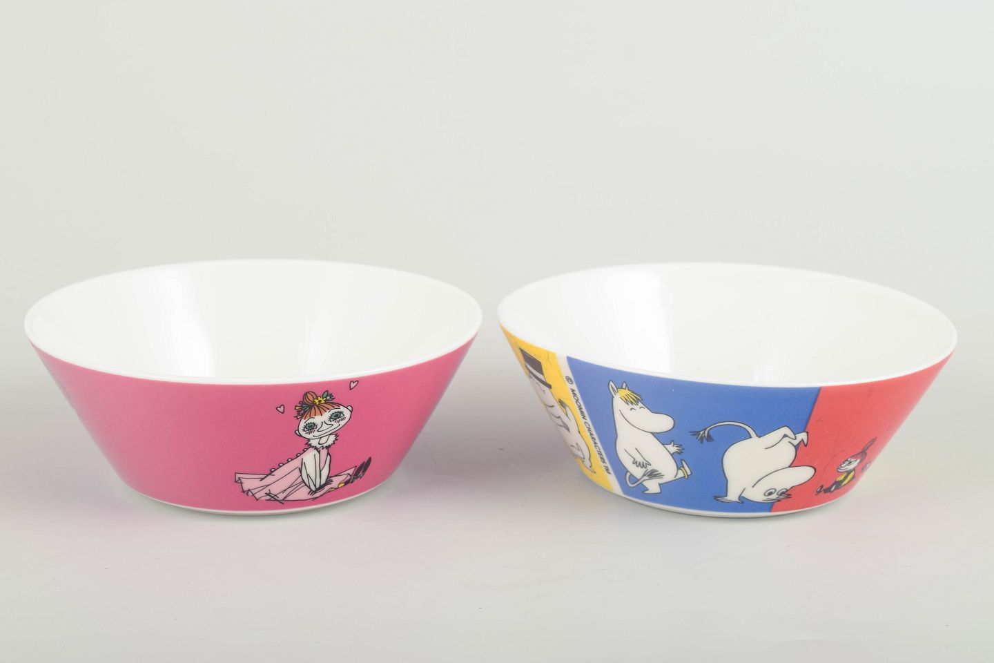 To farverige og dekorative Mumi-skåle i porcelæn fra Arabia Finland, hver med klassiske figurmønstre fra Tove Janssons univers. Den ene skål prydes af Mymble i rosa farver, den anden med motiv af Mumifamilien i blå, gule og røde nuancer.
