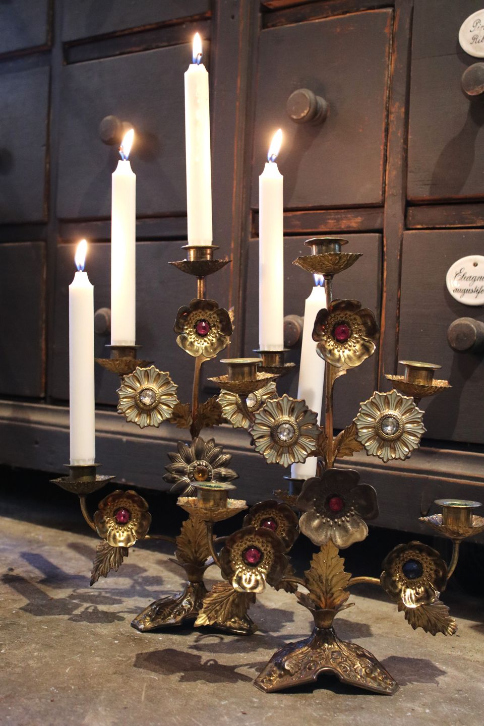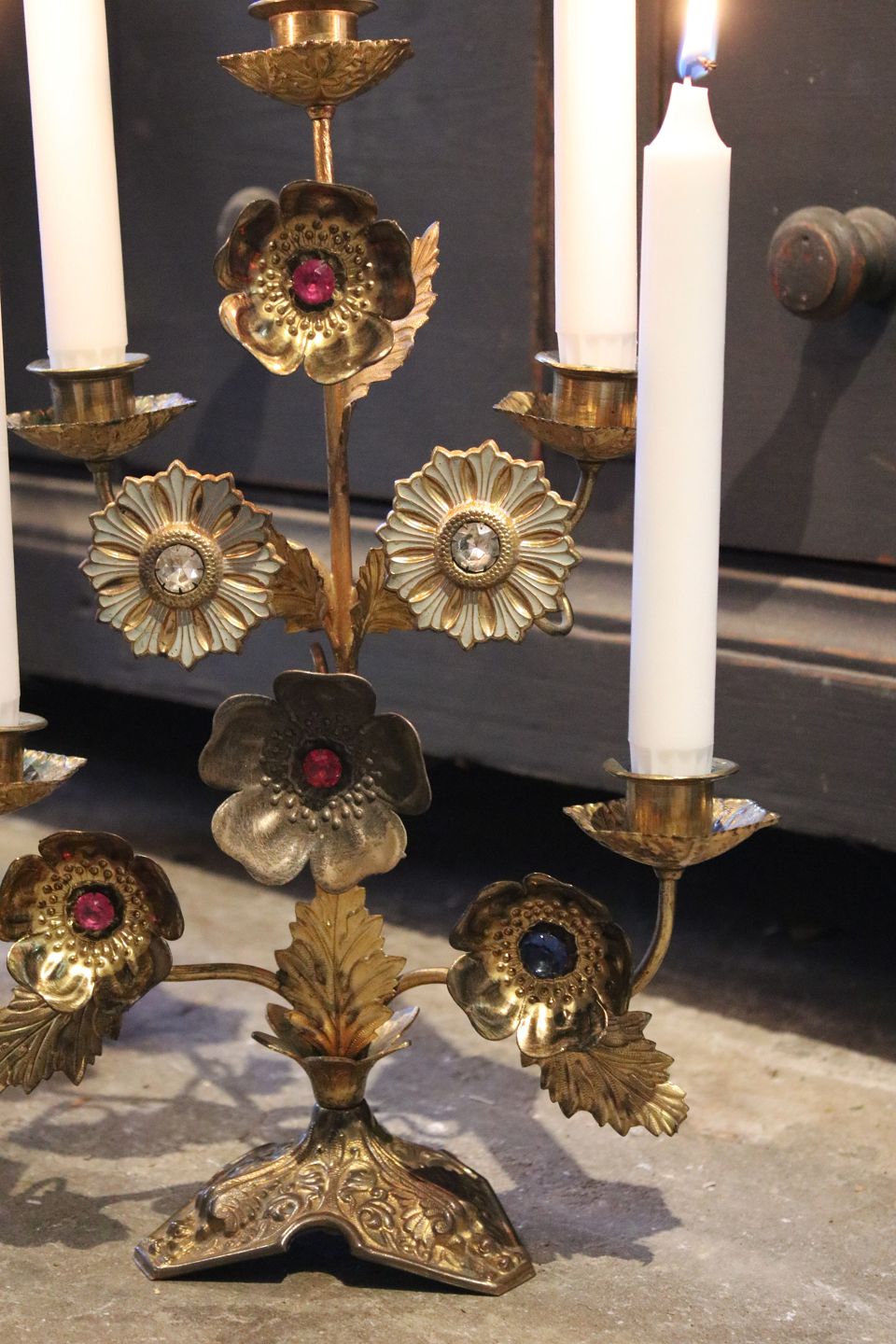 Antik , franske kirkelysestage i forgyldt metal dekoreret med 6 metalblomster med farvet sten. Stagen har plads til 5 stearinlys.H: 36cm. B: 25cm.