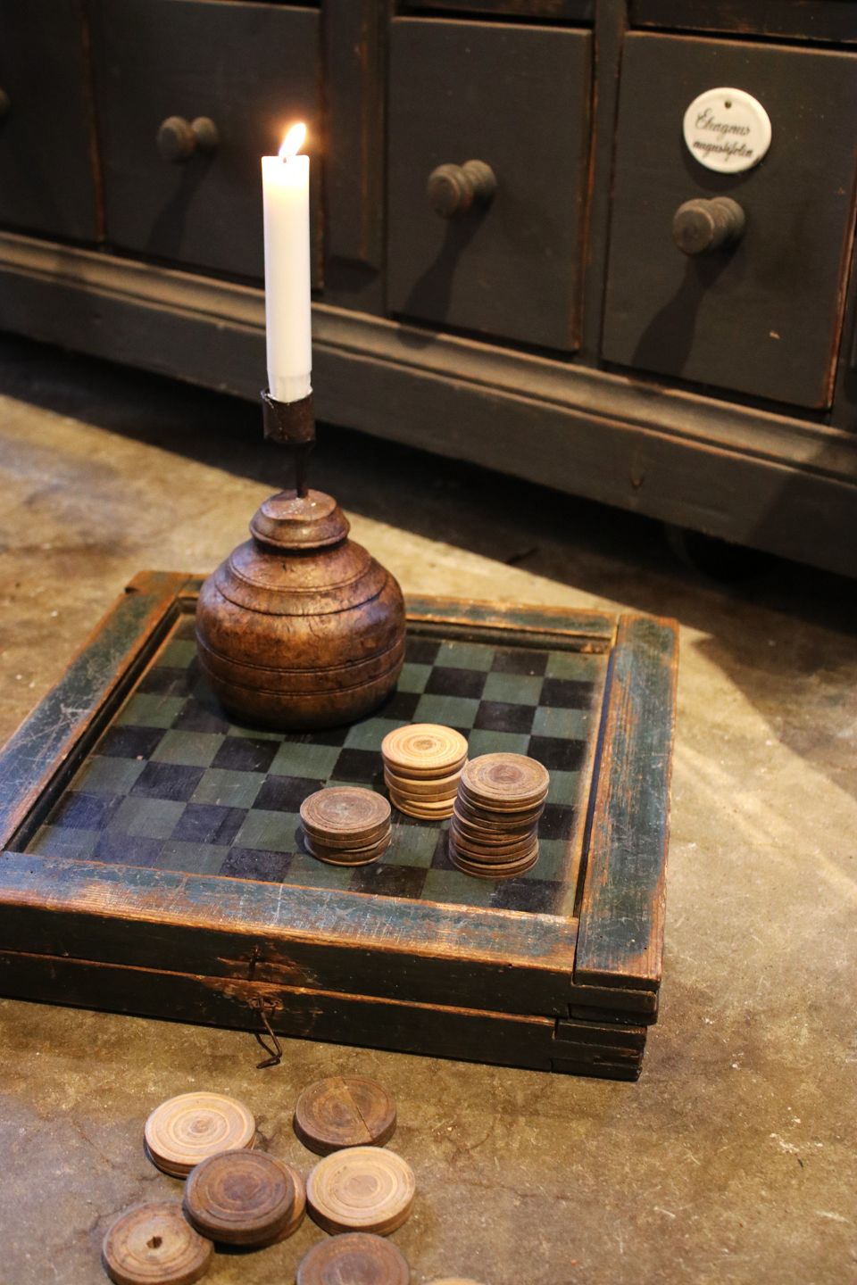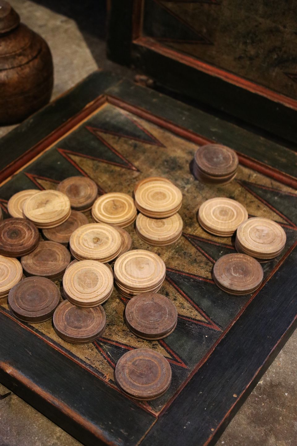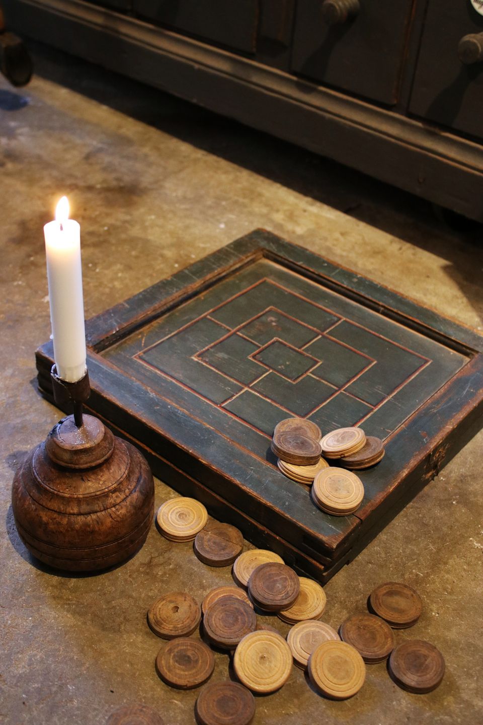 Charmerende antik 1800 tals spilleæske / brætspil i bemalet træ med 3 forskellige spil. Har en super fin patina.Æsken måler H: 6cm. 36x35cm. (inkl. 30 stk. spillebrikker)