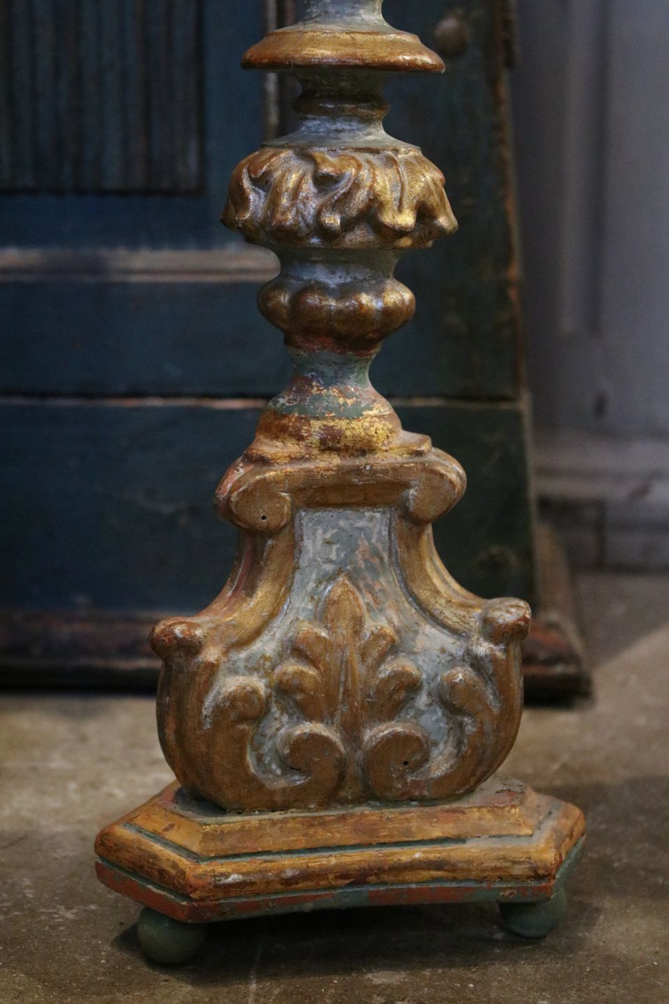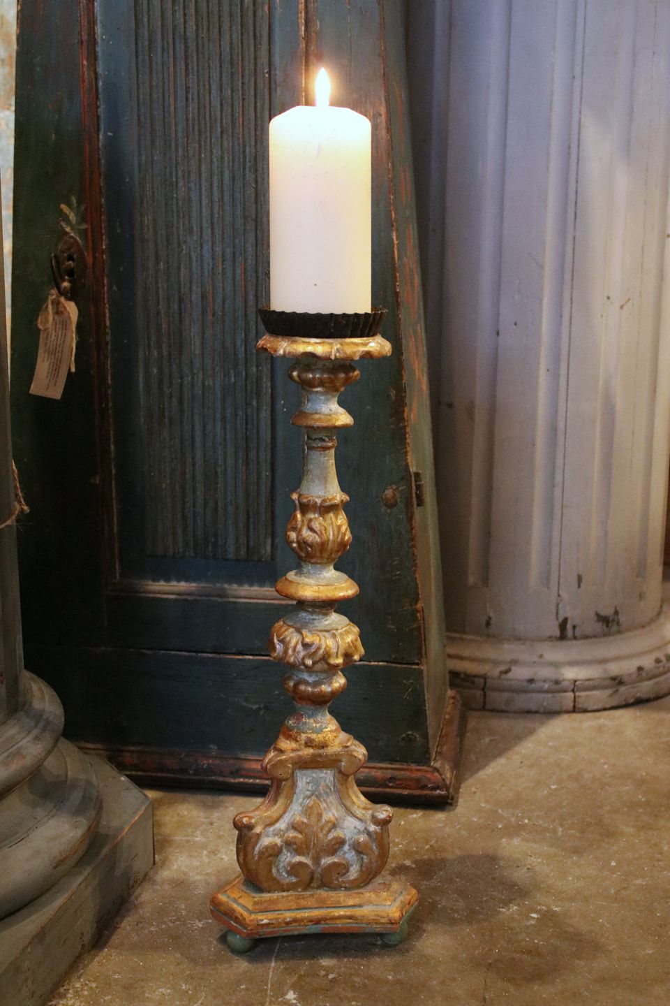 Antik , fransk 1800 tals lysestage i udskåret træmed original bemaling og med en rigtig fin patina.