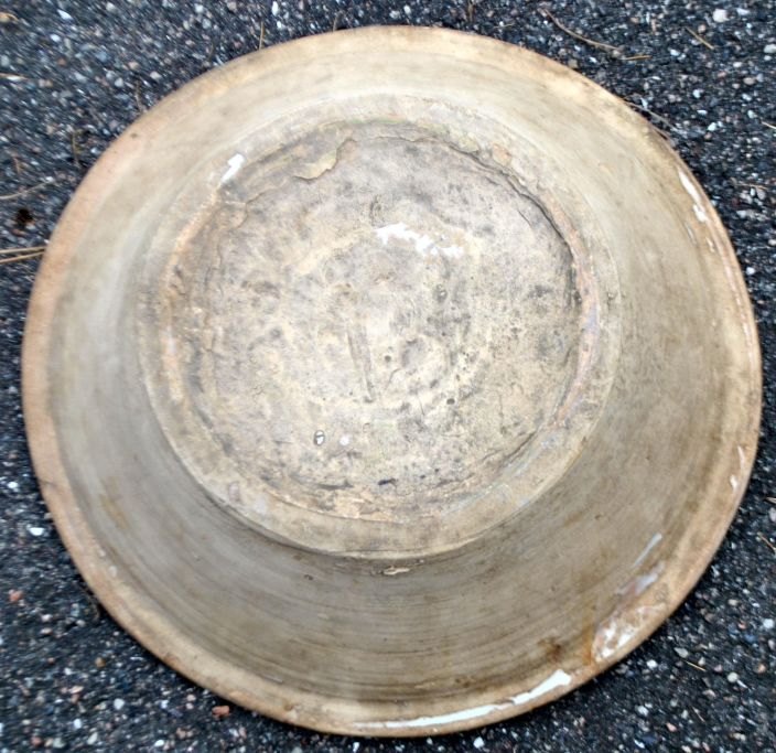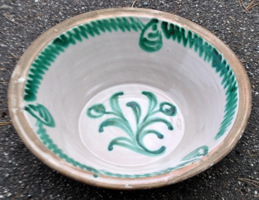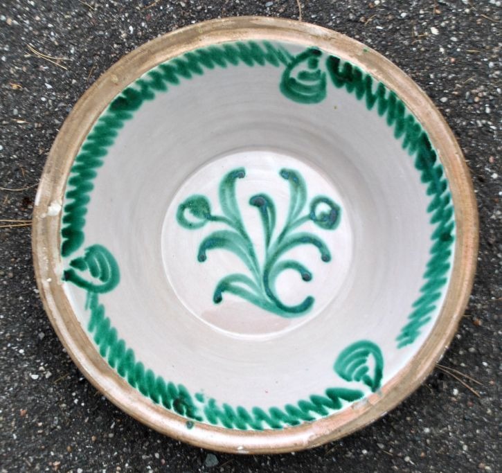 Stort antikt lerfad, 19. årh. Indvendig med grønne og lyse glasurer Med kantdekoration og midterdekoration i form af blomst. Dia.: 42 cm. H.: 12 cm.Perfekt stand!