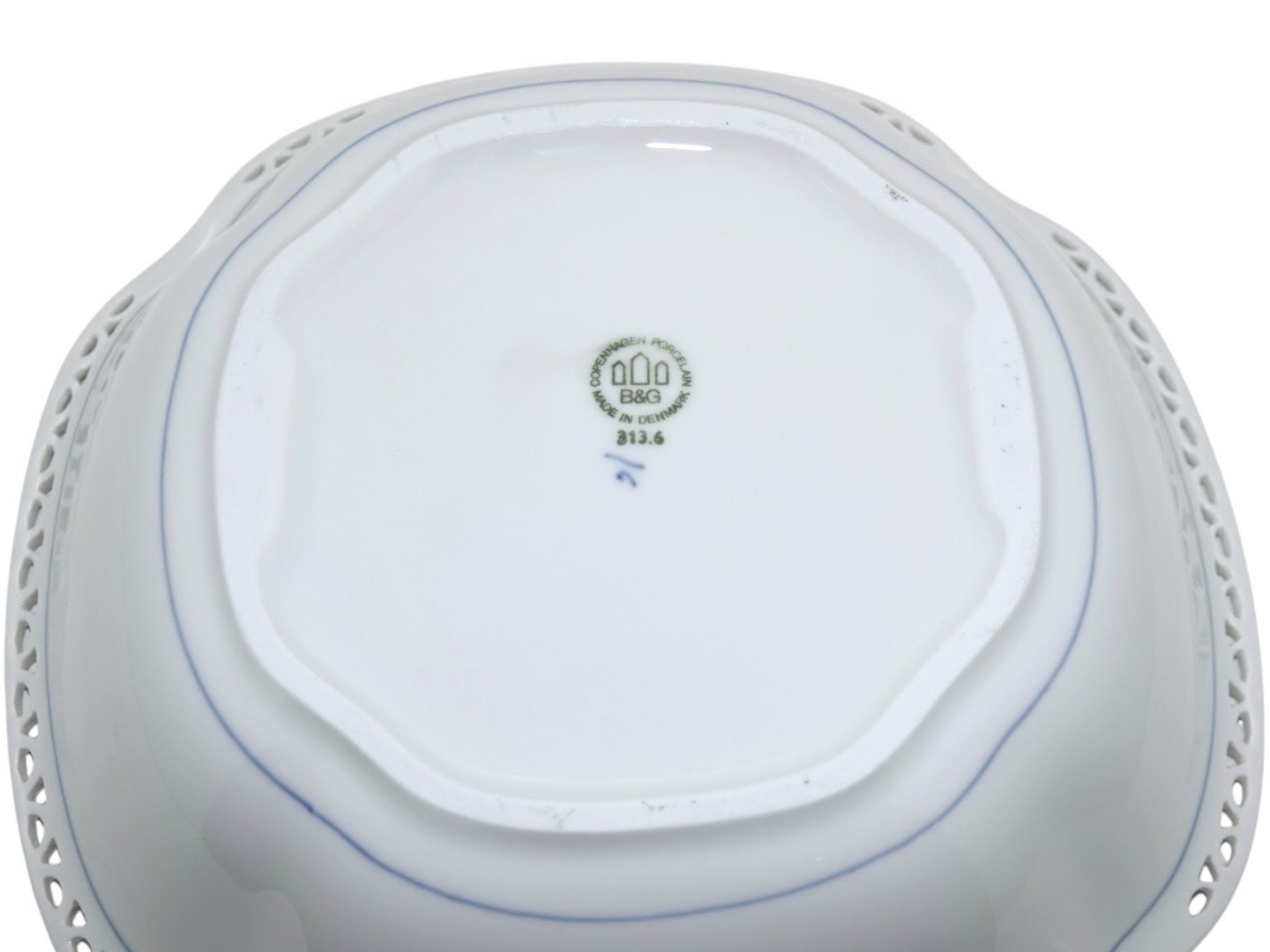 Bing & Grøndahl Empire med gennembrudt kant, stor firkantet kartoffelskål.Af fabriksmærket kan det udledes, at disse er produceret mellem 1970 og 1983.