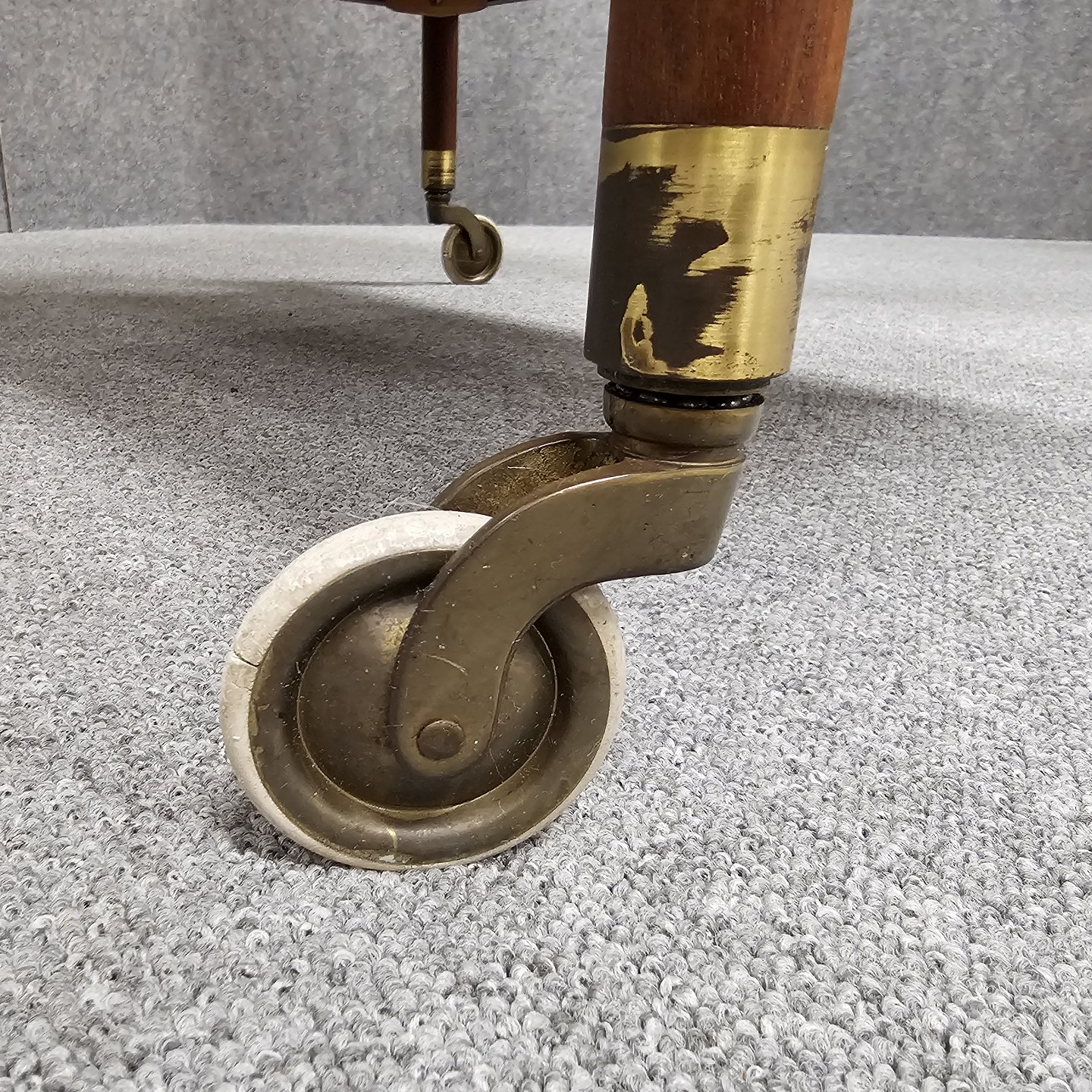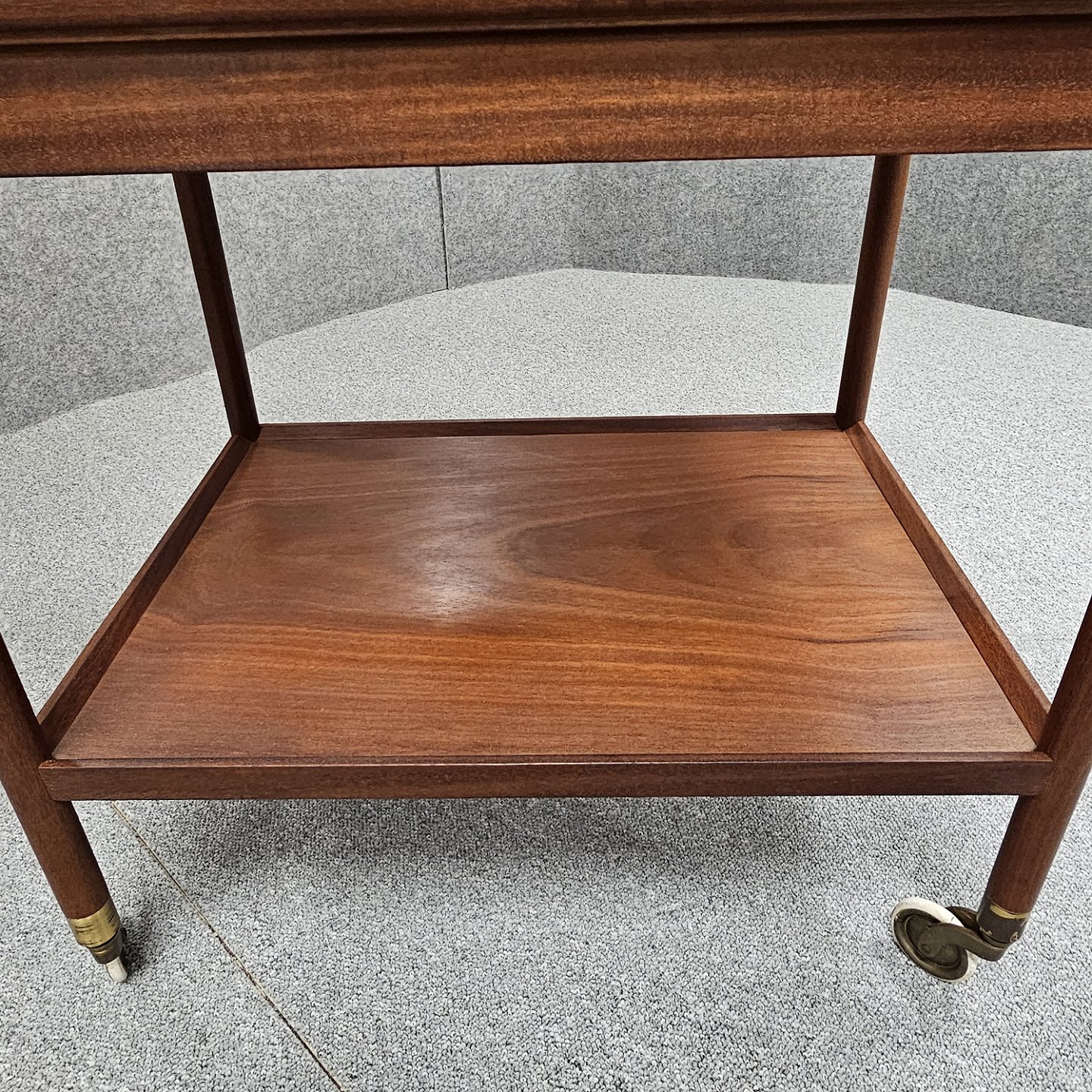 Rullebord i teak dekoreret med kakler i grønlige nuancerDer er brugsspor og slid ved hjulene, som virker fint