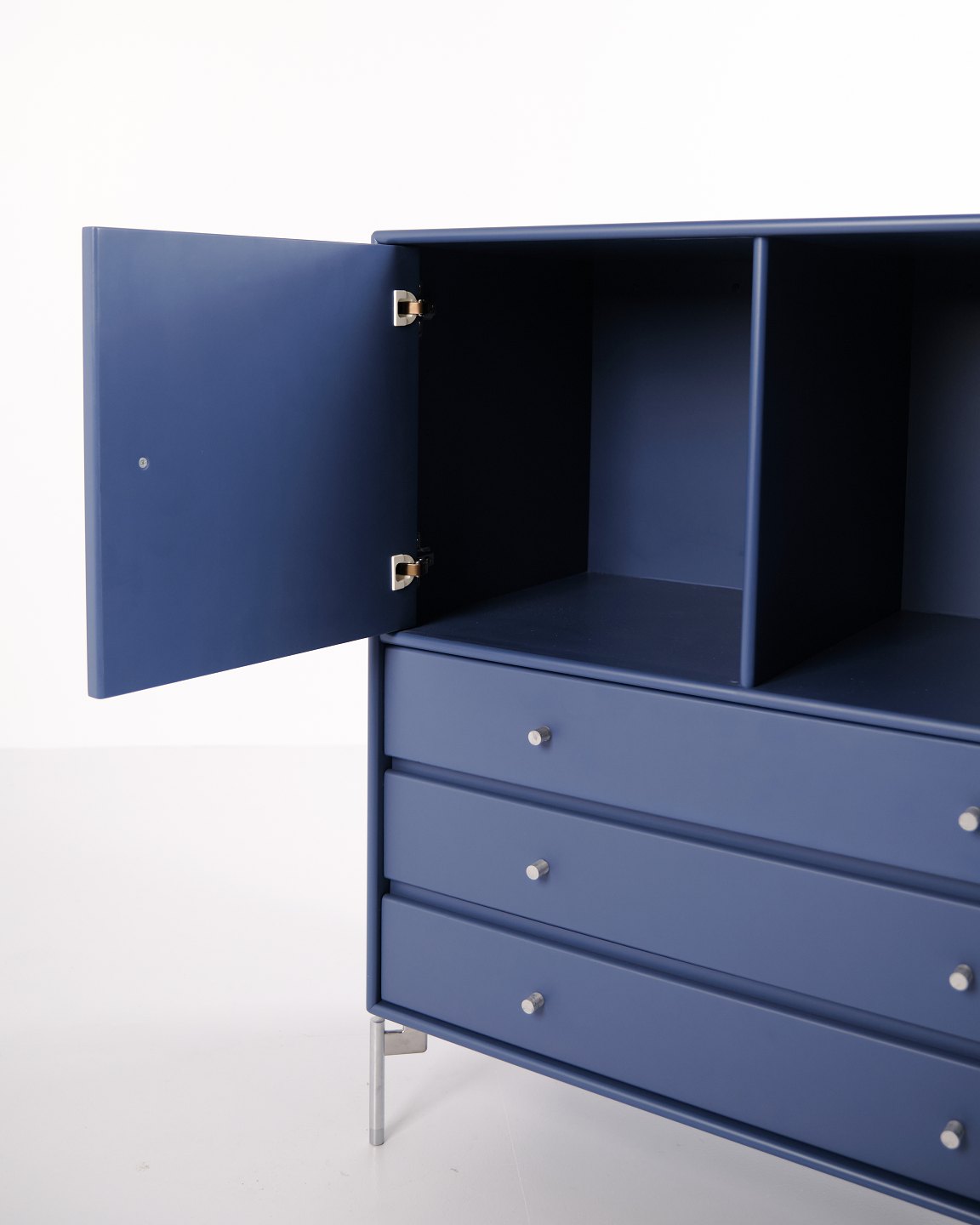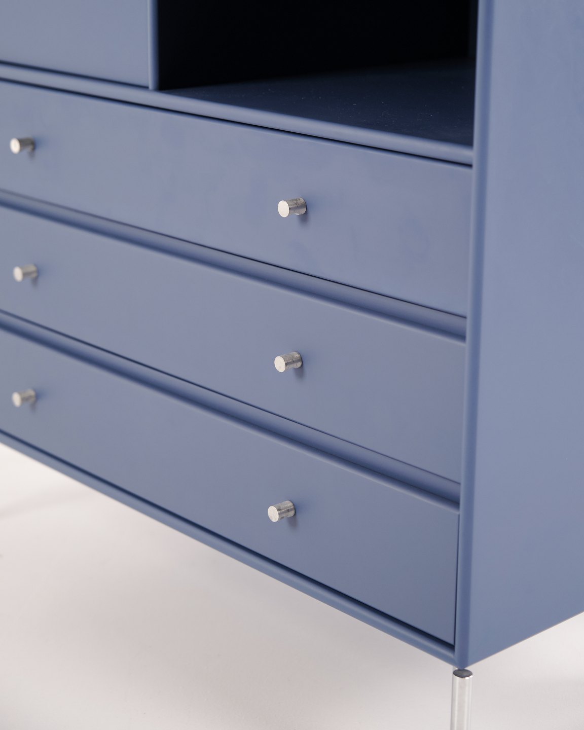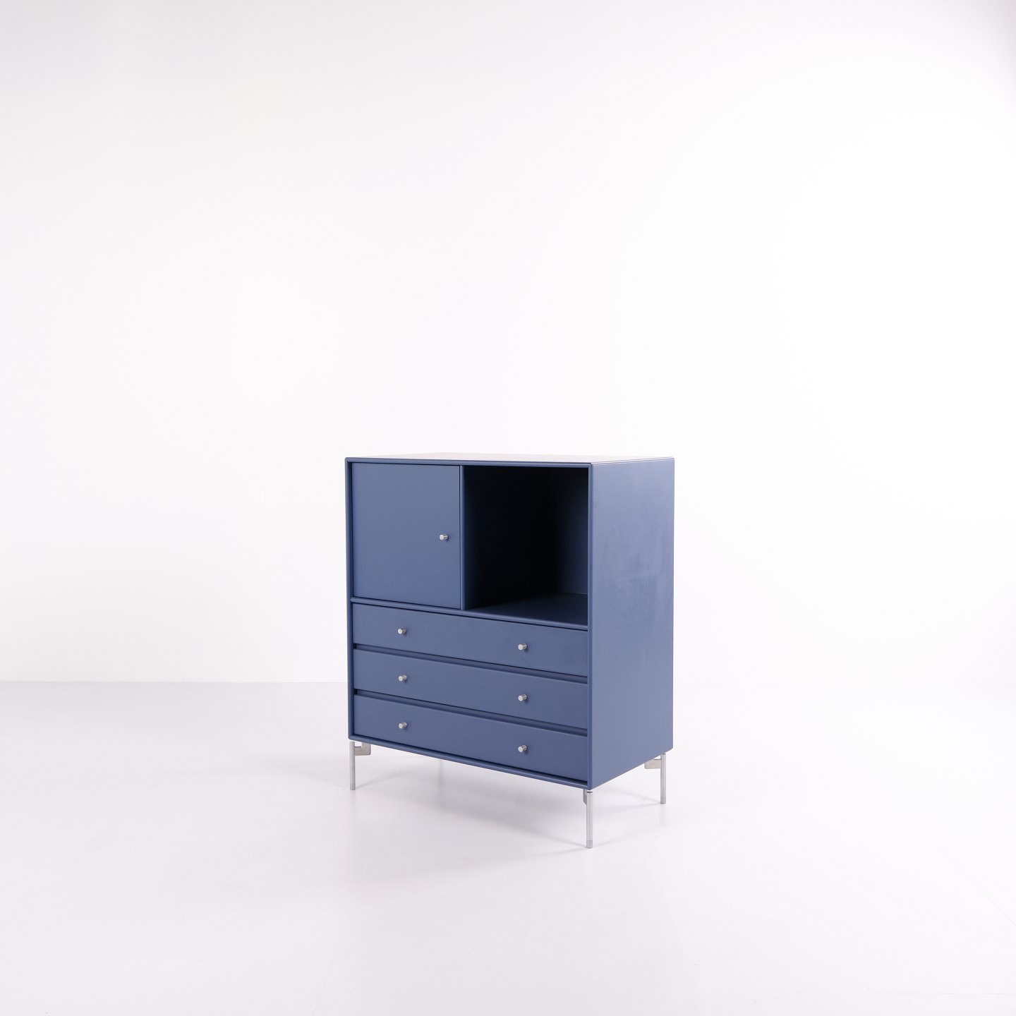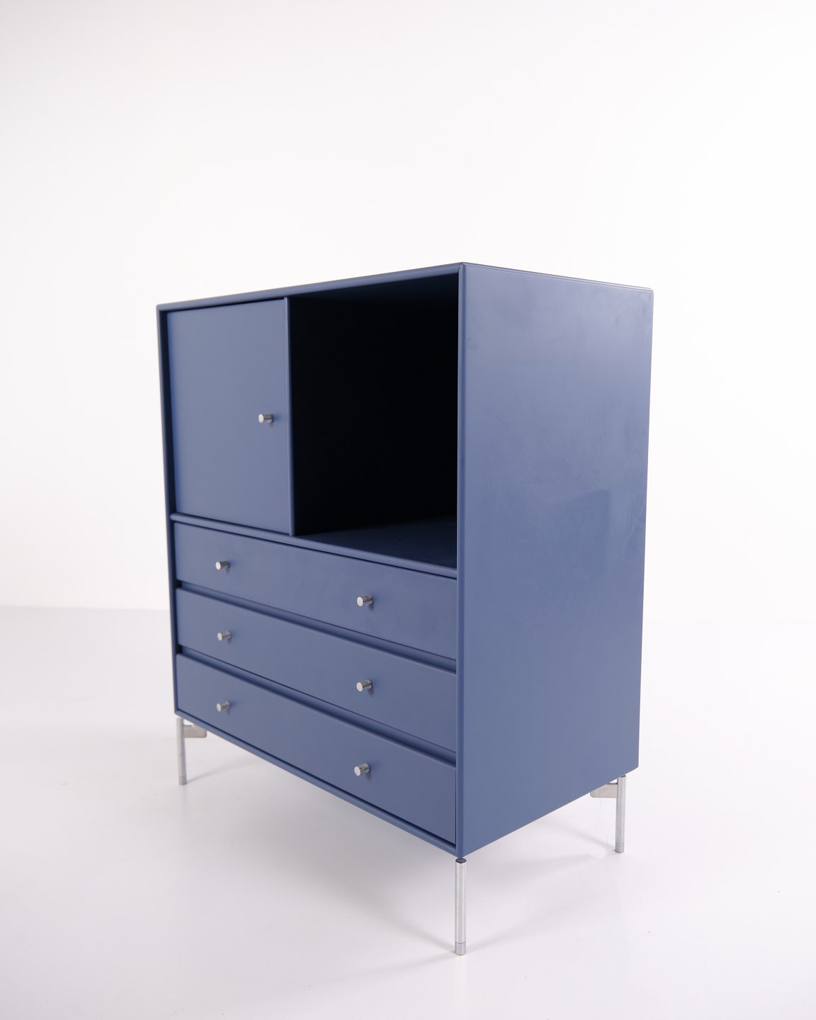 Montana kommode i blå med krom ben. Modulet er indrettet med tre skuffer og én låge, hvilket giver praktisk og fleksibel opbevaring. Et klassisk Montana-design med enkel struktur og høj funktionalitet.— Producent: Montana