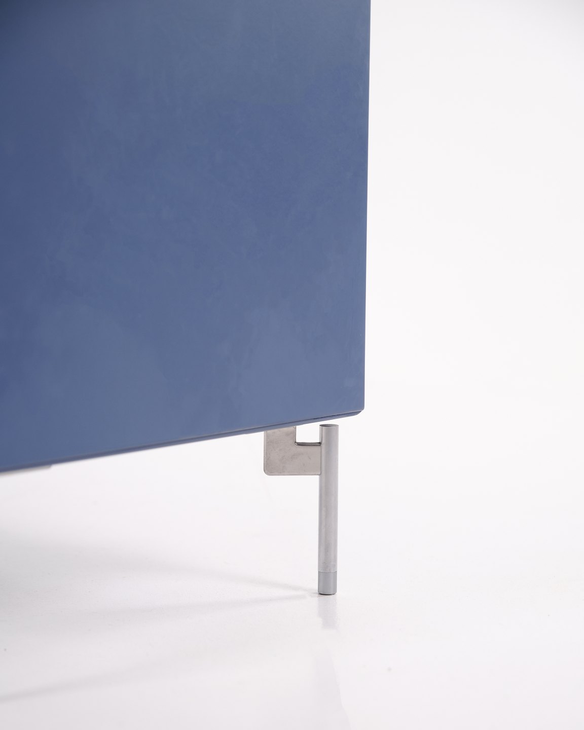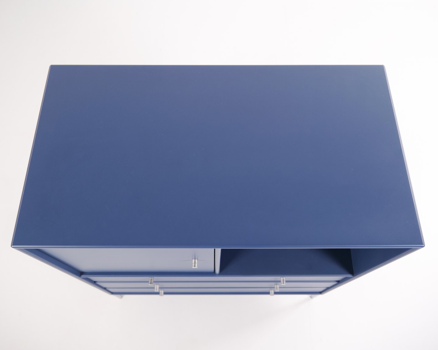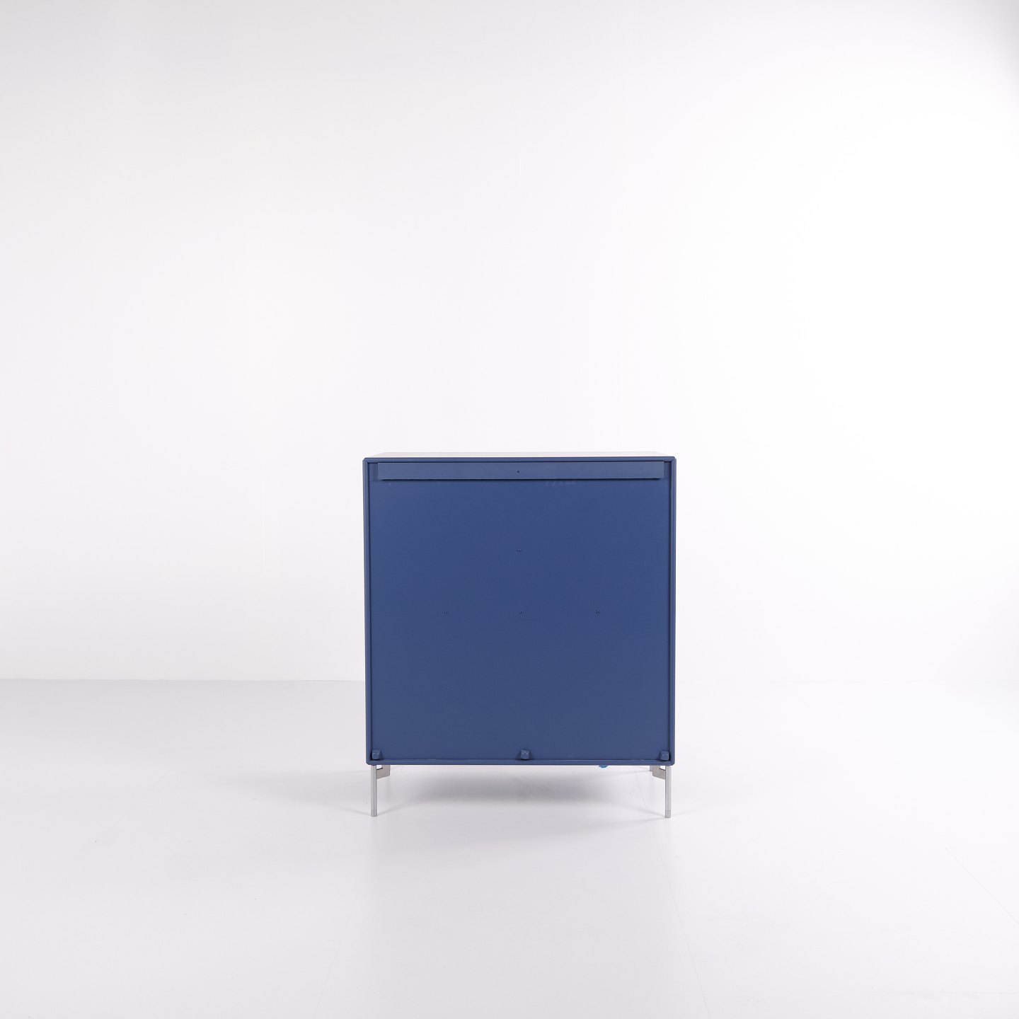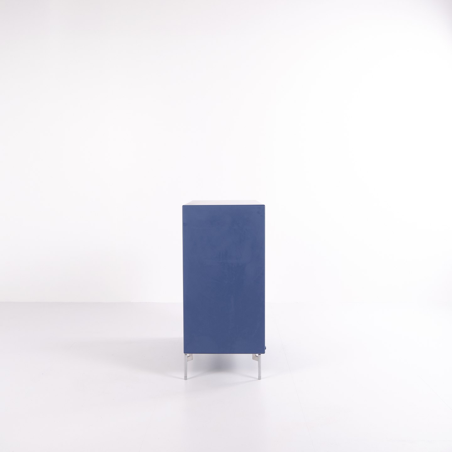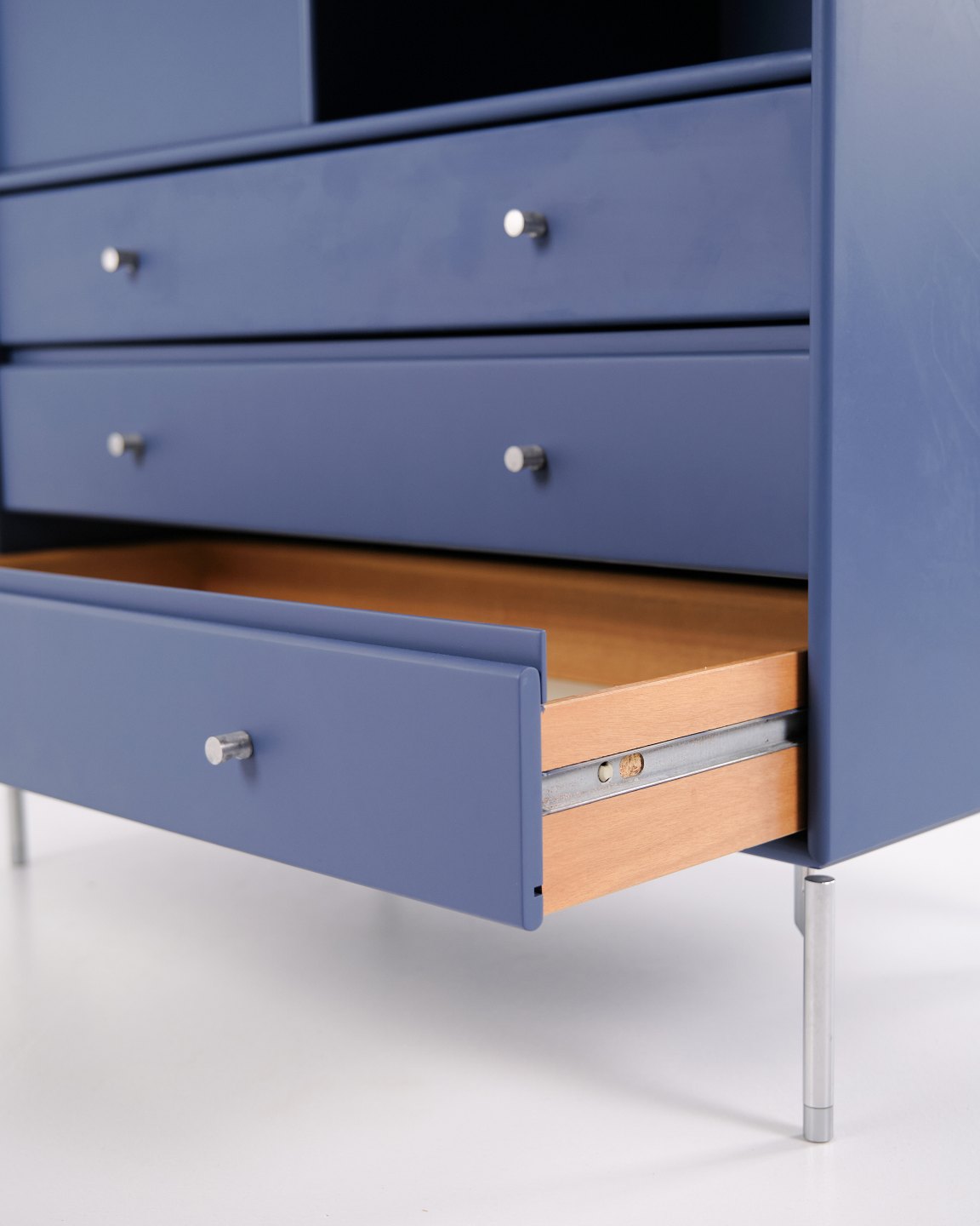 Montana kommode i blå med krom ben. Modulet er indrettet med tre skuffer og én låge, hvilket giver praktisk og fleksibel opbevaring. Et klassisk Montana-design med enkel struktur og høj funktionalitet.— Producent: Montana