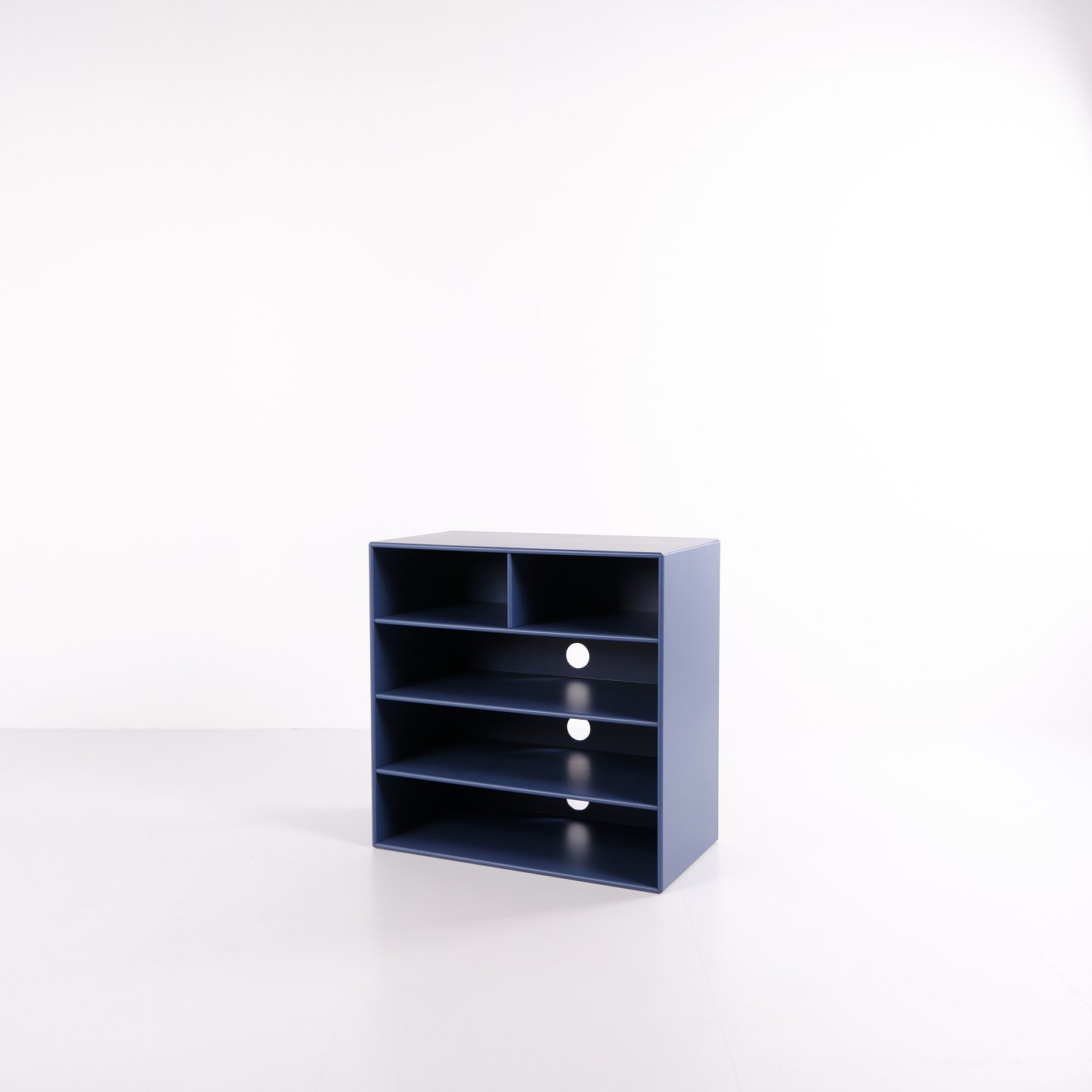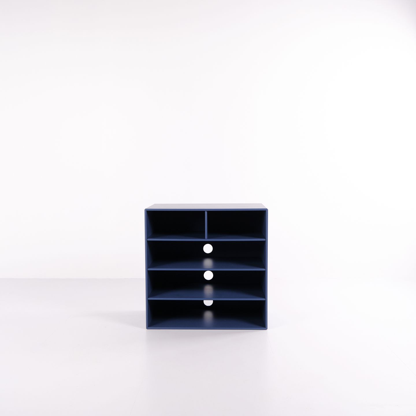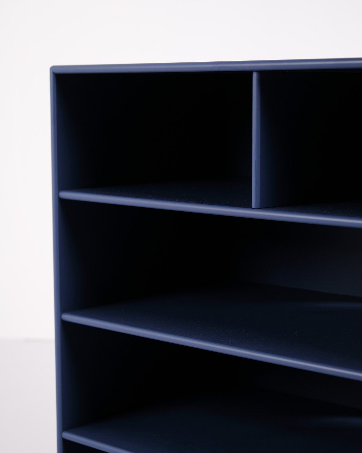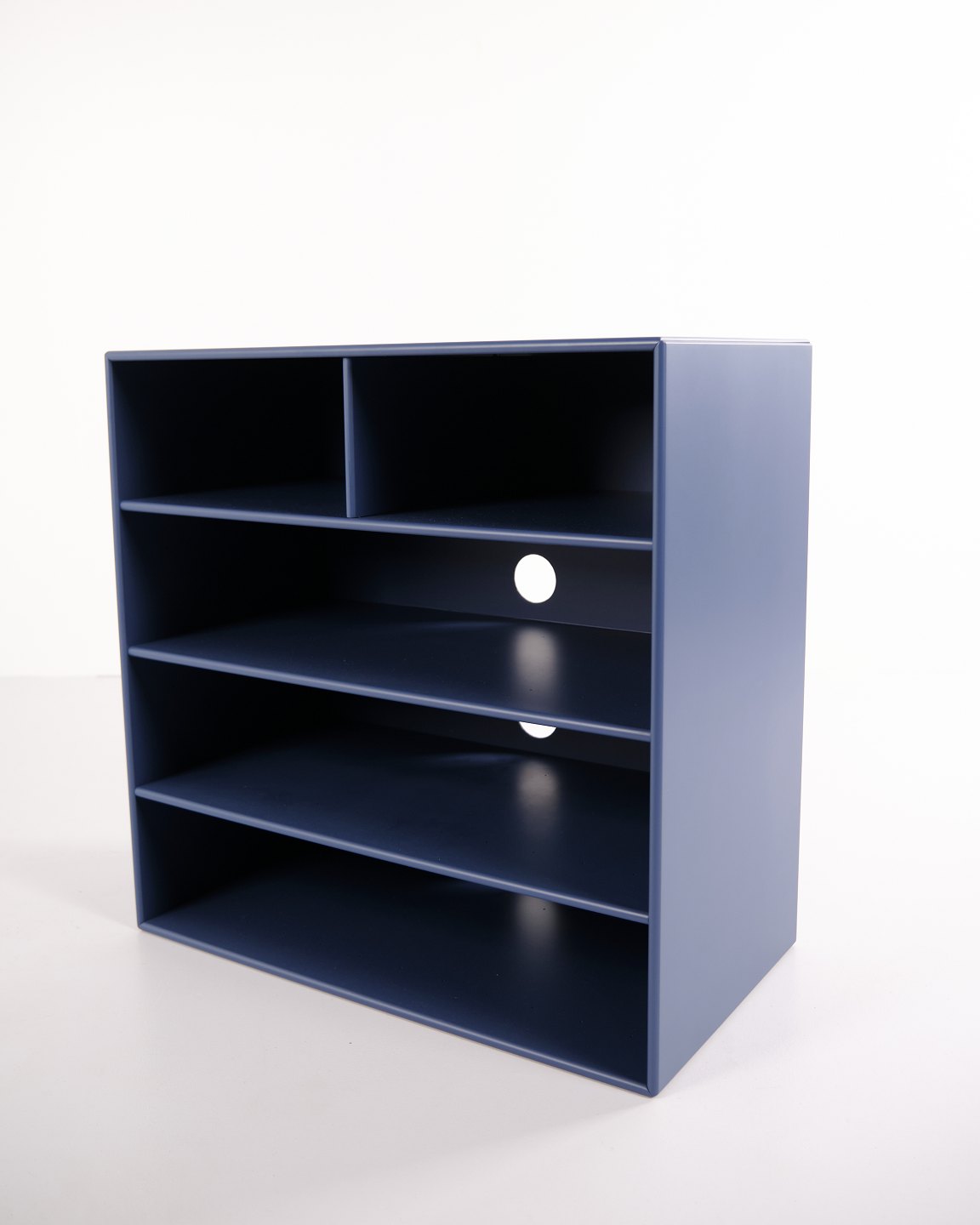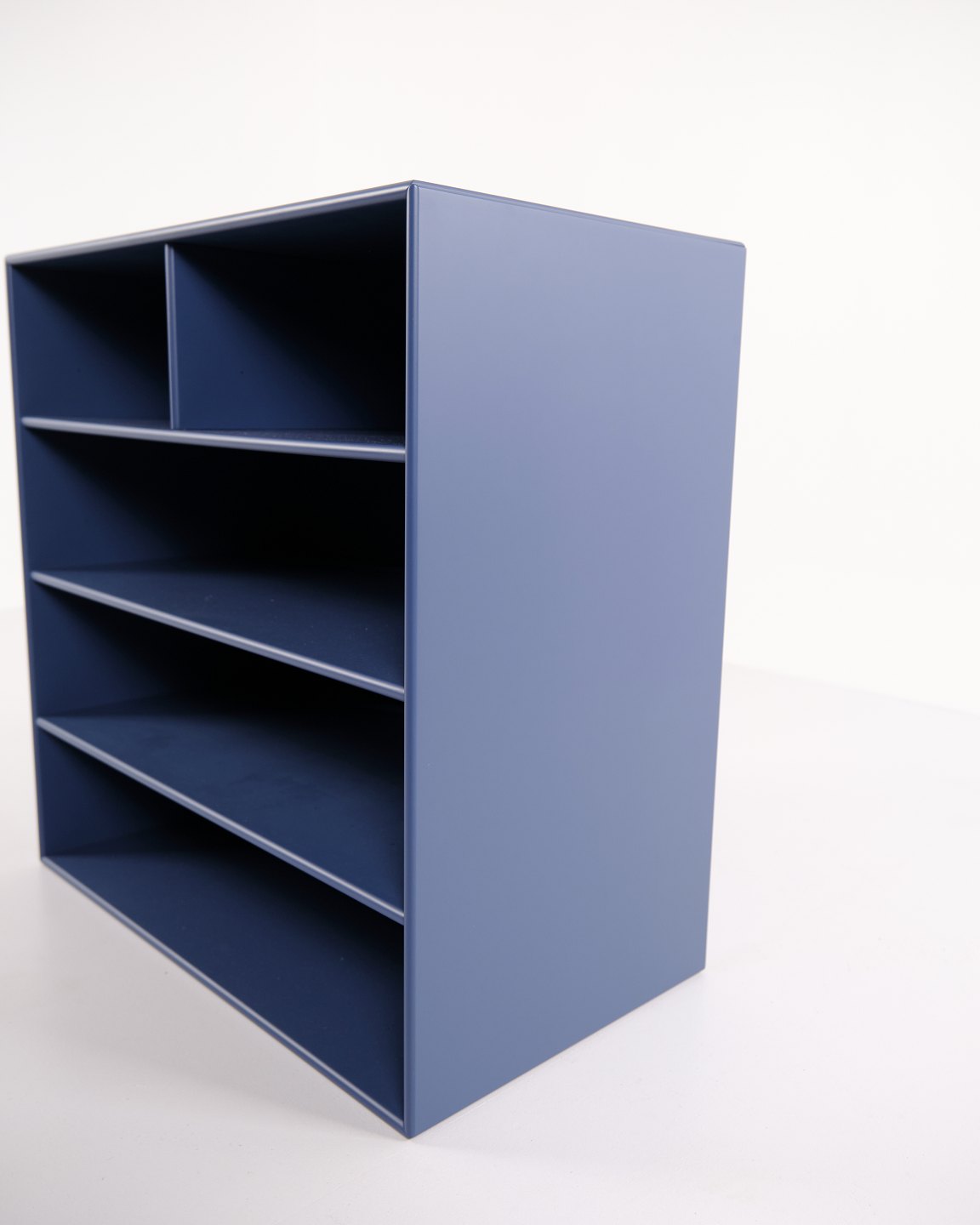 Montana bookcase in blue. Equipped with four open shelves, suitable for storage or display in the living room, office or hallway. A classic Montana module with a simple structure and high functionality.— Manufacturer: Montana