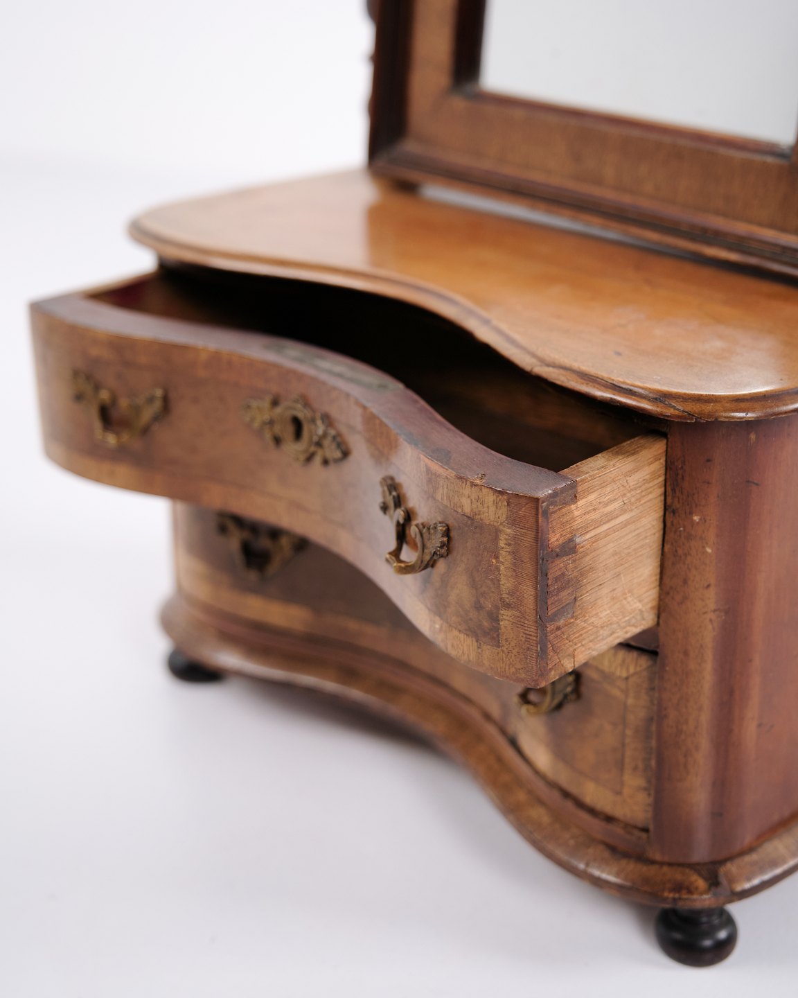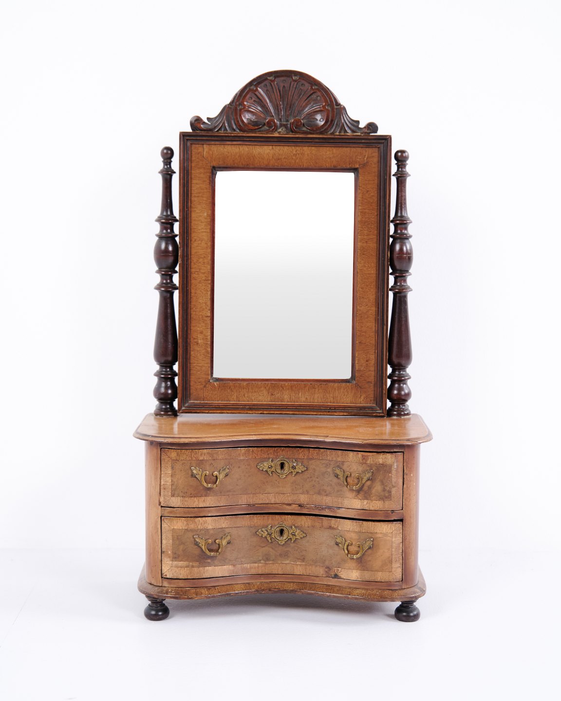 Small piece of children’s furniture from around 1860, made in mahogany with mirror and two drawers. A decorative and rare antique item with fine details, suitable for collectors or classic interiors.— Period: c. 1860