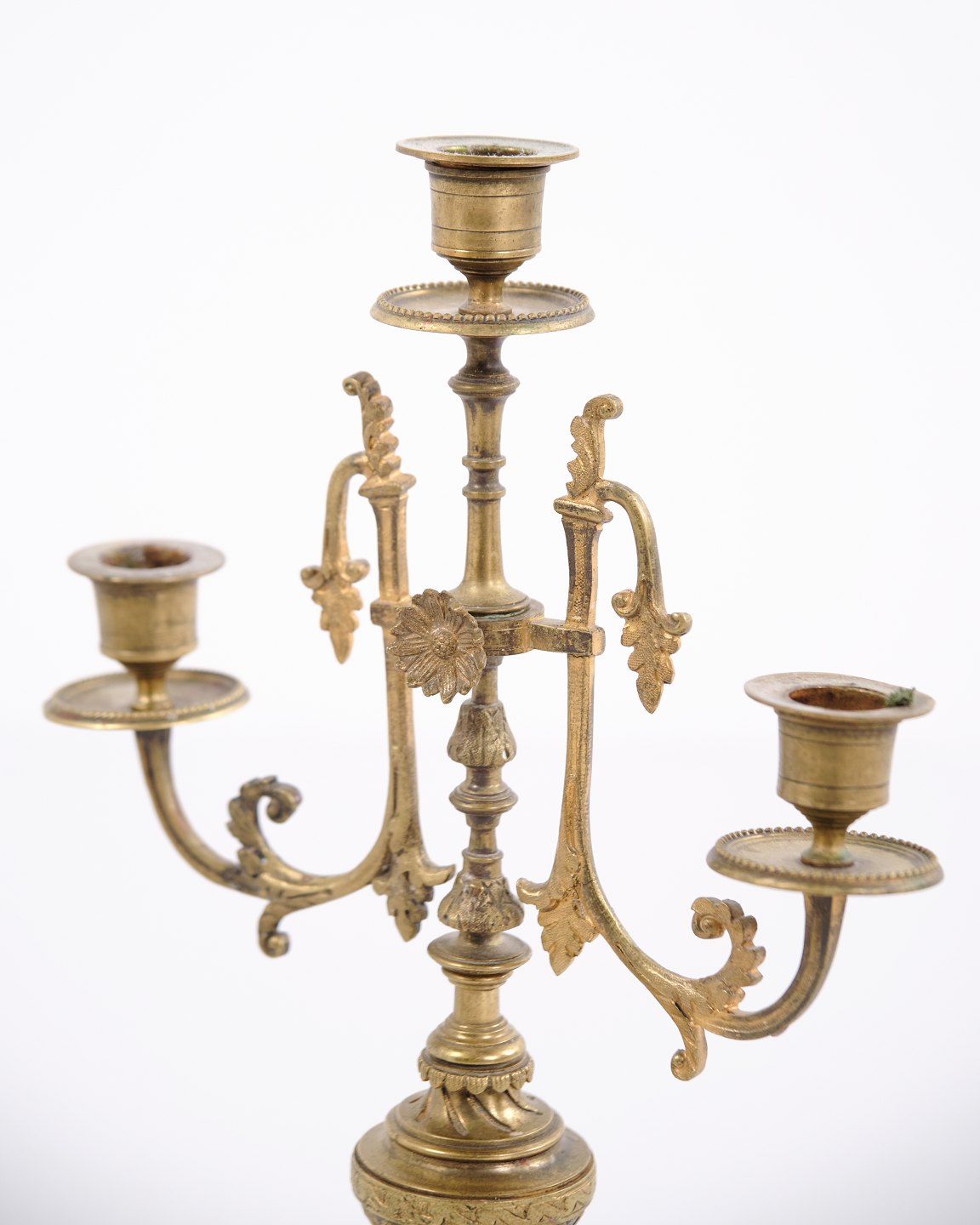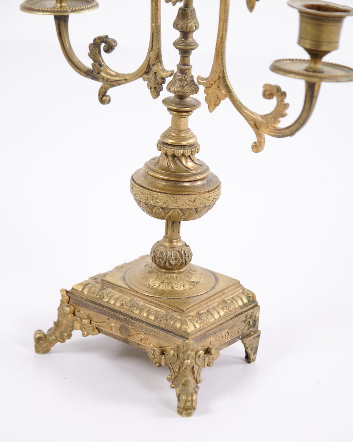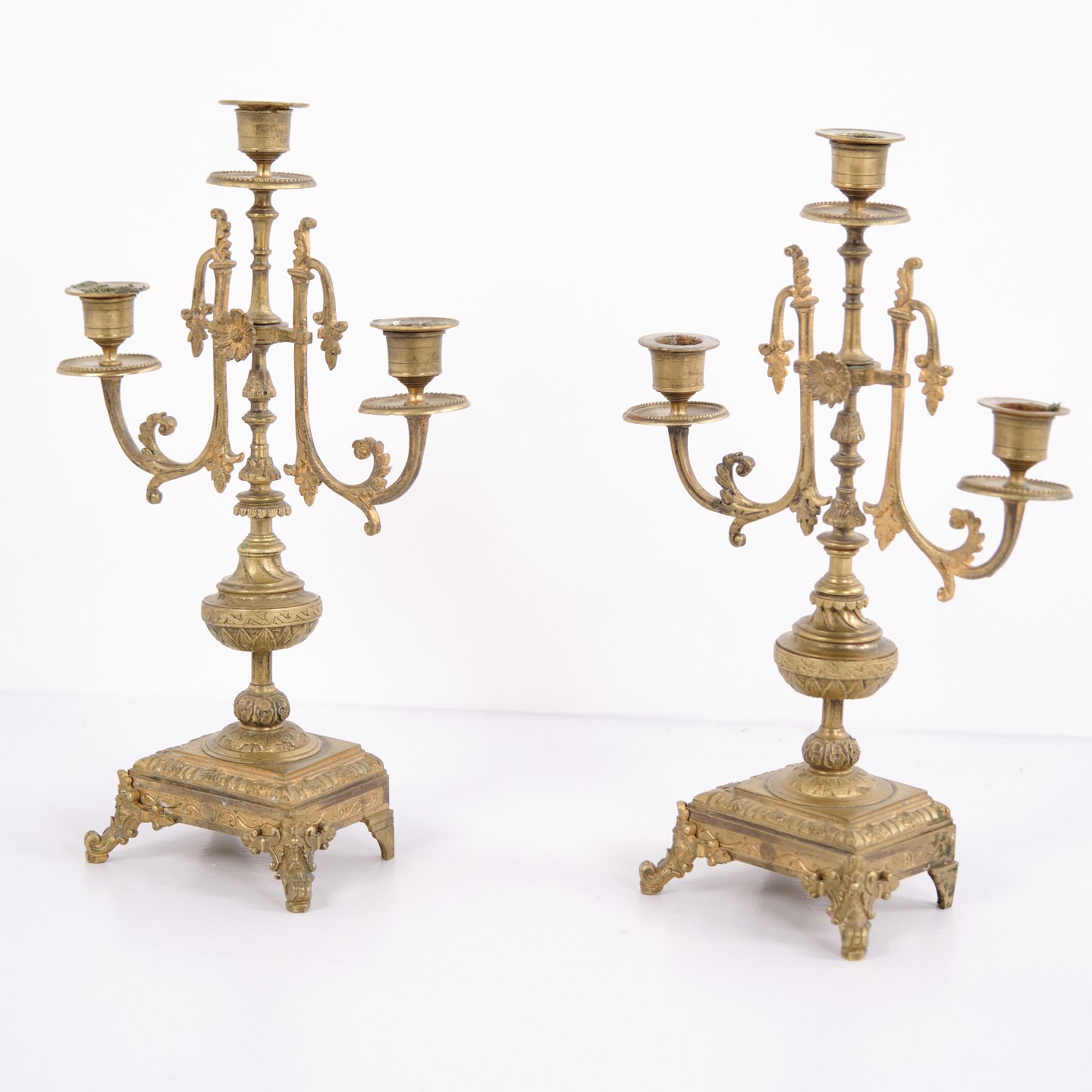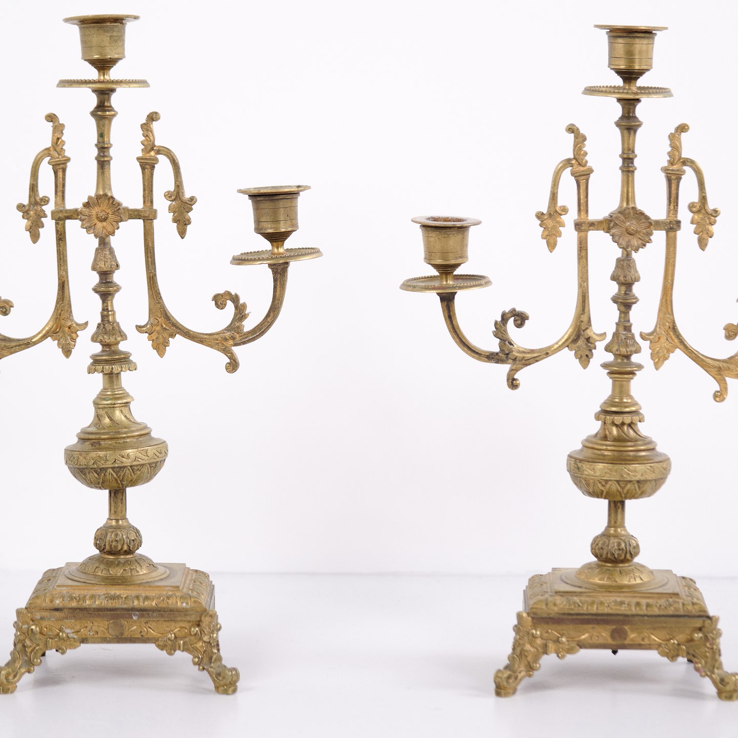 Sæt franske bronze stager fra 1890’erne. Trearmede lysestager med rige udsmykninger og fine detaljer.— Oprindelse: Frankrig