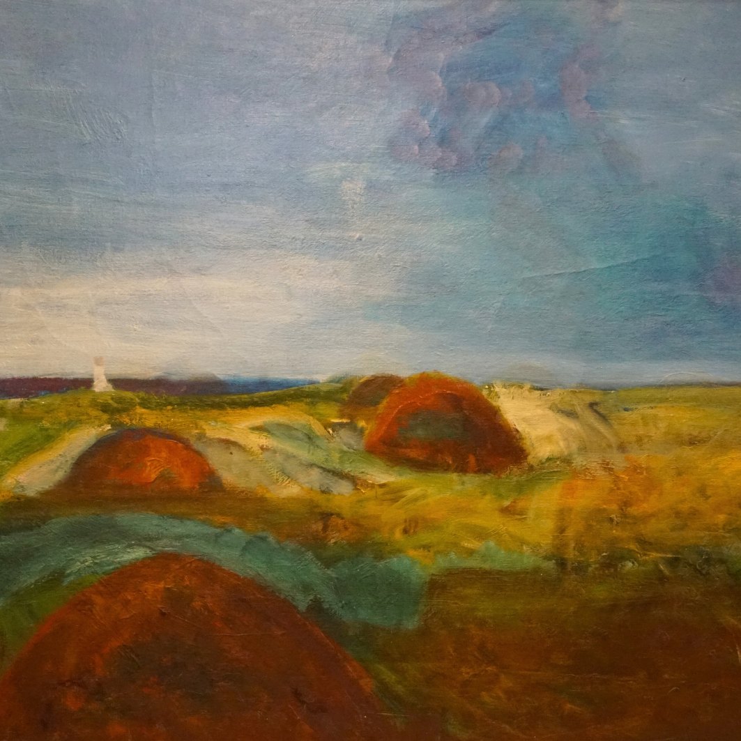 Jens Søndergaard; Landskabsmaleri med marker i forgrunden, samt tårn og hav i baggrunden. Olie på lærred.Signeret "Jens Søndergaard".