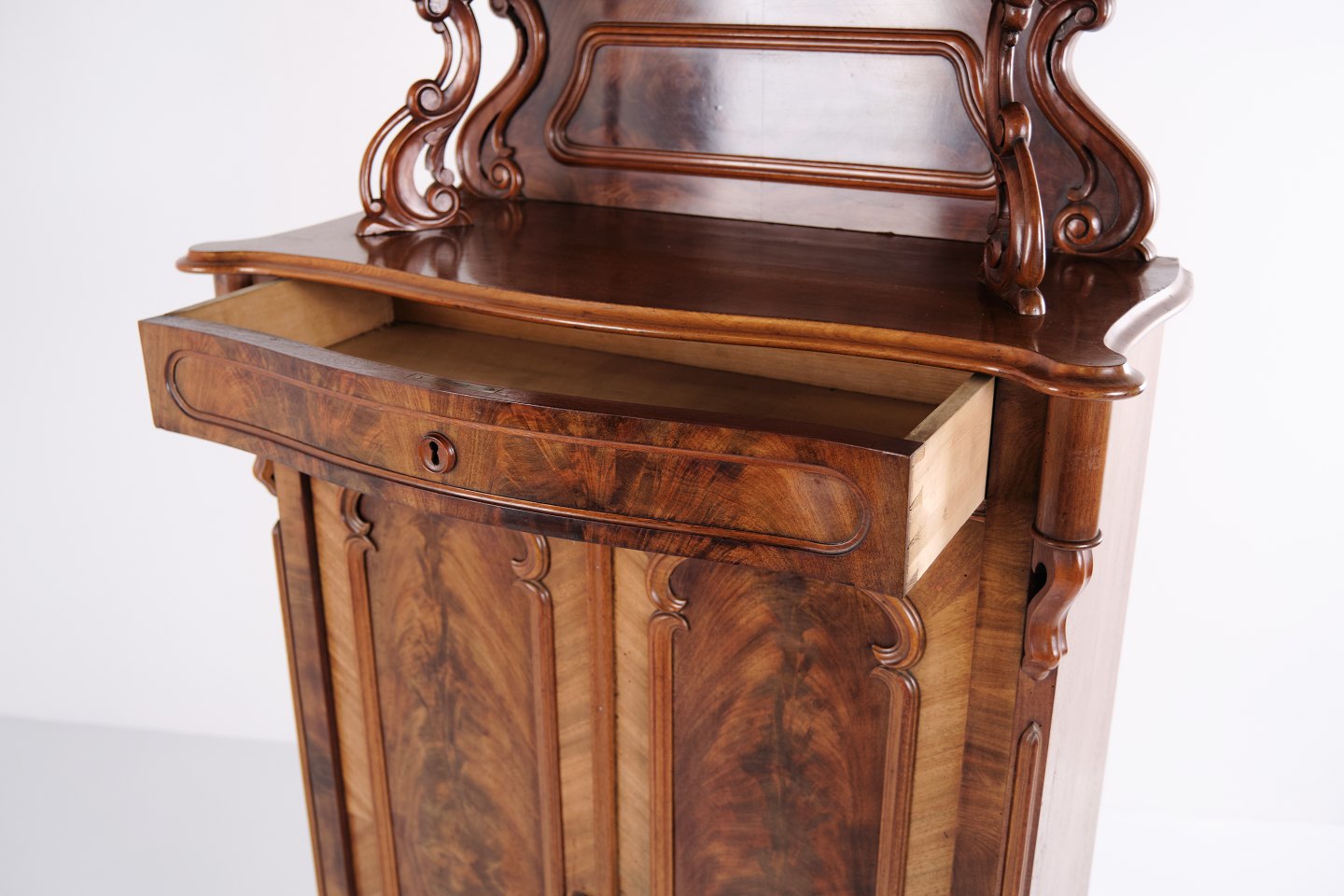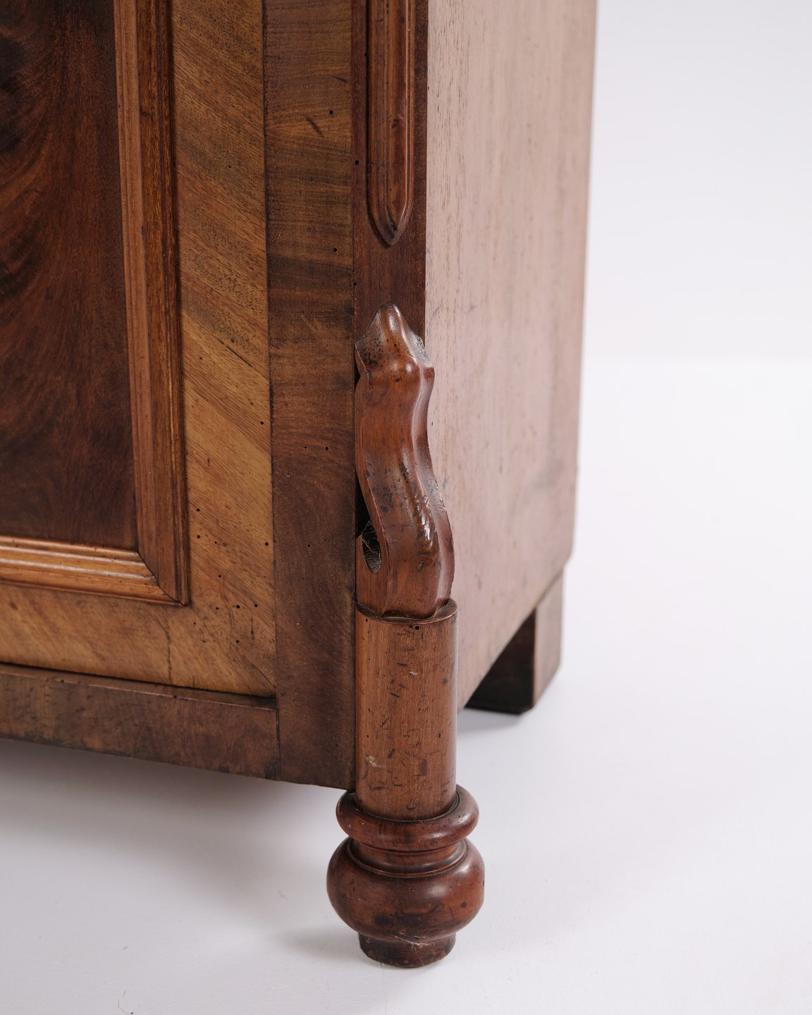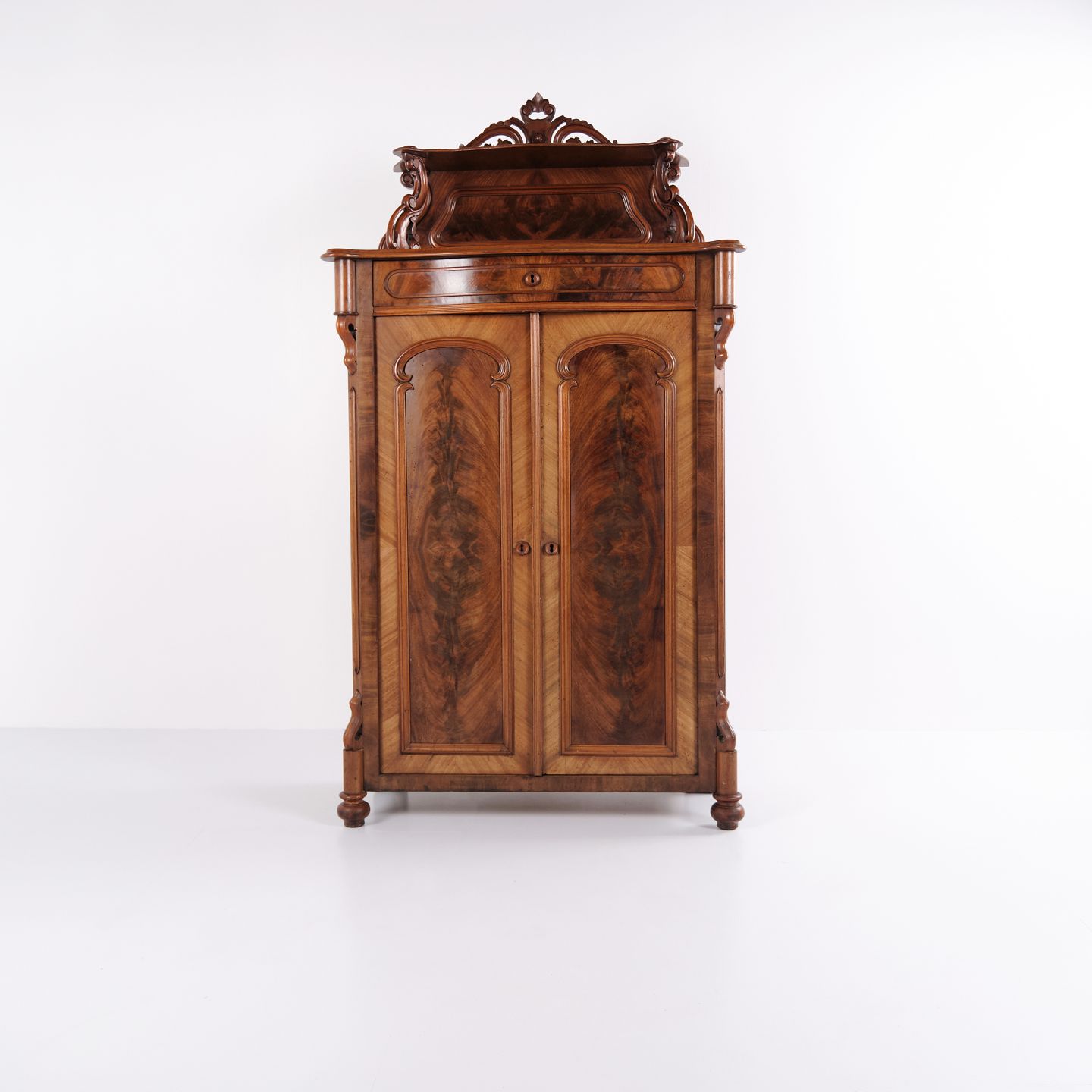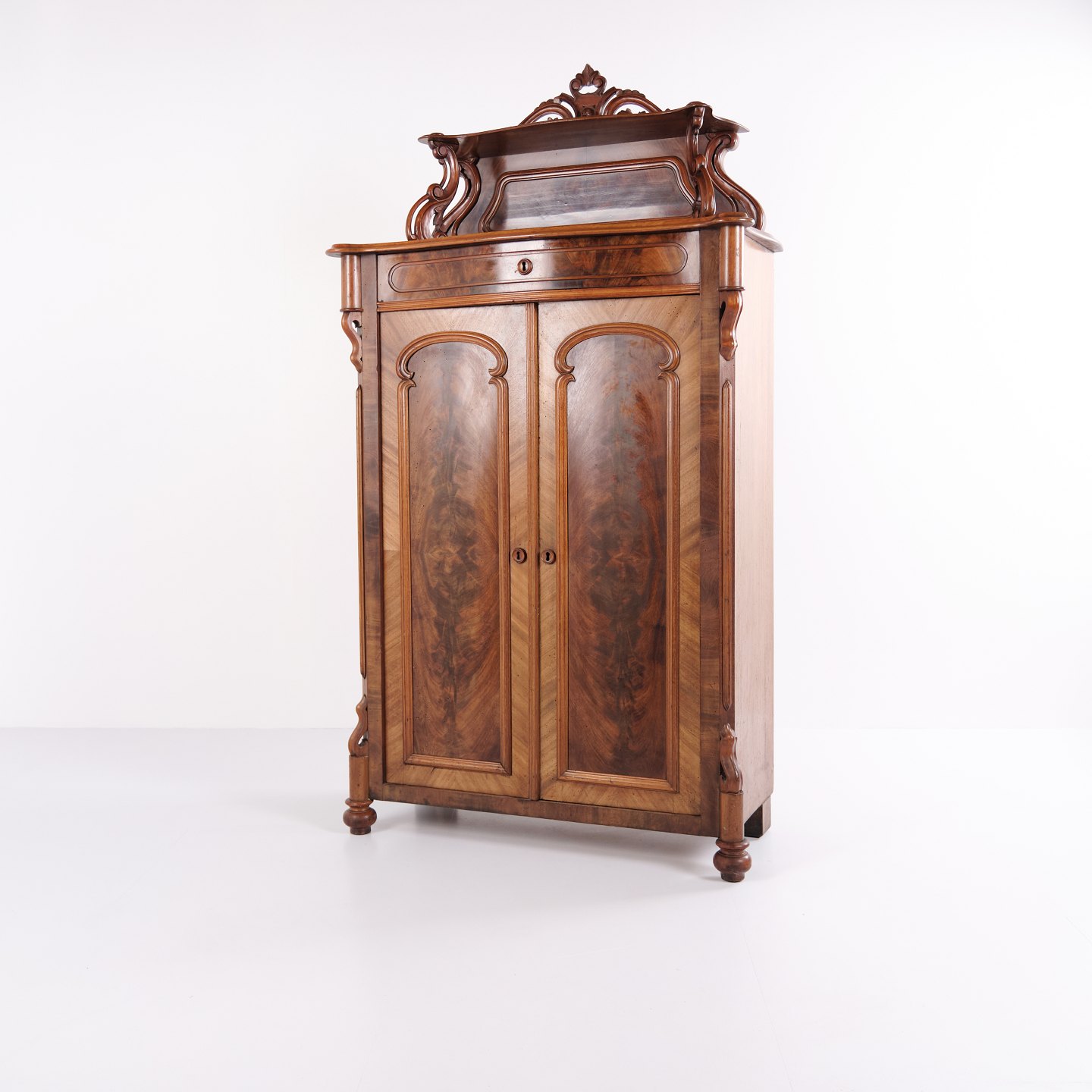 Antikt skab fra 1880’erne, udført i mahogni med dekorative udskæringer. Skabet har låger og indvendige hylder, velegnet til opbevaring i stue, entré eller spisestue.— Oprindelse: Europa
