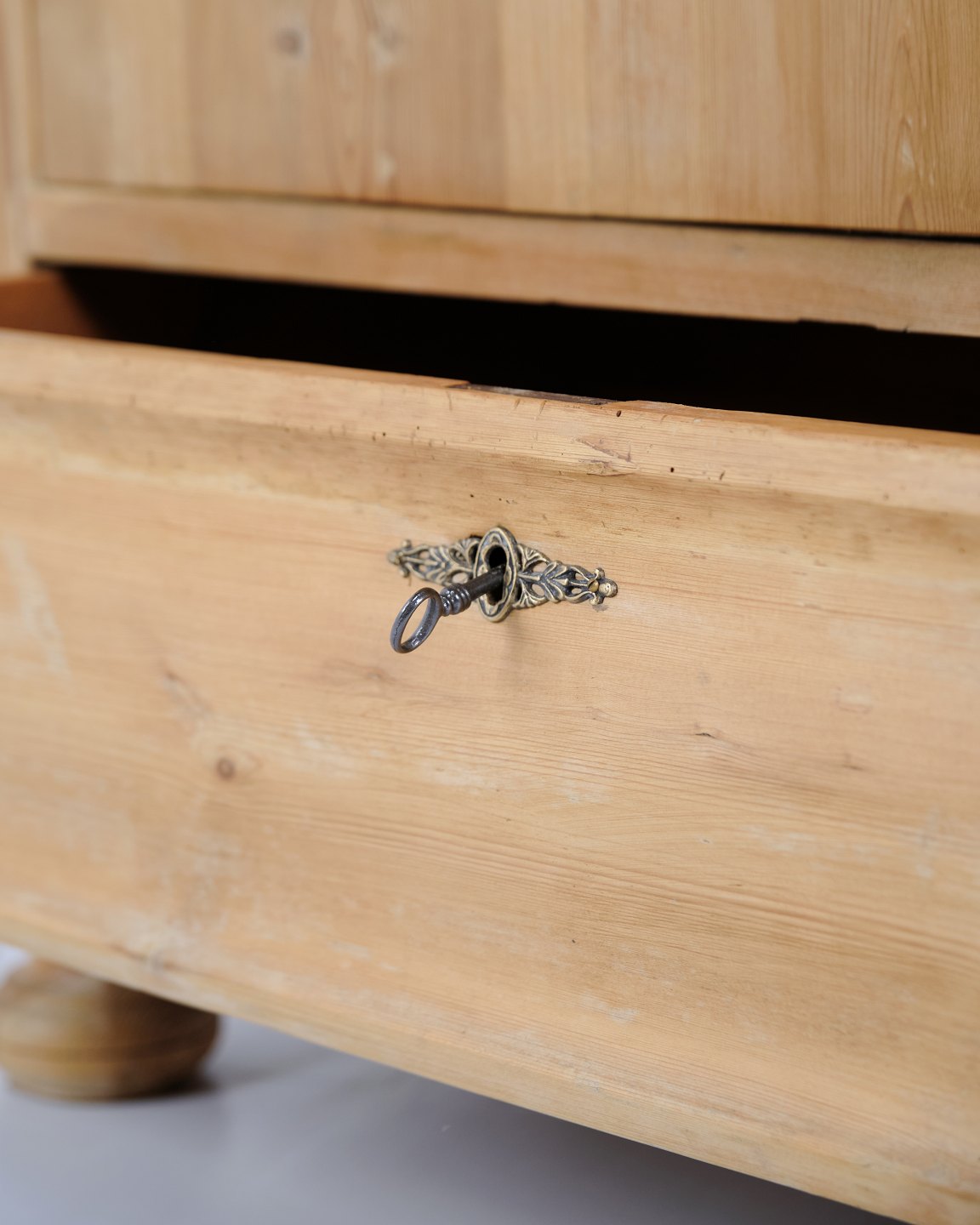Karlekammerskab fra begyndelsen af 1900-tallet, udført i fyrretræ med et enkelt, klassisk formsprog. Skabet står på runde ben og har en frontlåge samt en praktisk skuffe nederst, hvilket giver opbevaringsplads.— Oprindelse: Europa