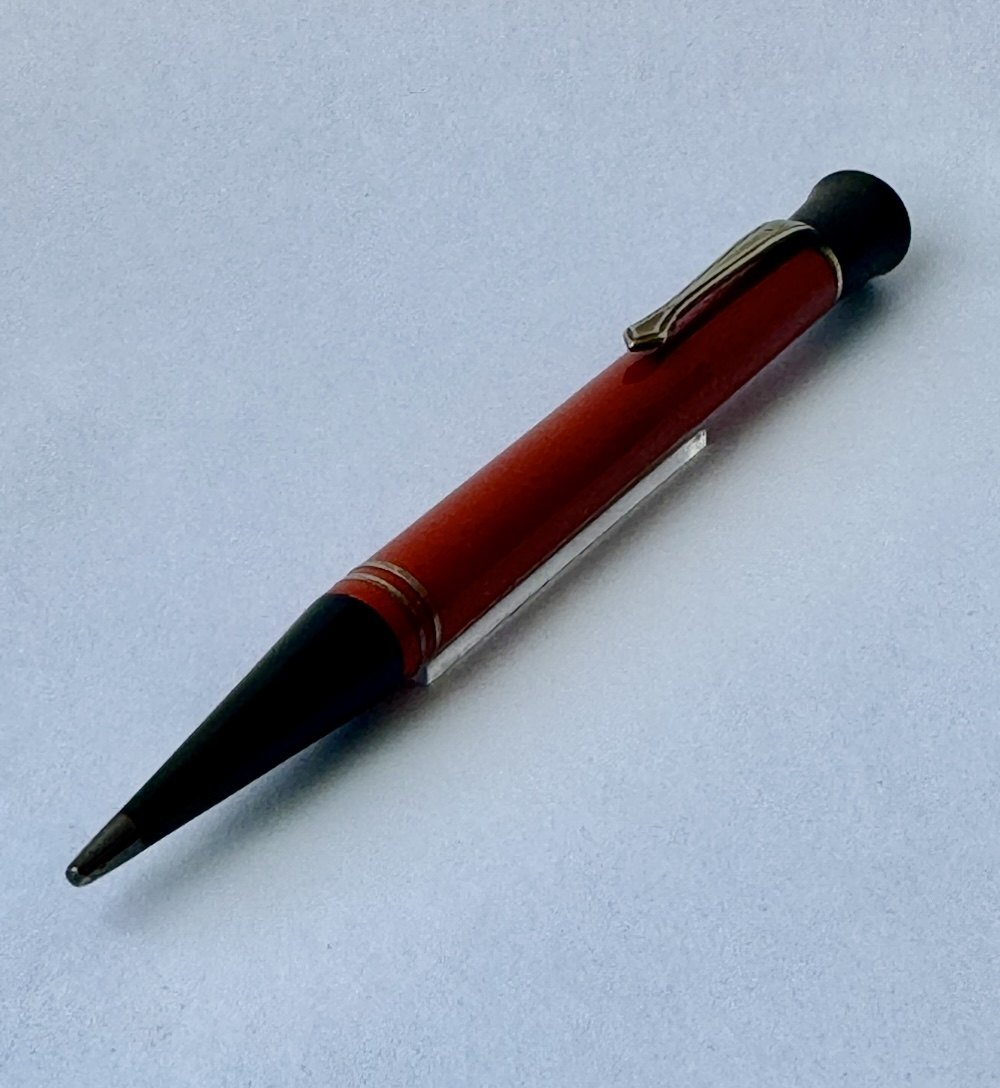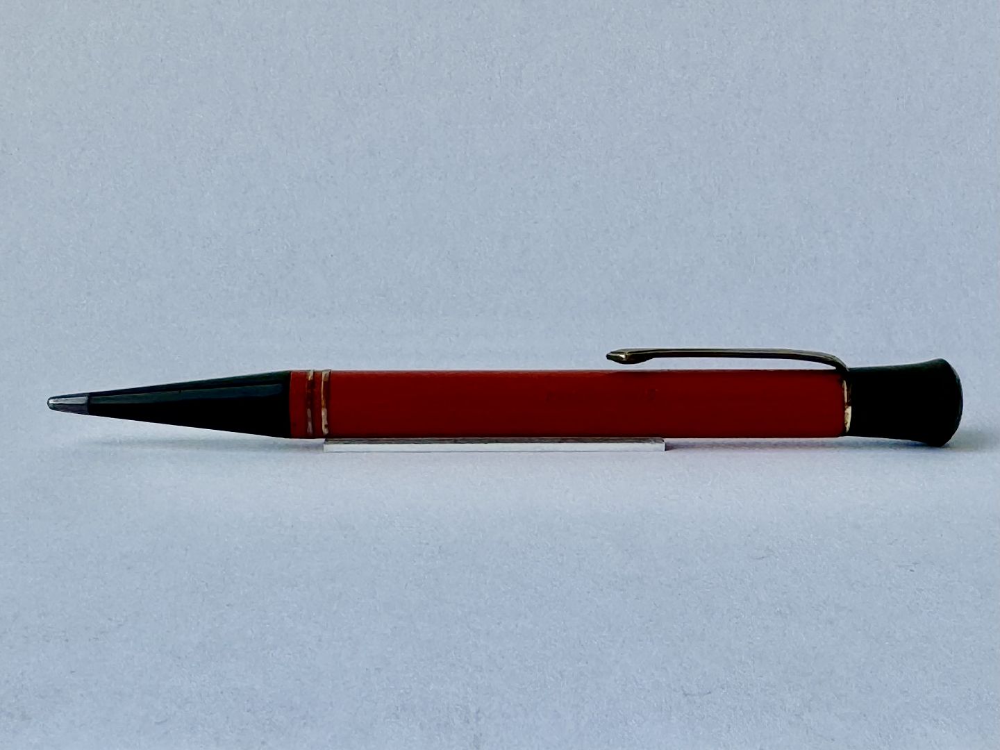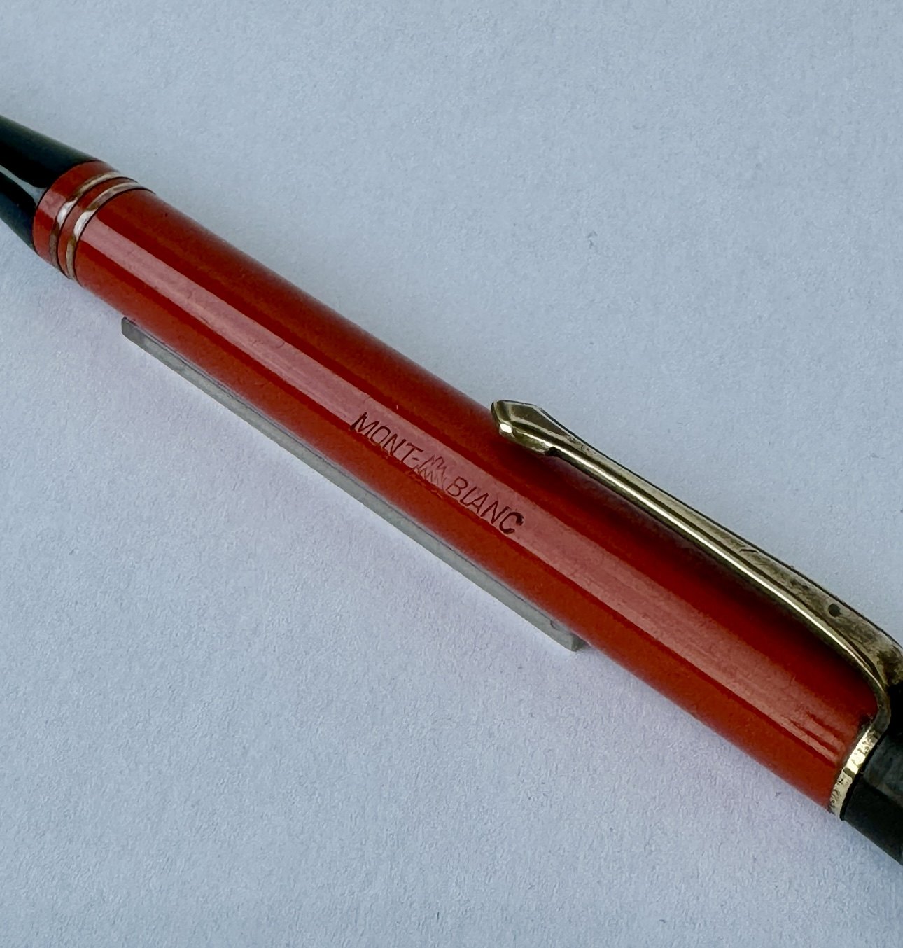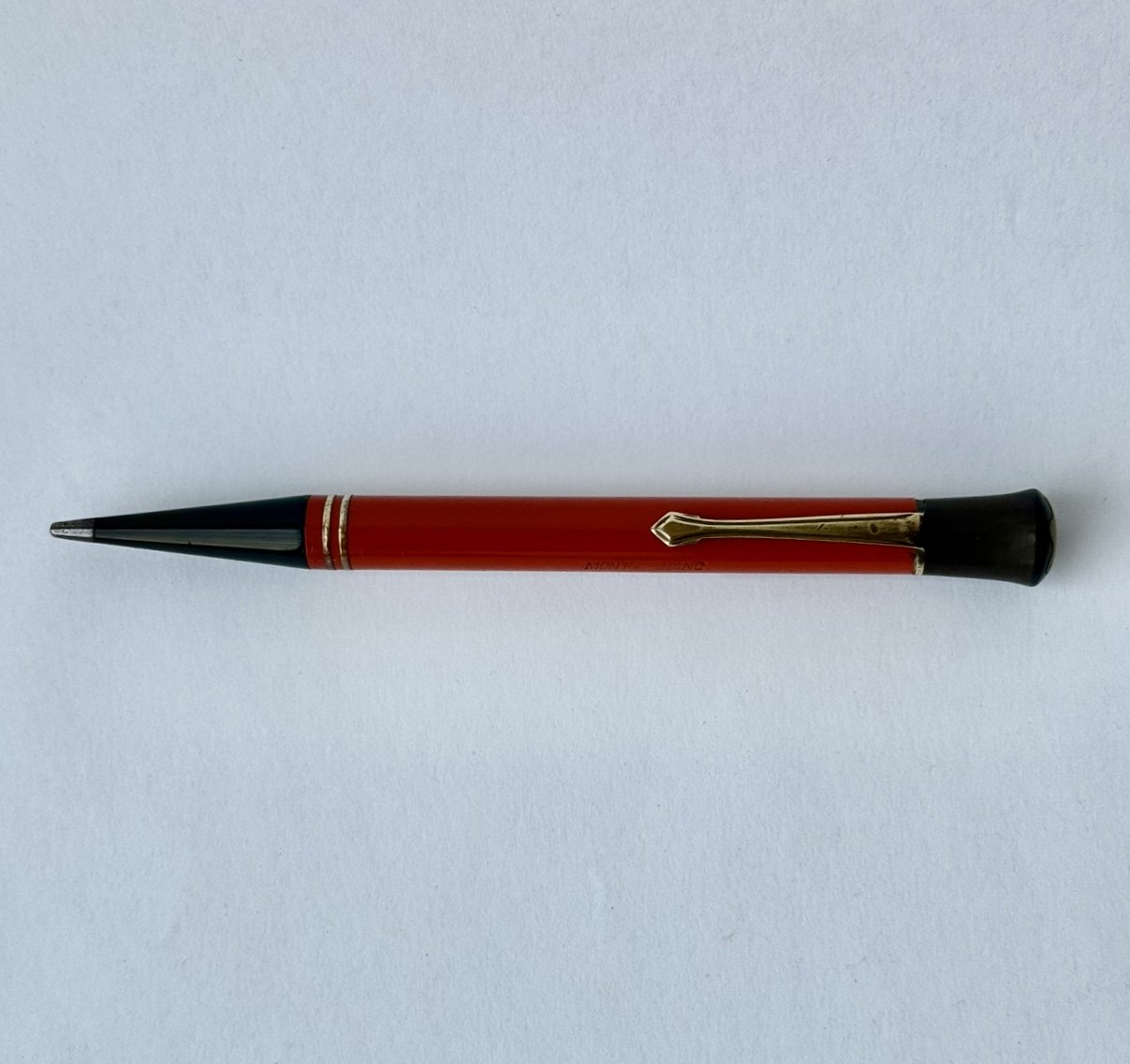 ART DECO PERIODEN: Koralrød Montblanc nr. 53 skrueblyant med stor indsat ben-hvid stjerne på toppen. Fremstillet i 1920’erne. Funktionsduelighed: Blyantsspidsen kan skrues ud, men skal have hjælp til at blive skruet tilbage. Skrues ikke naturligt tilbage når der drejes kontra på toppen. Indprentet Fabriksnavn MONTBLANC samt modelnummer 53. I god stand uden skader. Mål: 13,4 cm langv/ Jesper Reutemann