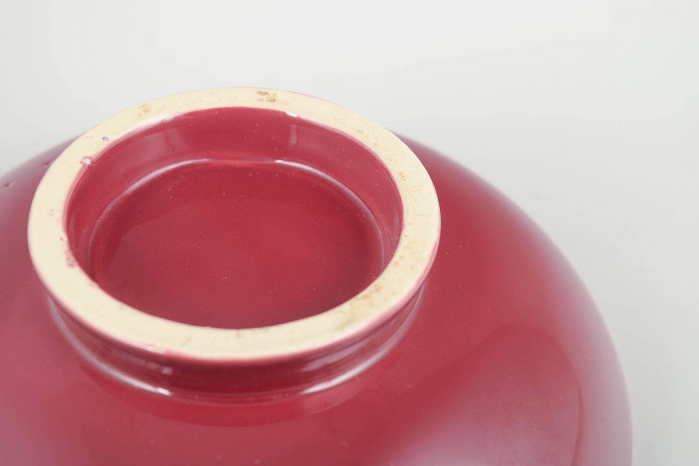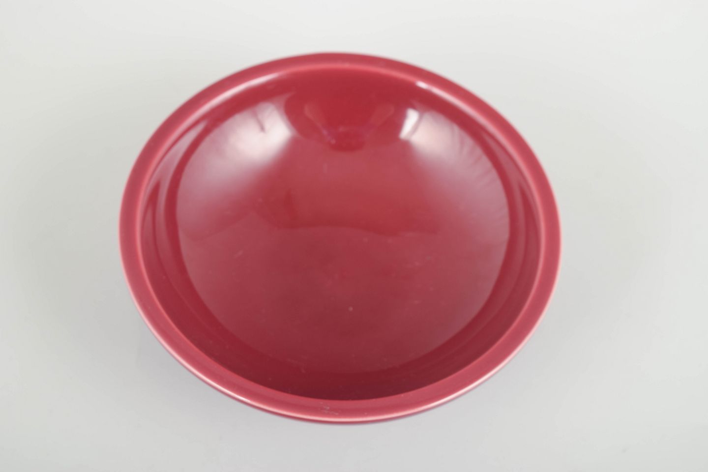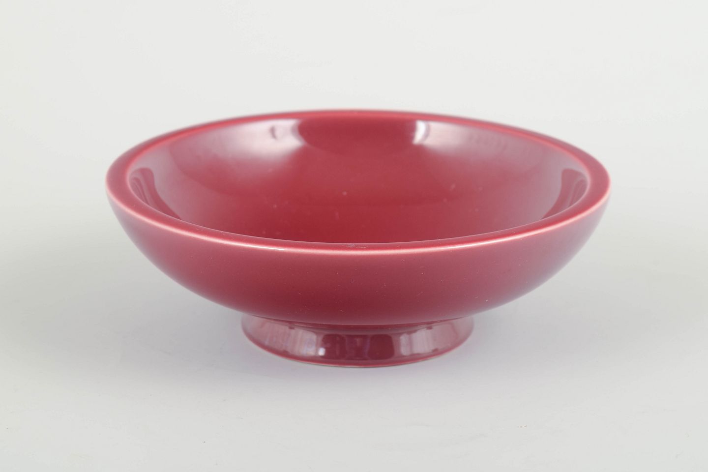 Sjælden skål i rødt glasur, med lav fod og elegant, enkel form.