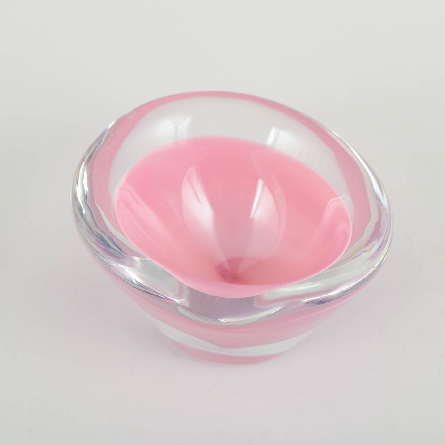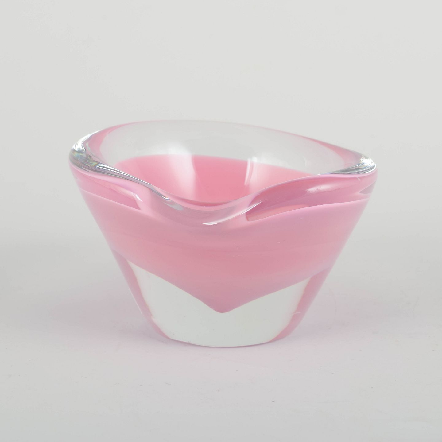 Murano kunstskål, 1960’erne.Lille, organisk formet skål i mundblæst glas med klar kant og lagdelt farvespil i rosa og hvidt, typisk for Murano glas fra perioden.