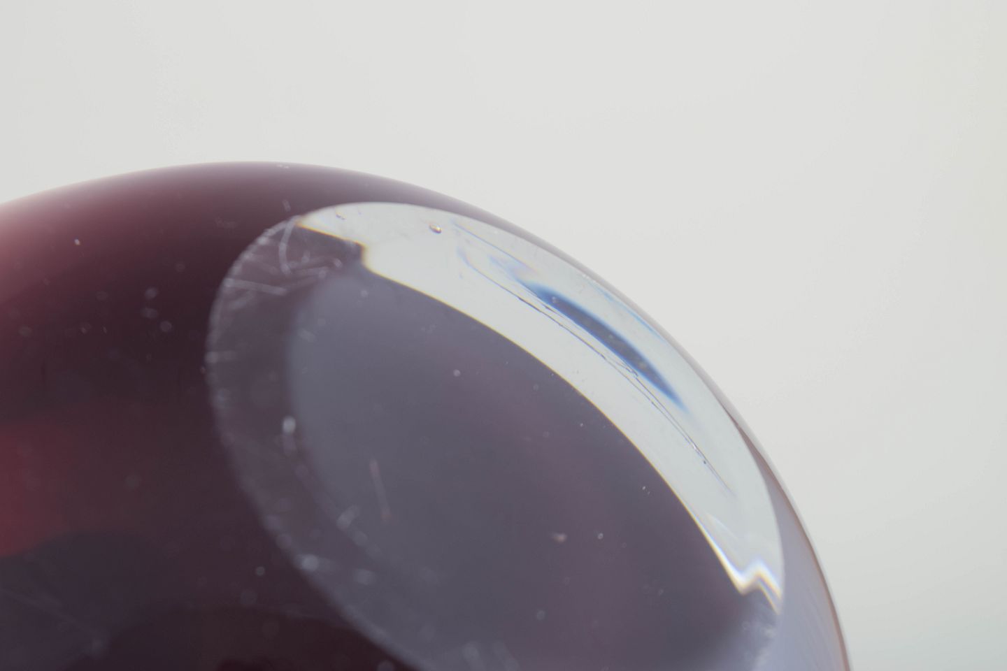 Murano kunstglas skål, 1960’erne.Organisk formet skål i mundblæst glas med lagdelt farvespil i dybe rubin- og klare toner, typisk for Murano-glas fra perioden.