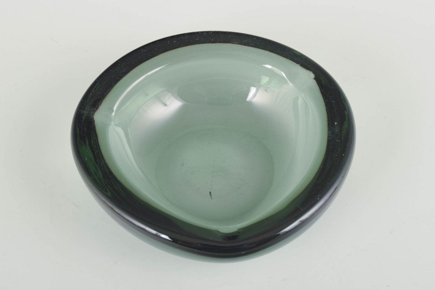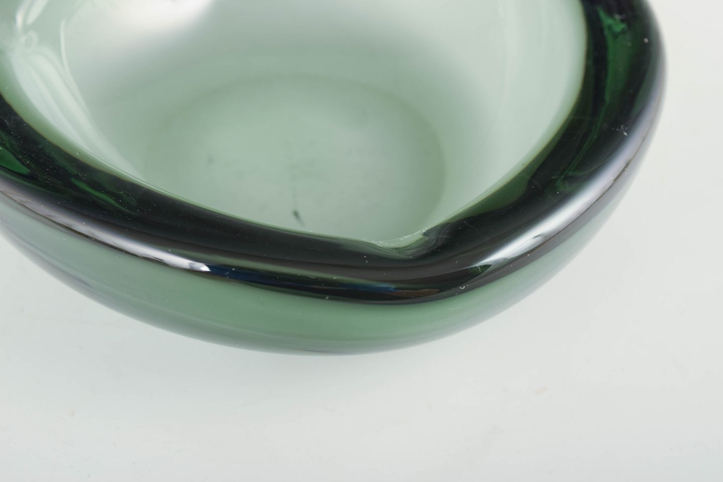 Organisk formet mundblæst skål i grønt glas med tykke vægge og blødt afrundet formgivning, typisk for skandinavisk glasdesign i perioden.
