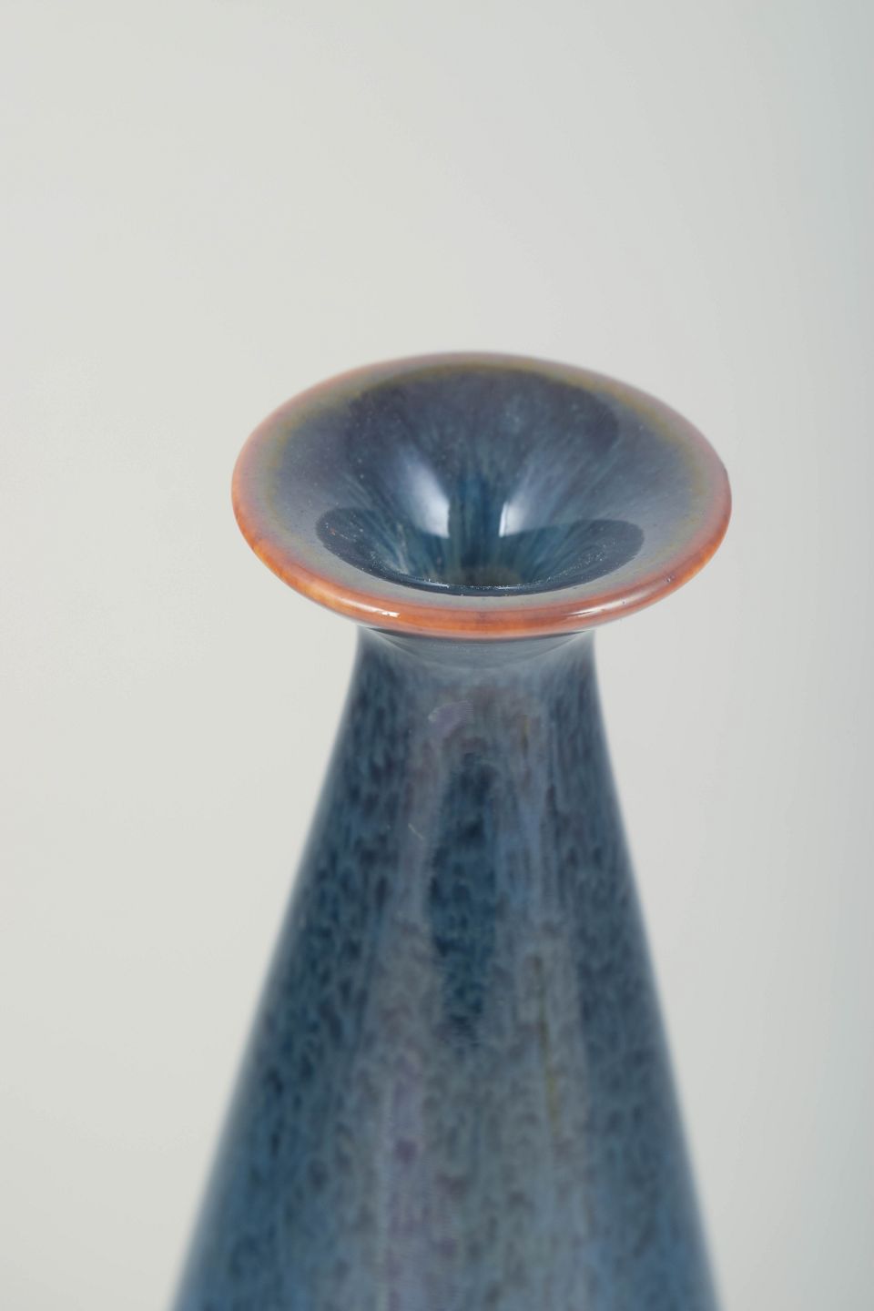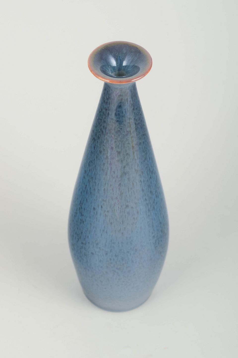 Elegant, dråbeformet vase i stentøj med smal hals og udtrukket kant, dekoreret med en smuk blå glasur med nuanceret prikstruktur og let rødlig kantmarkering ved toppen – et karakteristisk eksempel på Stålhanes raffinerede formsprog og glasurmestring.