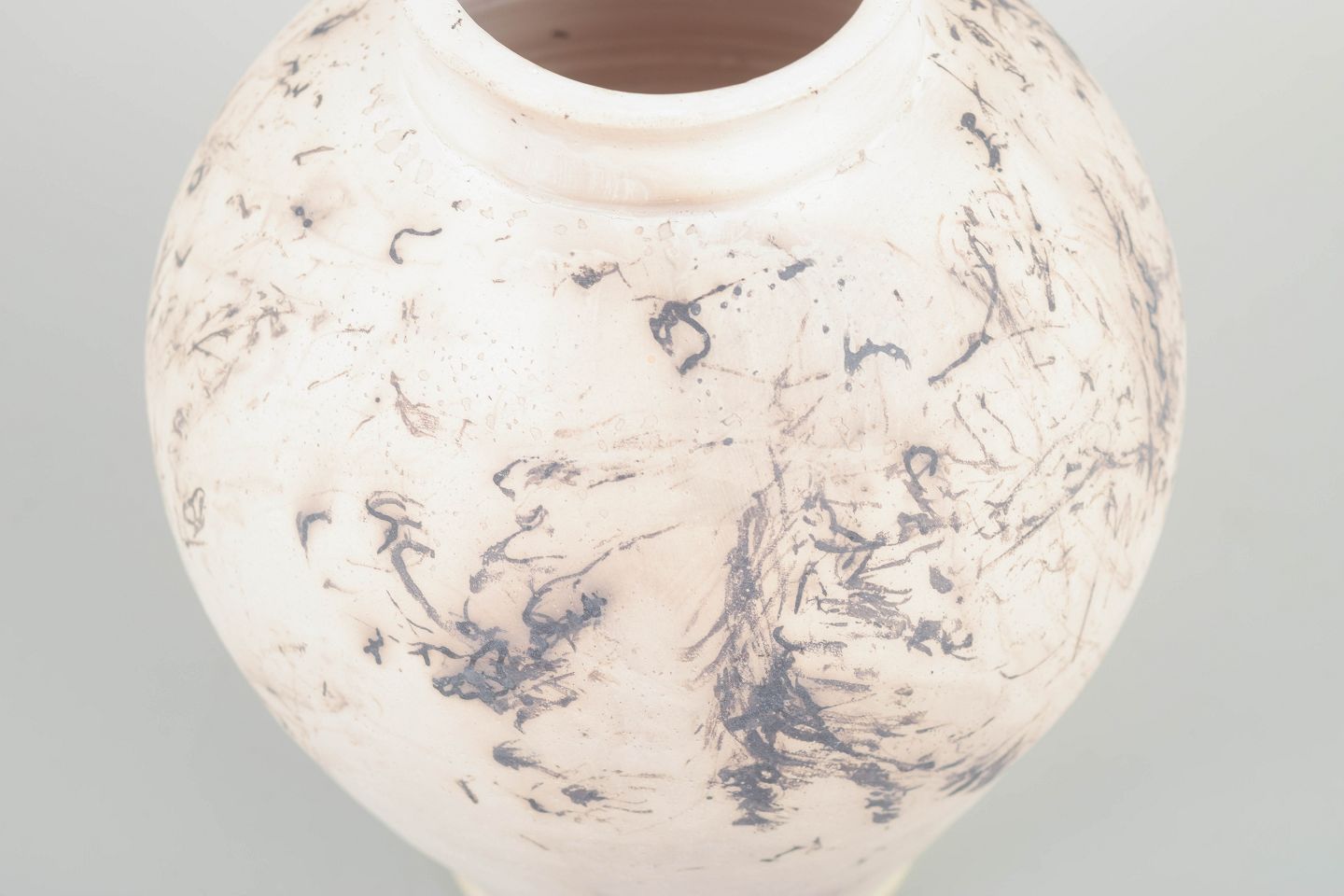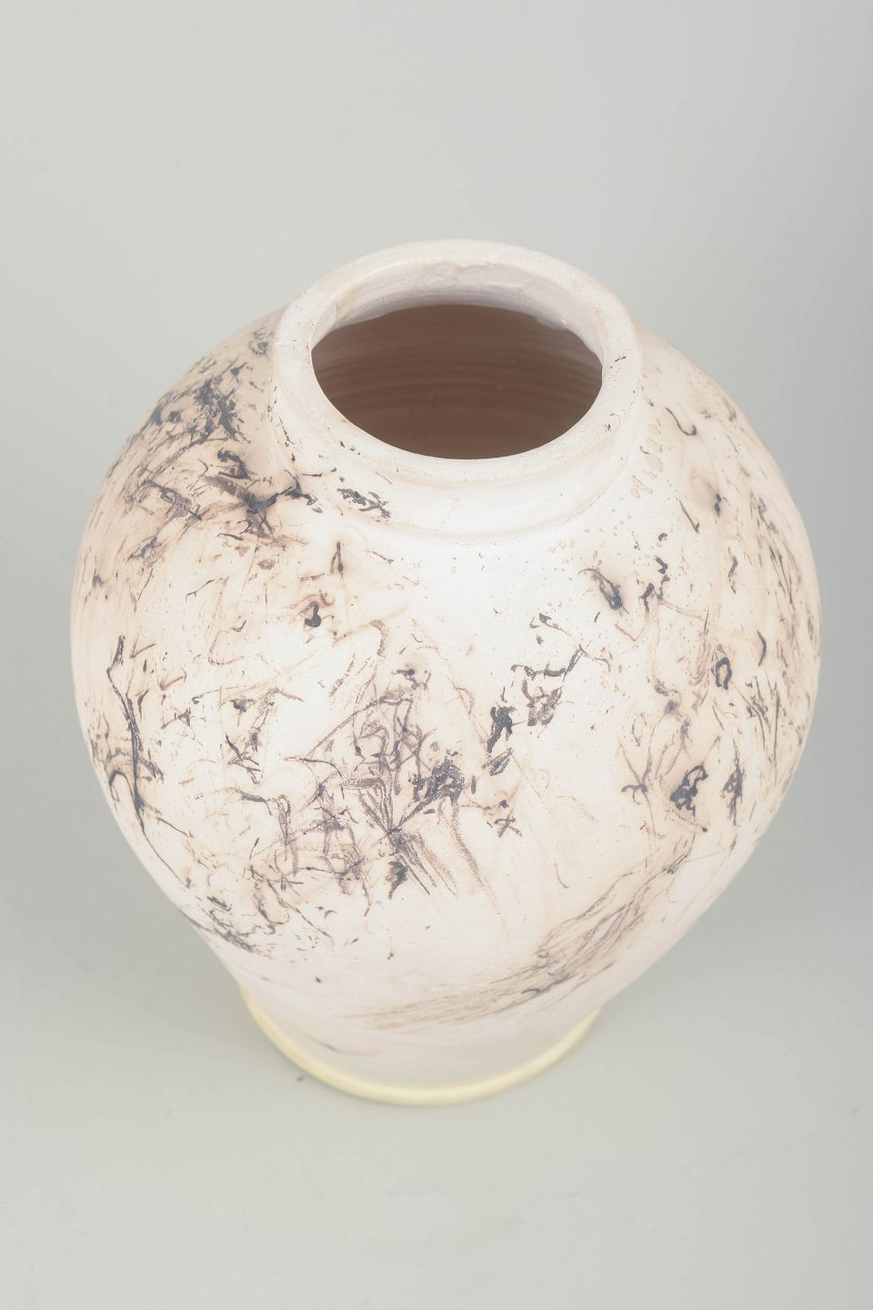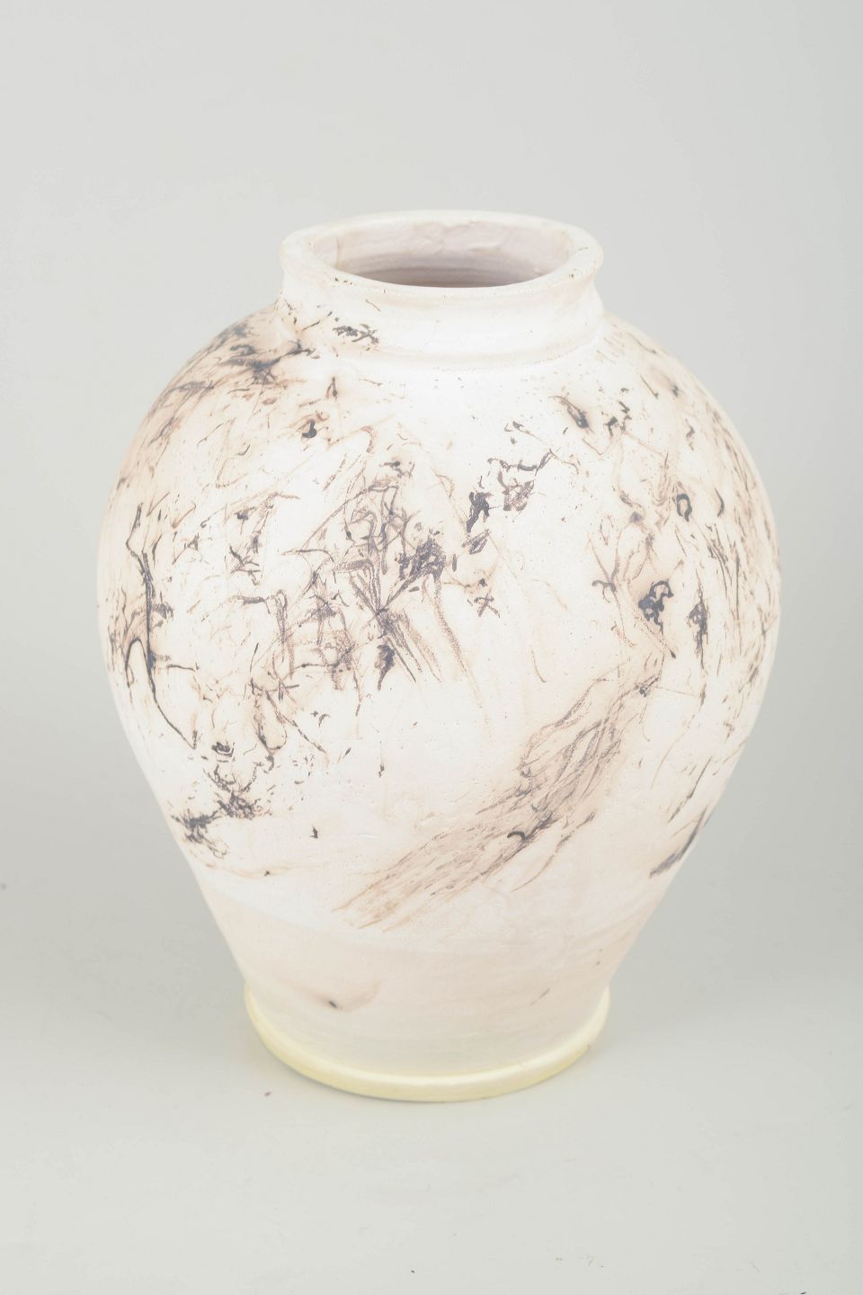 Unik hånddrejet vase i stentøj med lys glasur og karakteristisk marmoreret dekoration i brune og sorte nuancer. Organisk, klassisk form med bred skulder og smal hals. Signeret.