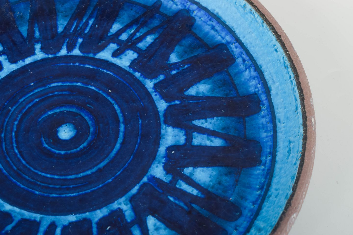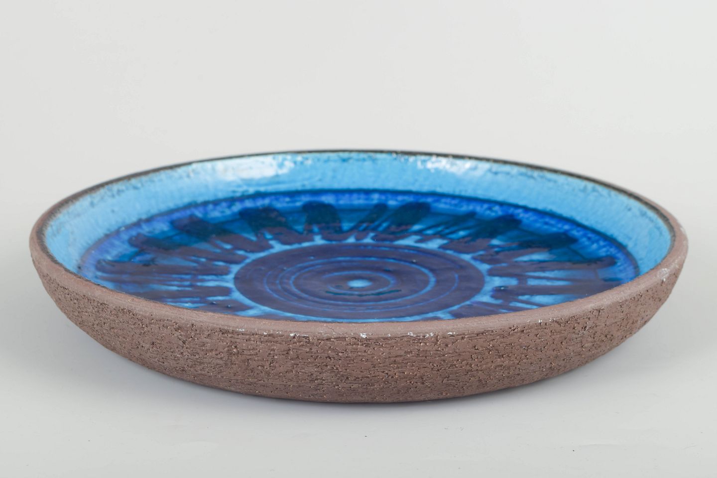 Stentøjsfad med håndmalet dekor i dybe blå nuancer, karakteristisk for Perssons udtryk i Rörstrands atelierproduktion. Koncentriske ringe og radiære penselstrøg skaber et dynamisk, grafisk udtryk.