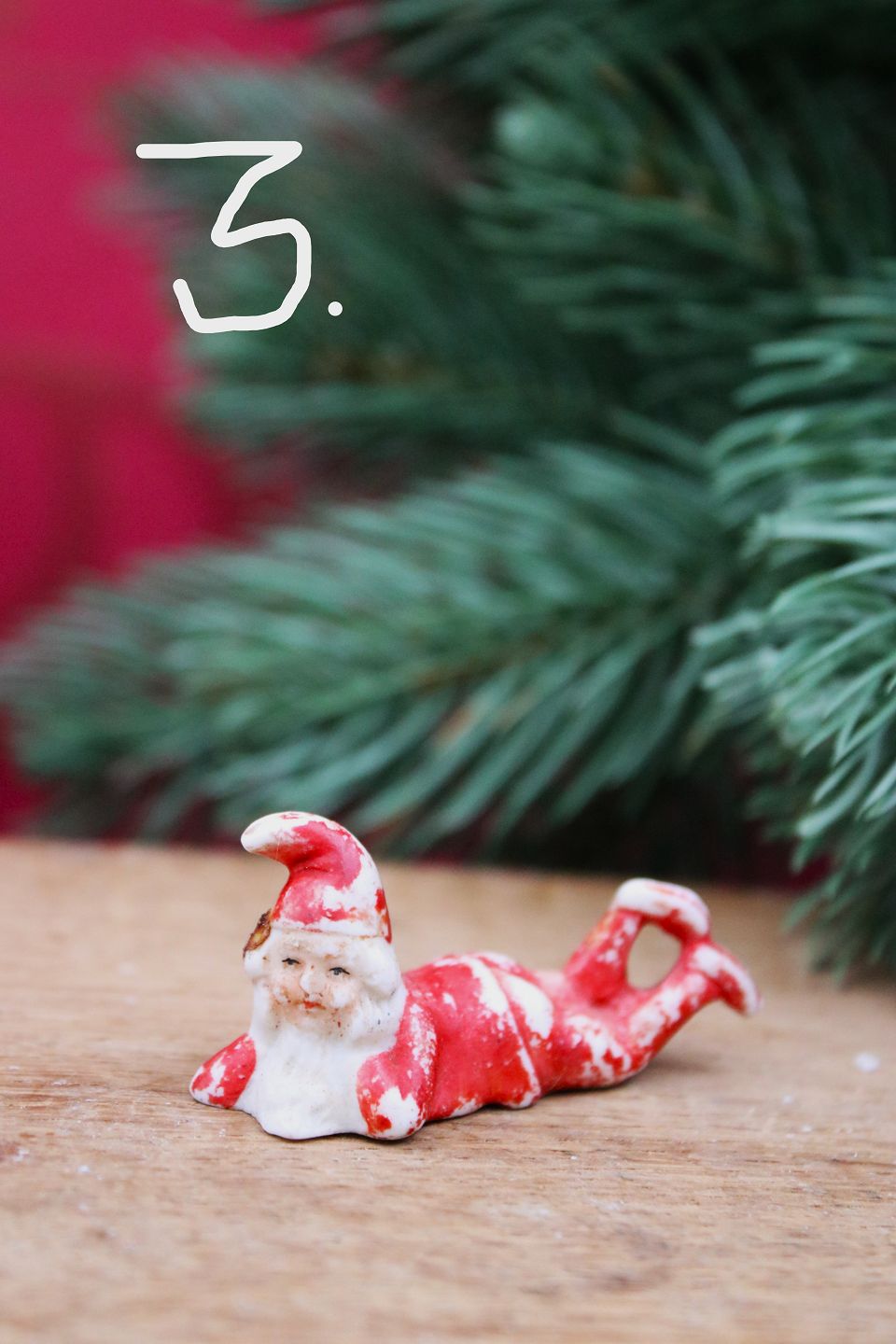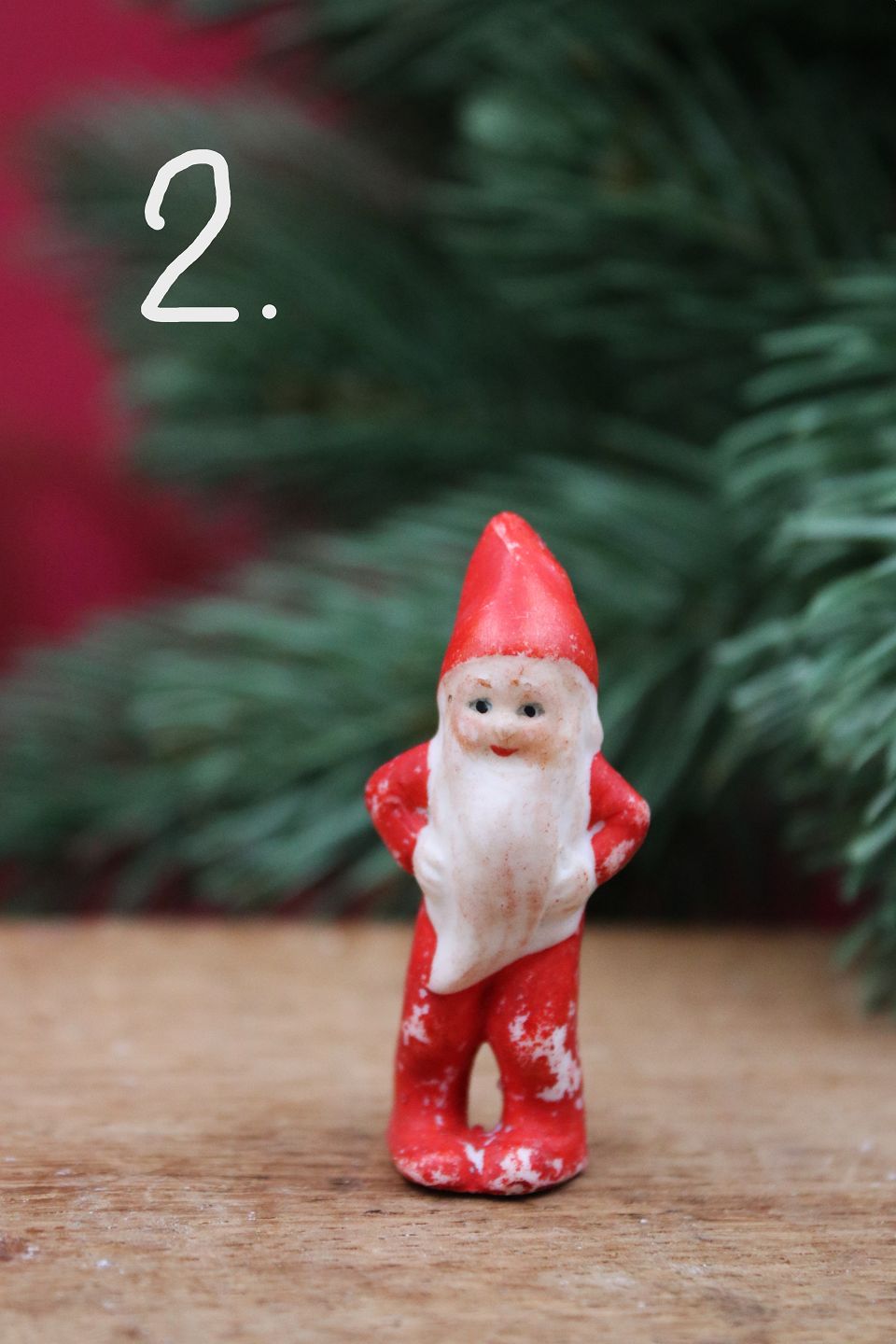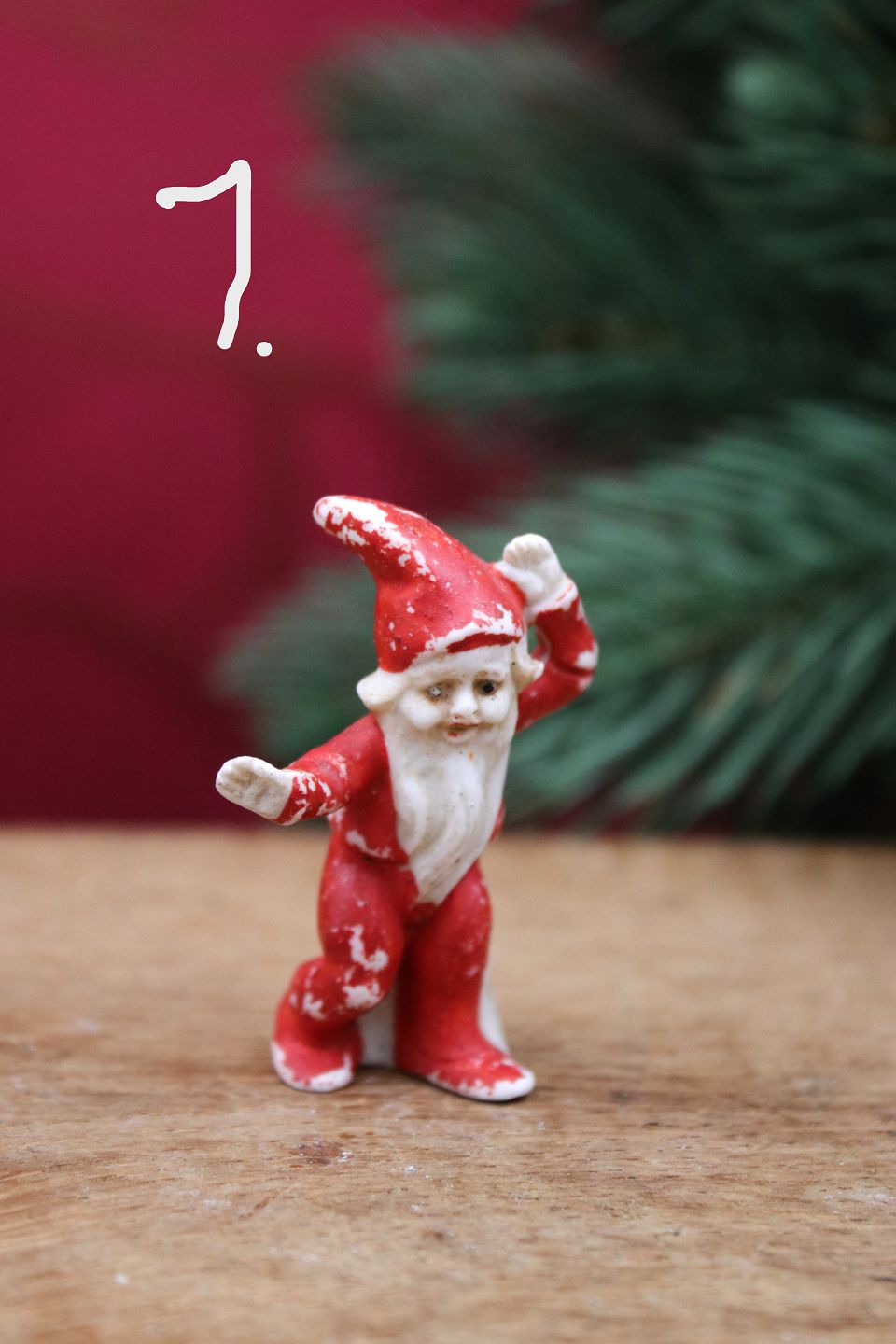 Små gamle biskuit nisser med fin patina.1) H: 4,5cm. 2) H: 4,5cm. 3) H: 2,3cm. L: 5cm.
