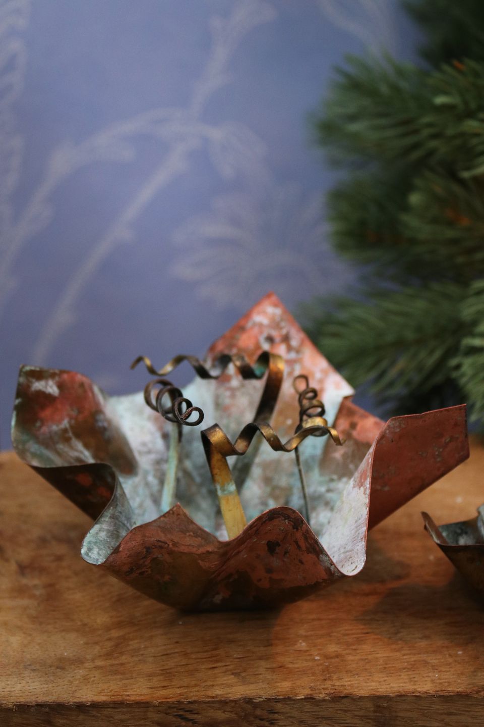Dekorative , ældre kobber stager i 2 størrelser designet af blomsterkunster Tage Andersen.1) Stor : H: 7cm. Dia: 13cm. - PRIS: 850 kr. pr. stk. (3 stk. haves)