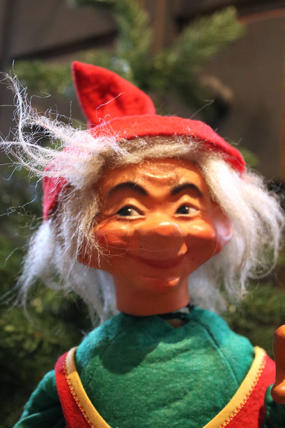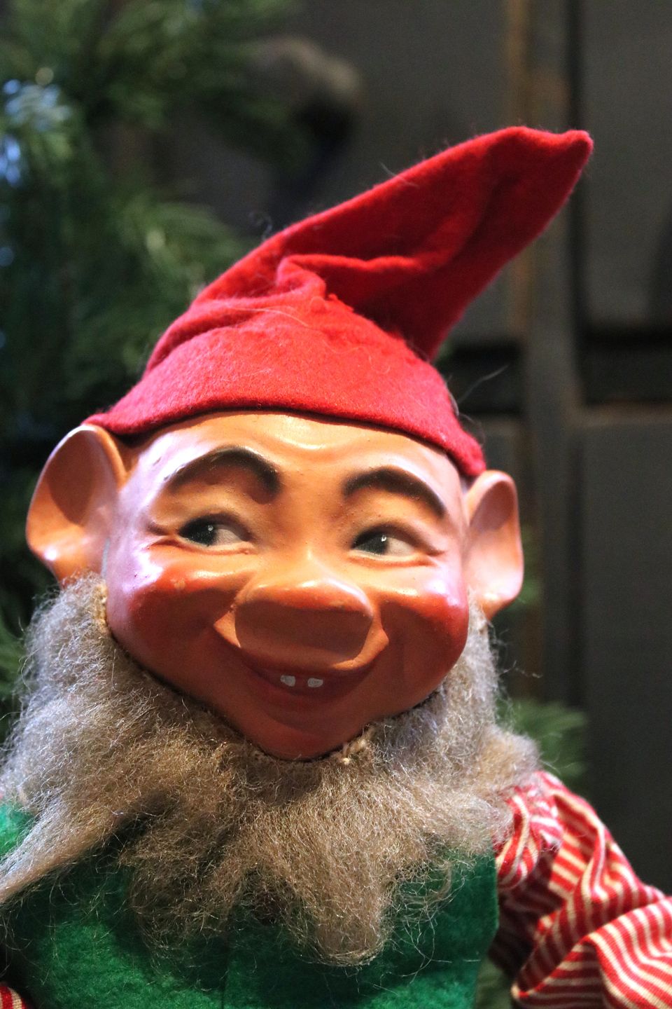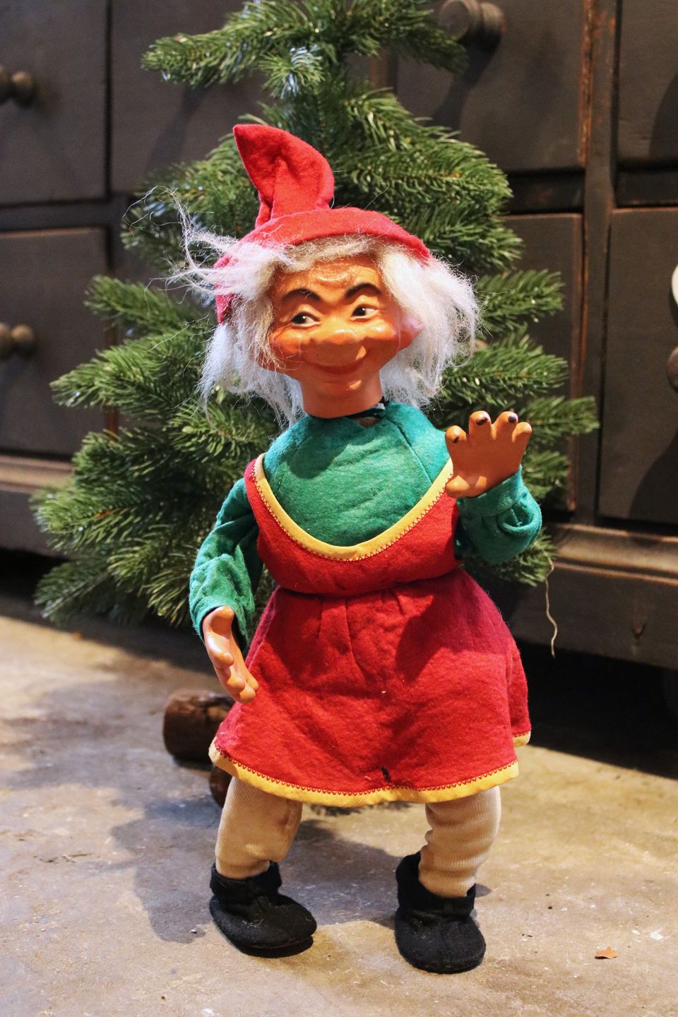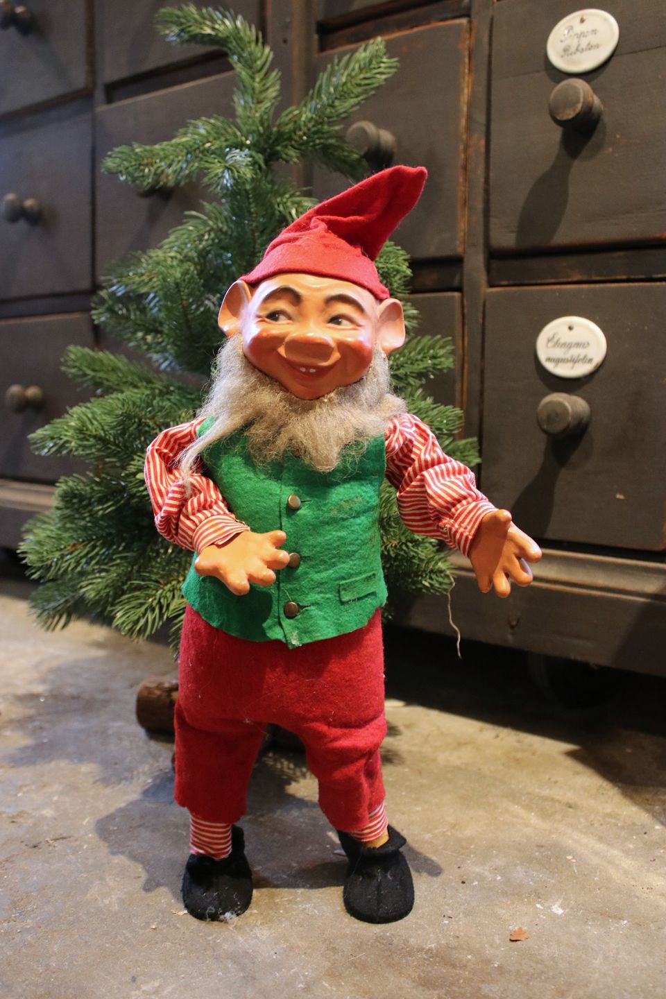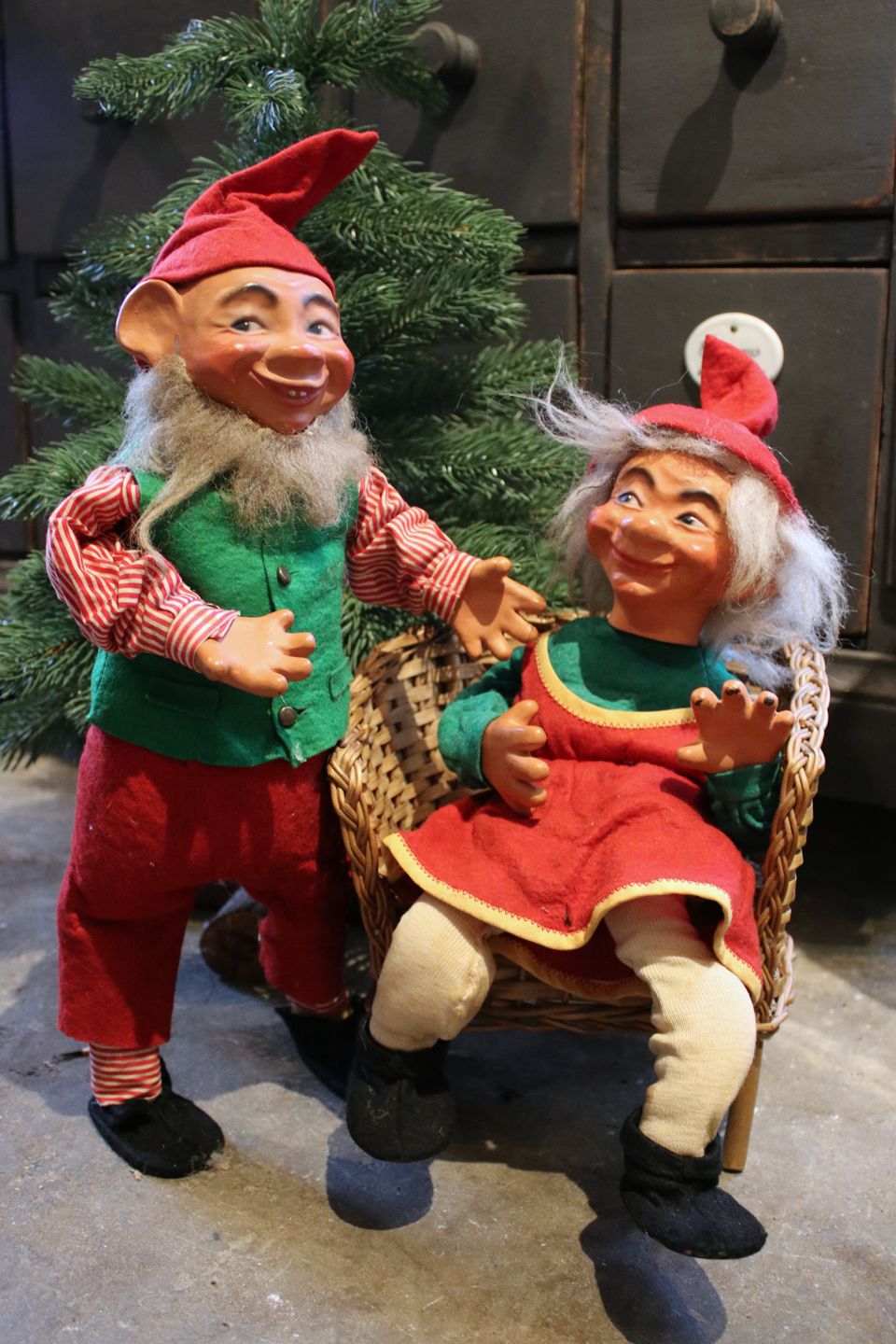2 gamle butiksnisser med filt tøj og ansigt i bemalet papmache.(Nissemor og Nissefar) Højde: 40cm.