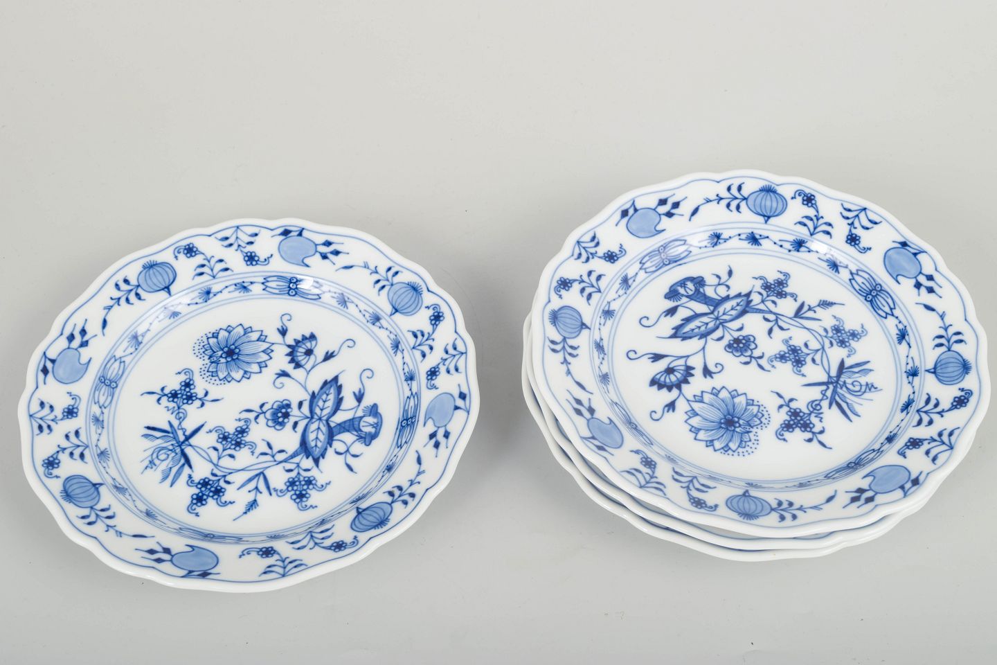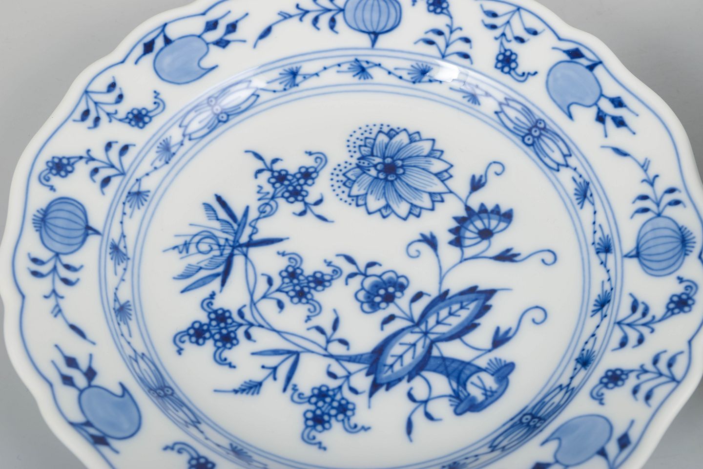 Meissens Zwiebelmuster blev introduceret i 1730’erne og er blandt Europas mest ikoniske porcelænsdekorationer. Mønstret håndmales fortsat i koboltblå underglasur, hvilket giver hver genstand en unik karakter. Senere 1900-tals eksempler er værdsat for deres rene håndværkstradition og høje brugskvalitet.