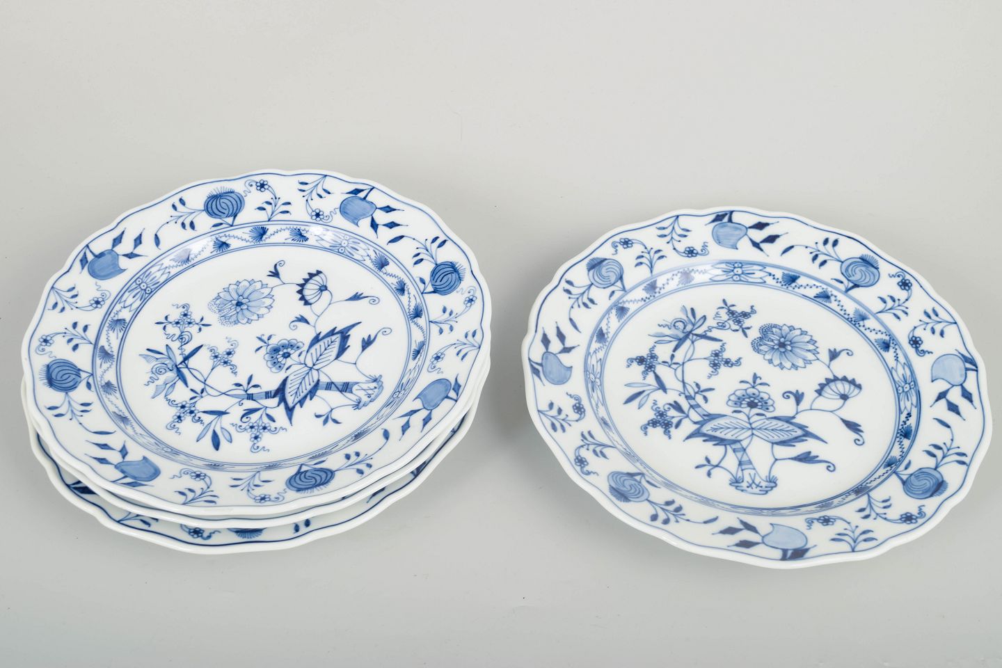Fire klassiske Meissen tallerkener i det ikoniske løgmønstret med bølget kant og håndmalet blå underglasurdekoration. Et tidligt 20.-århundredes sæt i fin kvalitet.