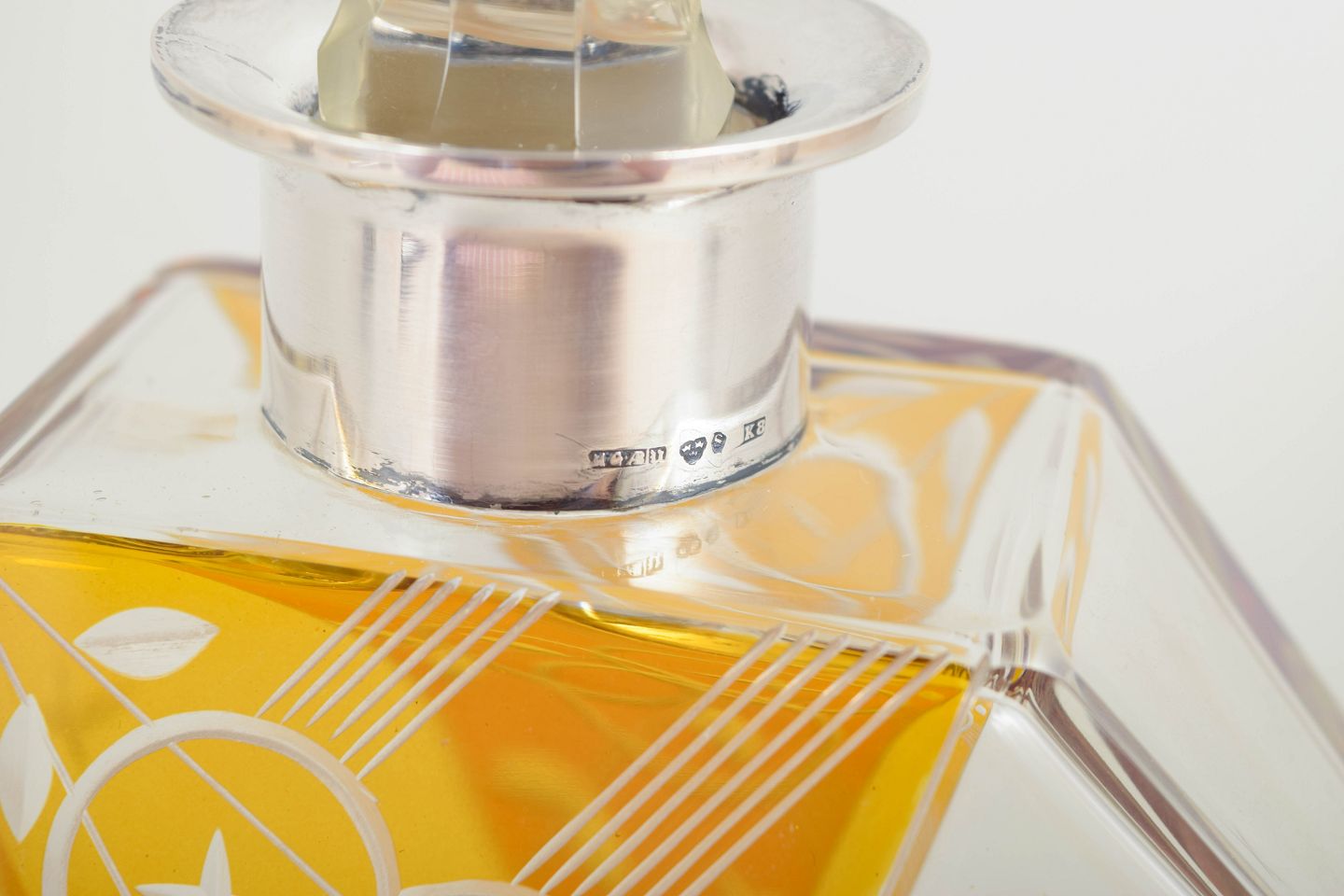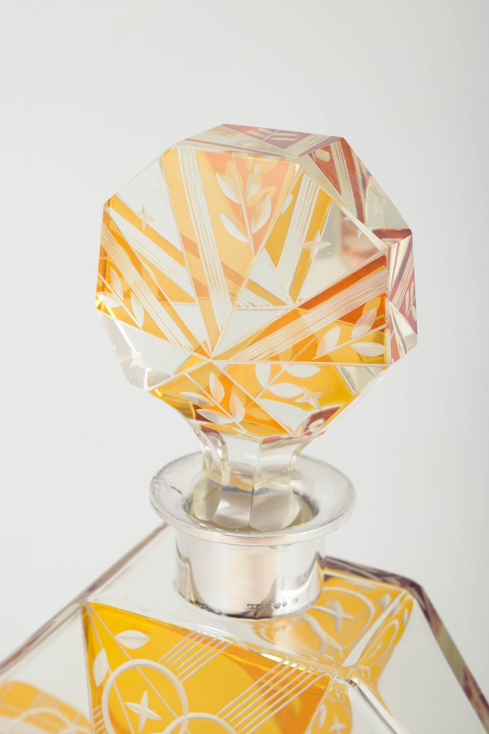 Svensk Art Deco karaffel i krystalglas med sølvmontre, 1920/30’erne.Facetteret Art Deco-karaffel i slebet og dekoreret krystalglas med orange/guldtonet krystalglasur og geometriske ornamenter. Original facetteret prop og sølvmontering.