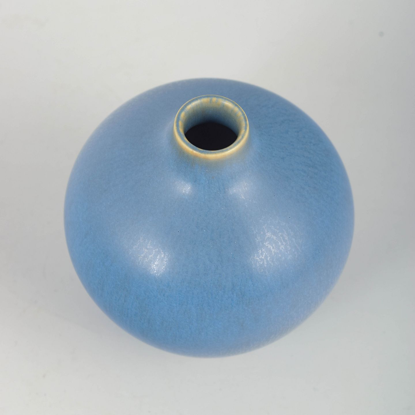 Smuk, lille stentøjsvase i klassisk afrundet form med silkemat lyseblå glasur og diskret nuanceret overflade. Typisk for Per Linnemann-Schmidts elegante, rene formsprog.