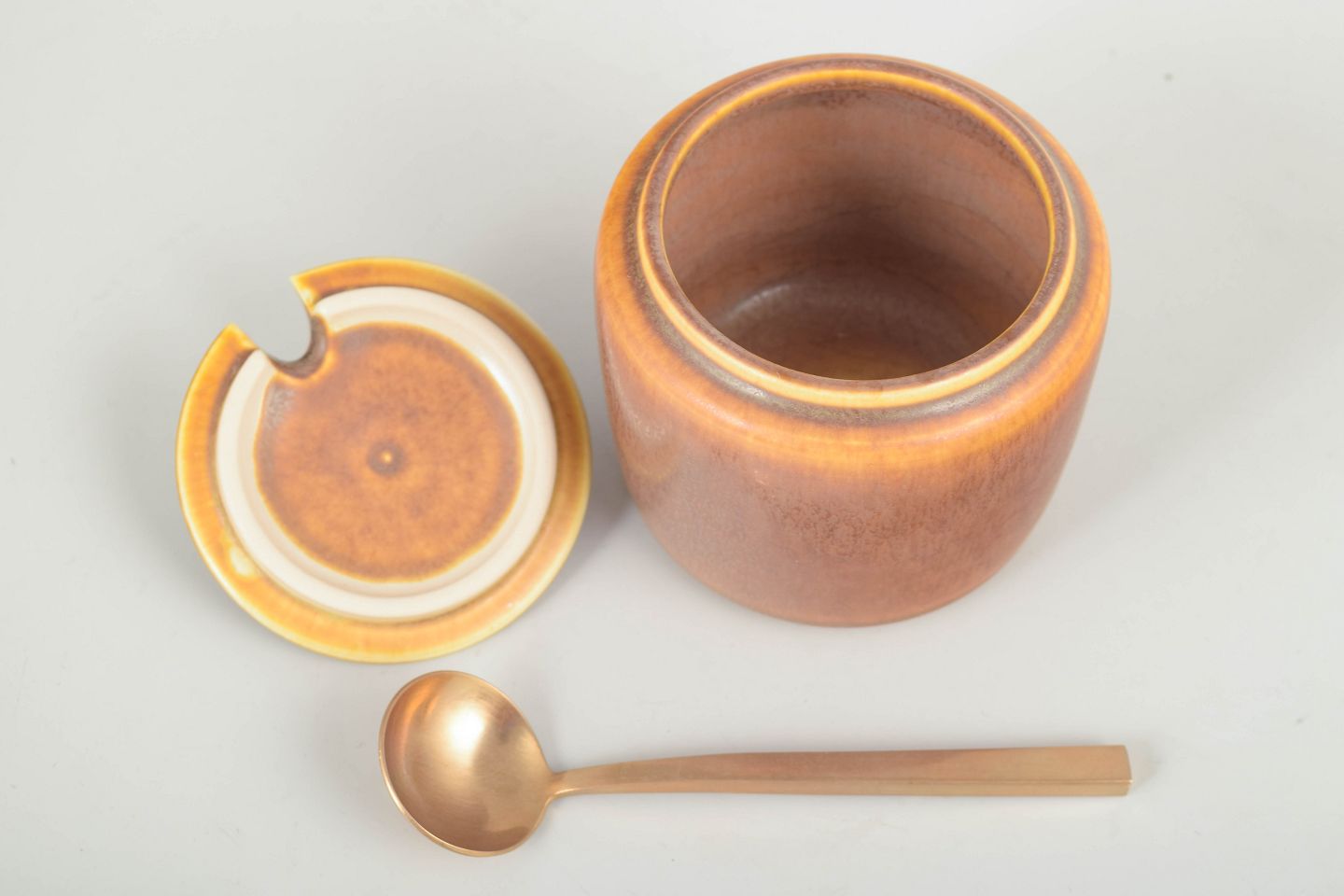 Smukt formgivet syltetøjskrukke i stentøj med karakteristisk harepelsglasur i varme brune toner.