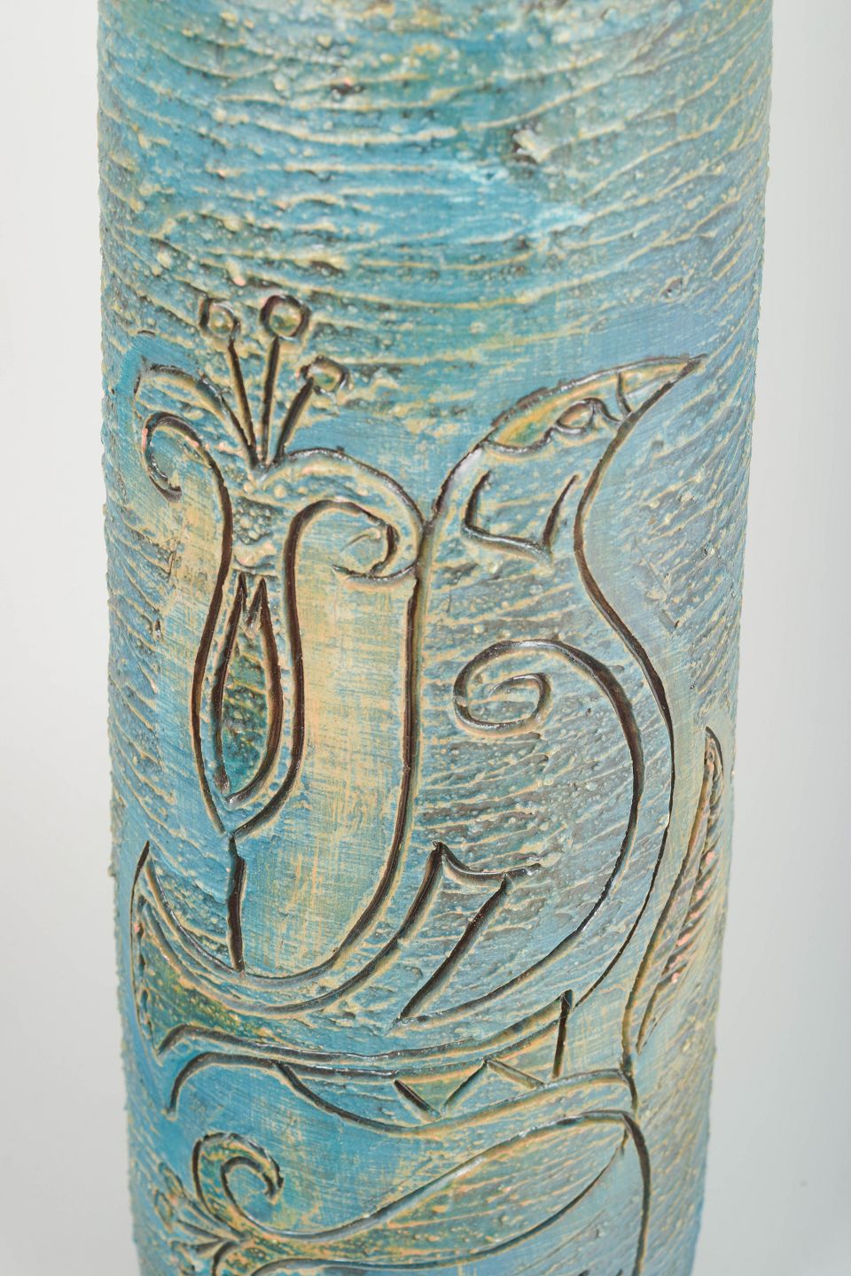 Ekstremt dekorativ og høj cylindrisk gulvvase i chamotte-ler med rillet overflade og karakteristisk inciseret dekoration af stiliseret fugl og blomster. Glasur i blå, grønne og sandfarvede nuancer.