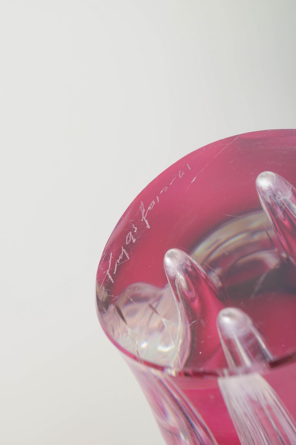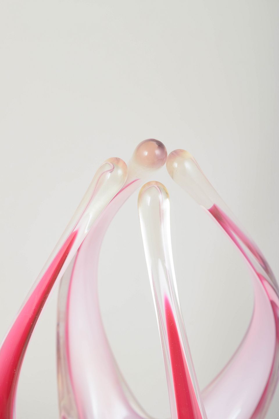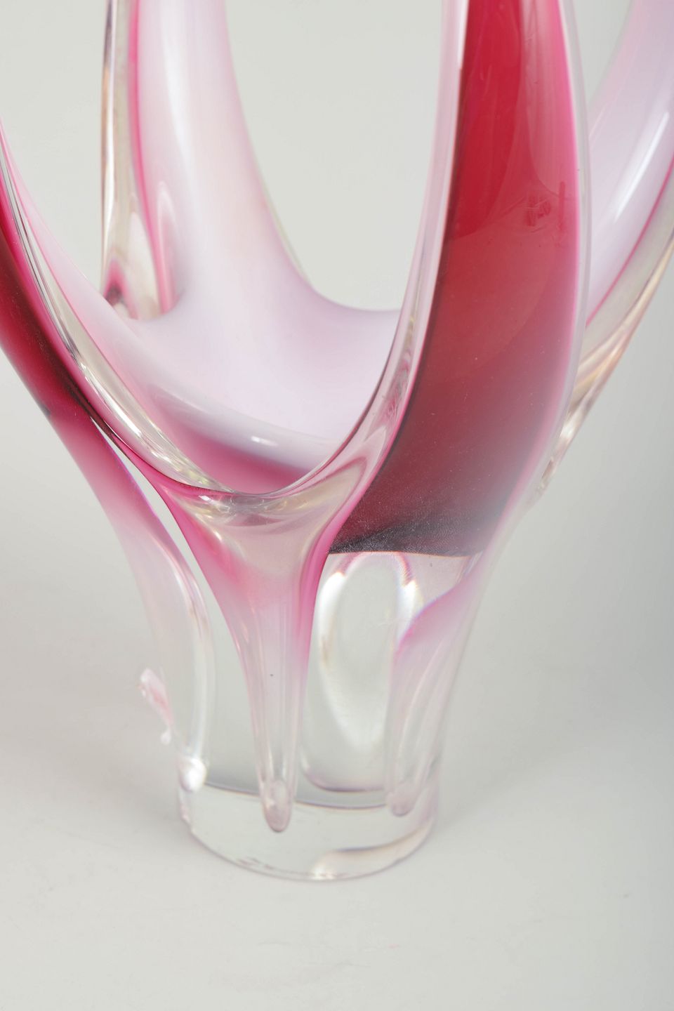 Imponerende og skulpturel Coquille-vase i klart glas med lag i dyb rosa, rubinrød og hvid. Mundblæst, høj og flammeformet silhuet — en af seriens mest monumentale variationer.
